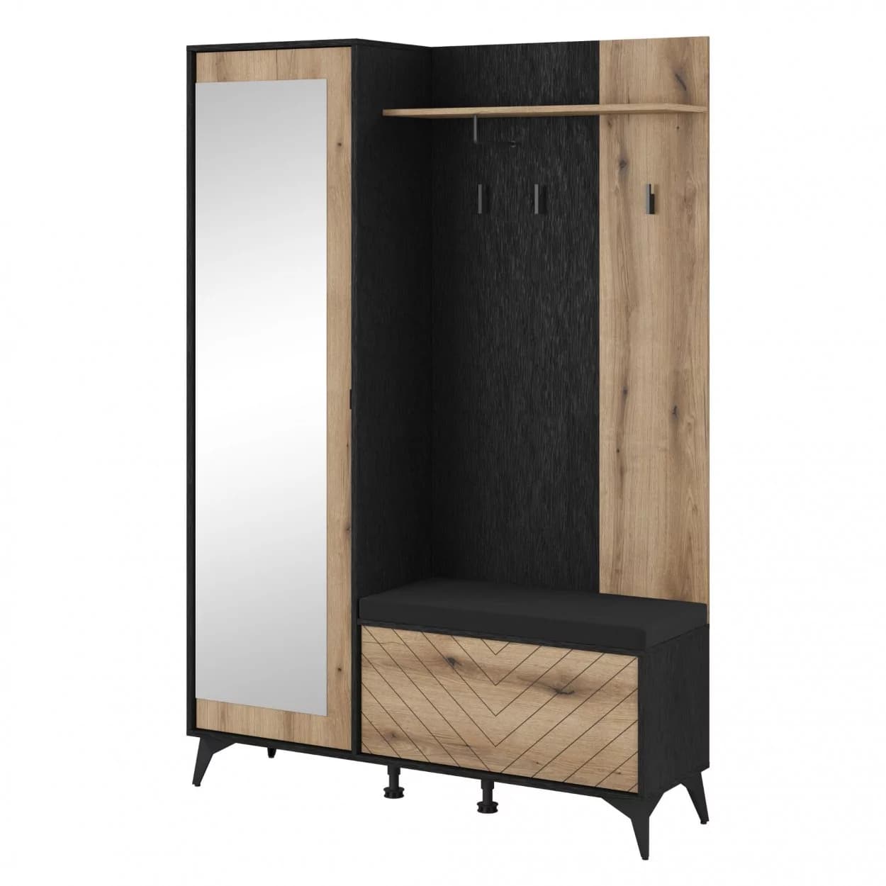 Garderoba KELLY z frezowanym frontem w jodełkę i tapicerowanym siedziskiem to praktyczny i elegancki mebel do przedpokoju, oferujący funkcjonalność oraz nowoczesny design.