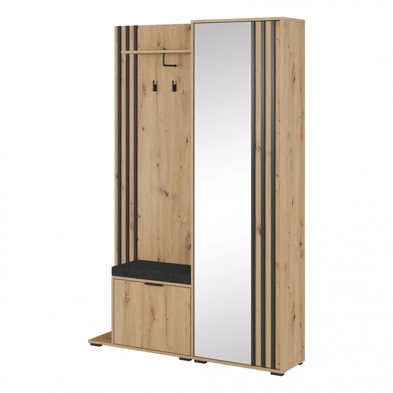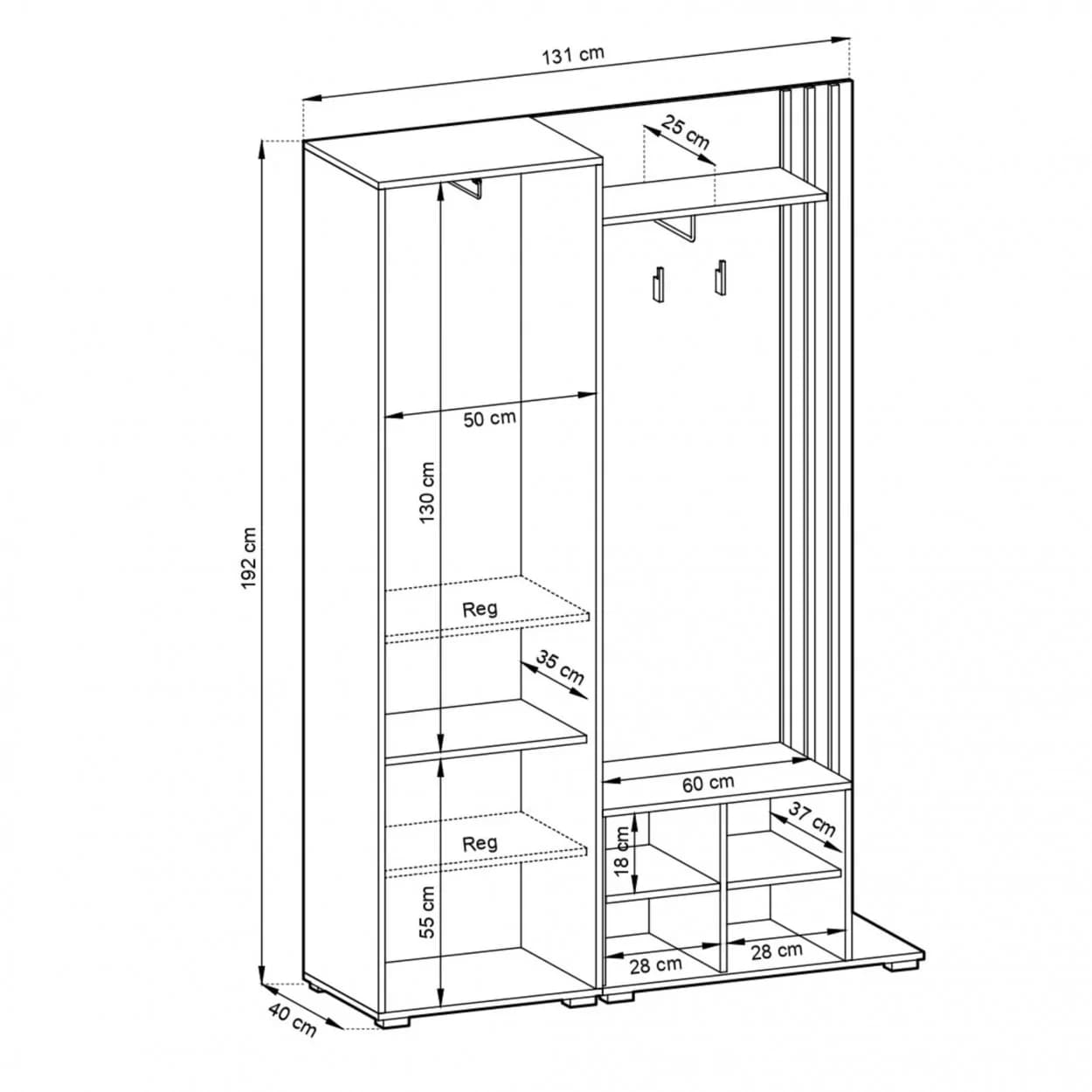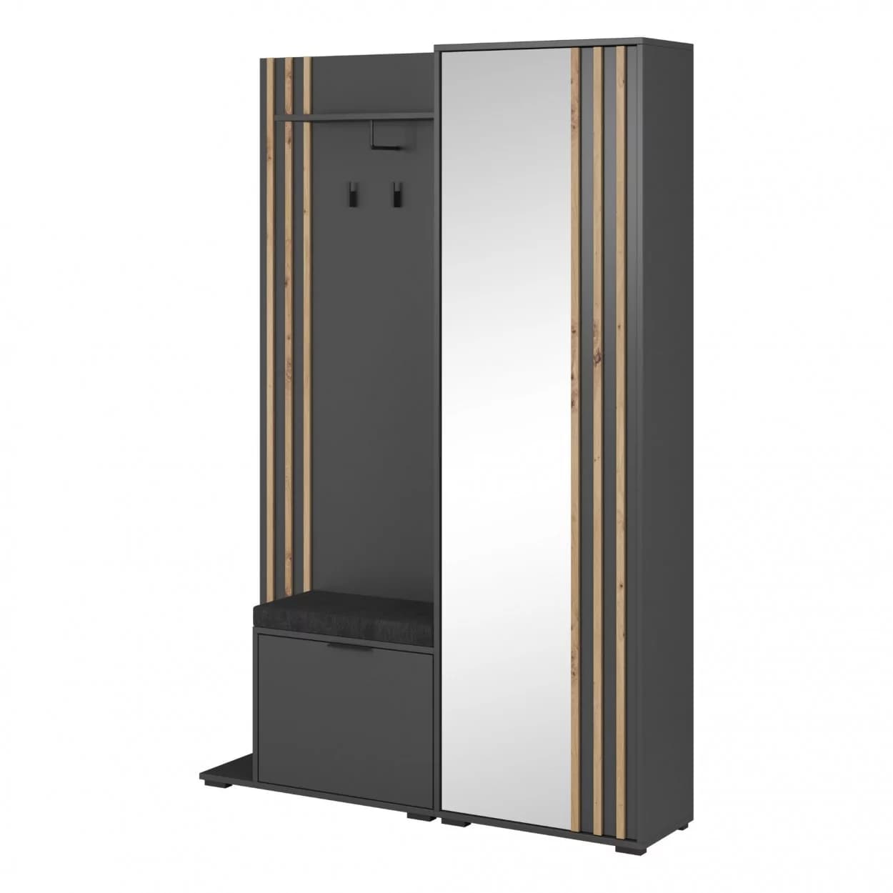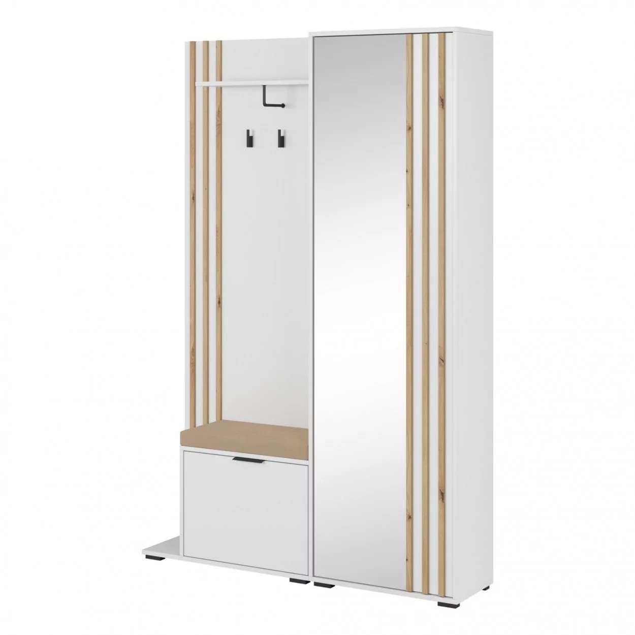 Garderoba NELI to idealne rozwiązanie do przechowywania ubrań i obuwia. Wyposażona w szafkę na buty, szafę z lustrem, wieszakami i półką, oferuje dużo miejsca na porządek w Twoim wnętrzu. Dodatkowo, możliwość wyboru montażu siedziska po lewej lub prawej stronie sprawia, że jest w pełni dostosowana do Twoich potrzeb.