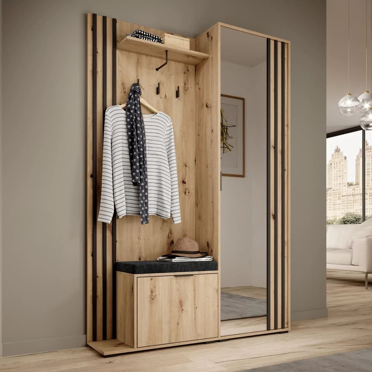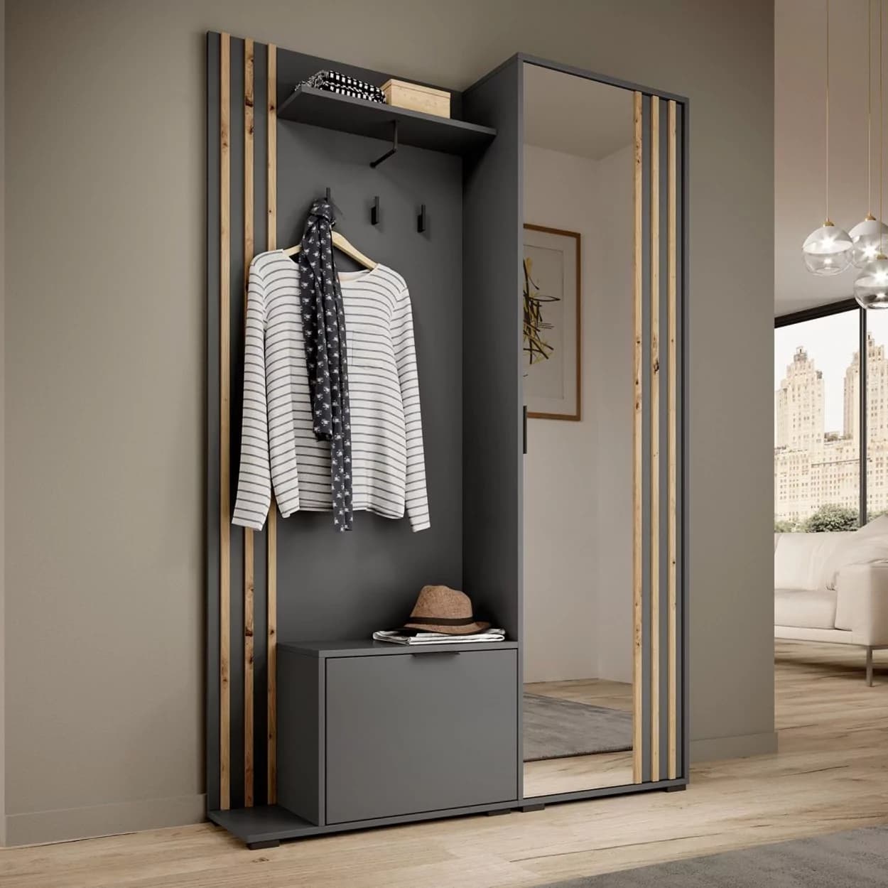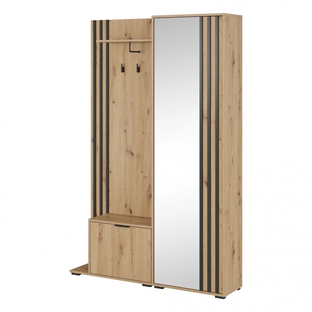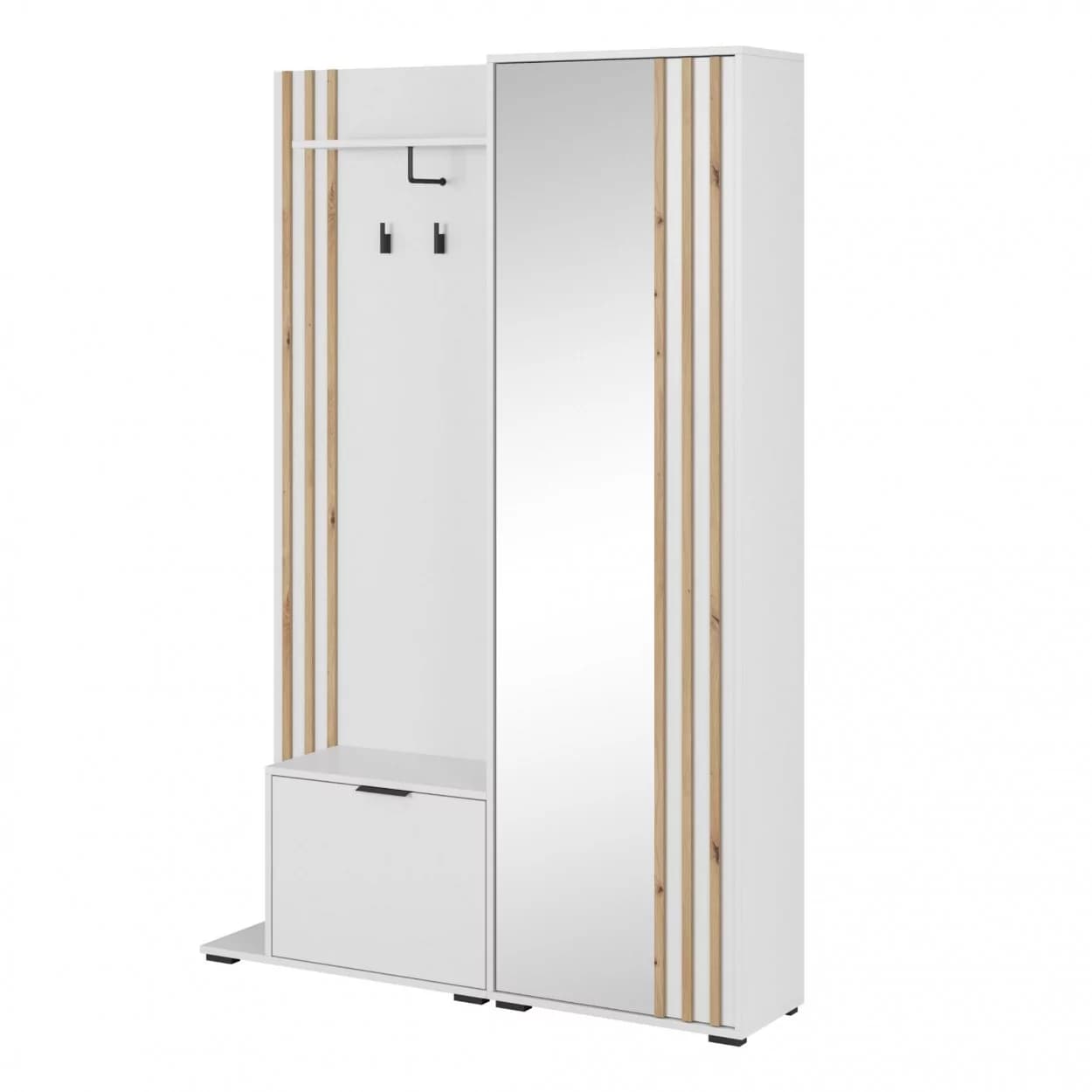 Garderoba NELI to idealne rozwiązanie do przechowywania ubrań i obuwia. Wyposażona w szafkę na buty, szafę z lustrem, wieszakami i półką, oferuje dużo miejsca na porządek w Twoim wnętrzu. Dodatkowo, możliwość wyboru montażu siedziska po lewej lub prawej stronie sprawia, że jest w pełni dostosowana do Twoich potrzeb.