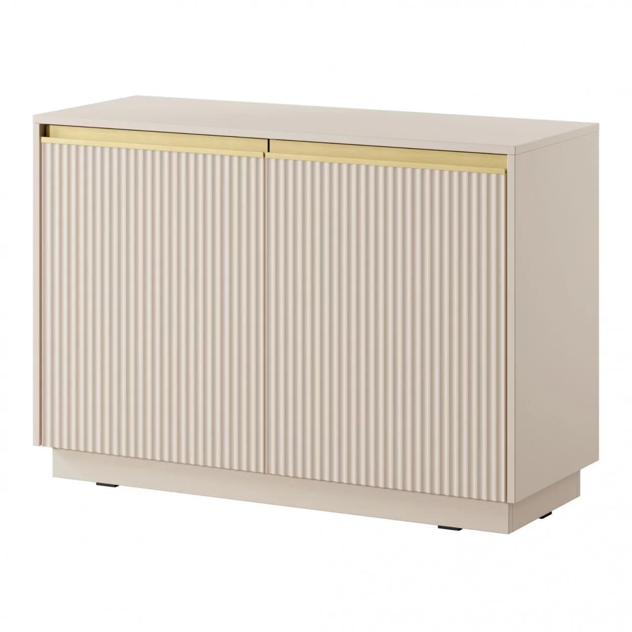 Nowoczesna komoda dwudrzwiowa z frezowanym frontem i złotymi uchwytami listwowymi. Wyposażona w półki i cichy domyk, łączy funkcjonalność z elegancją.