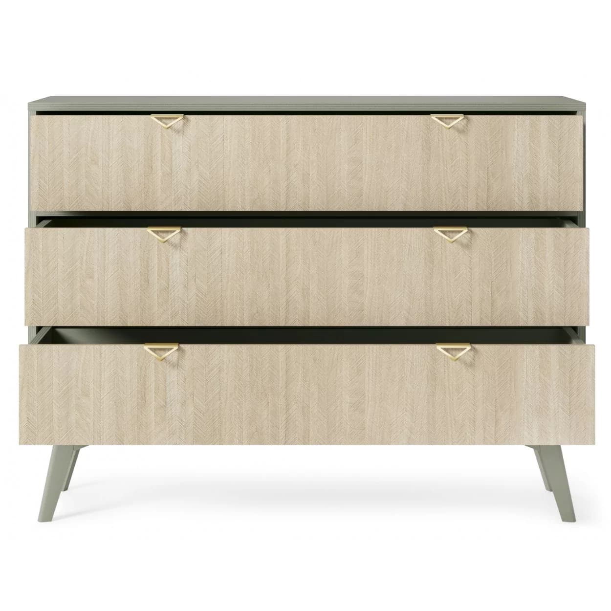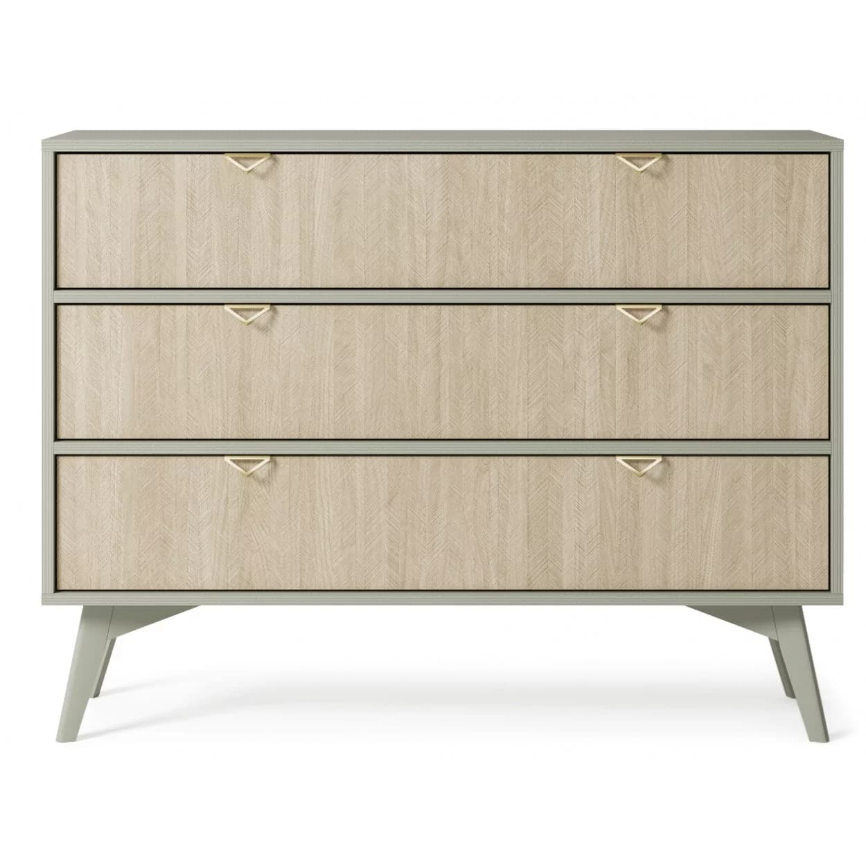 Komoda FLOSSY w eukaliptusowym odcieniu z złotymi uchwytami i wzorem jodełki to stylowy i funkcjonalny mebel, który doda wnętrzu wyjątkowego charakteru.