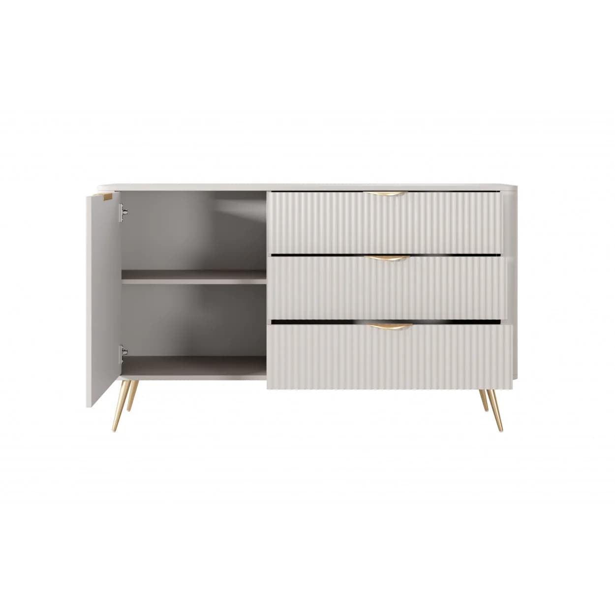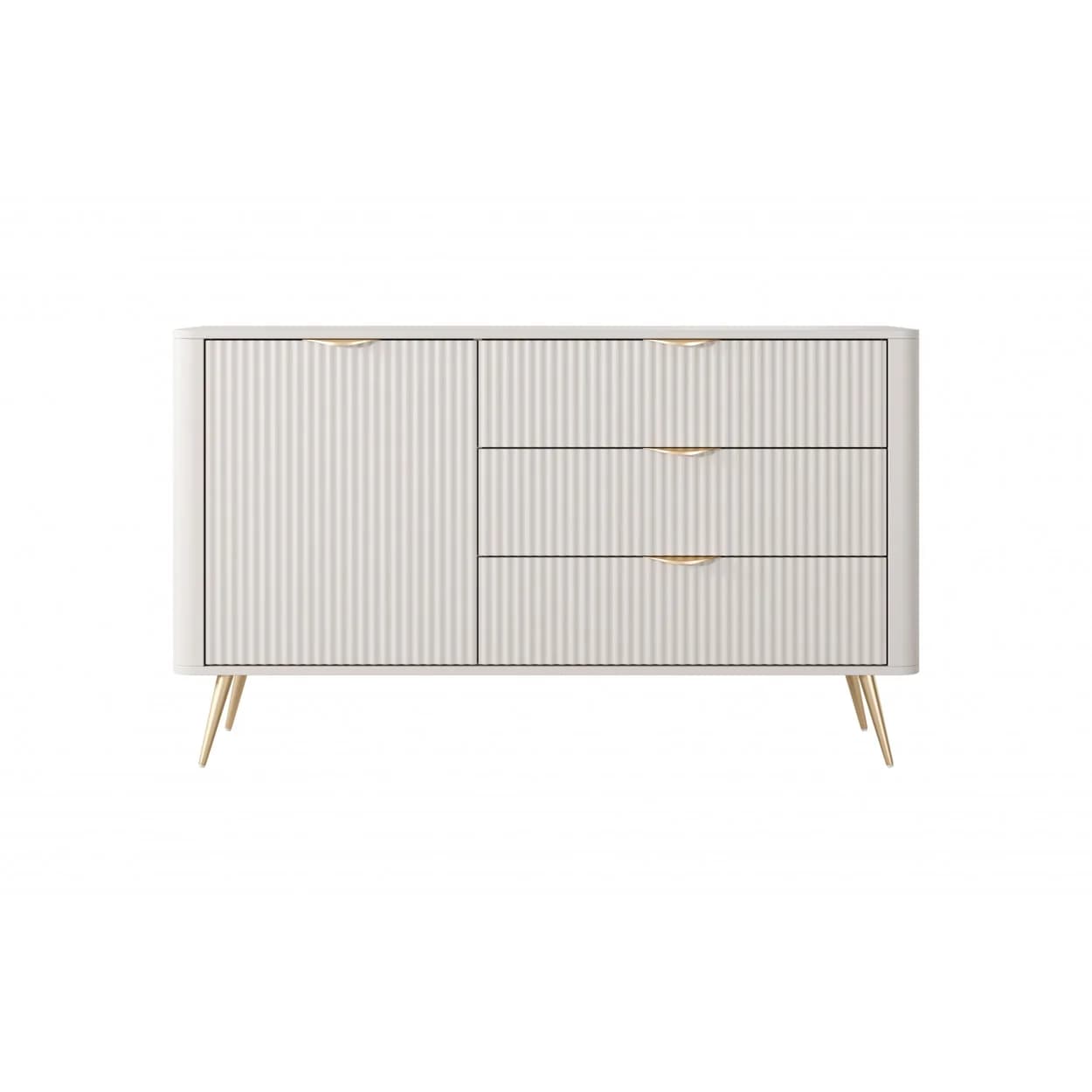 Komoda GOLDEN NUDE to eleganckie połączenie beżowej kolorystyki, ryflowanych frontów i złotych detali – idealna do wnętrz glamour i nowoczesnych.