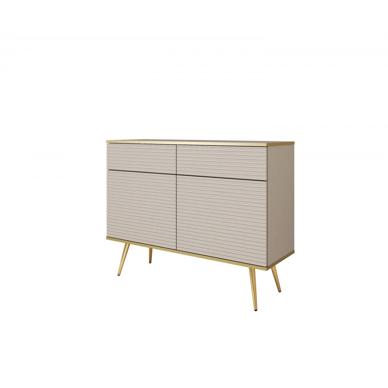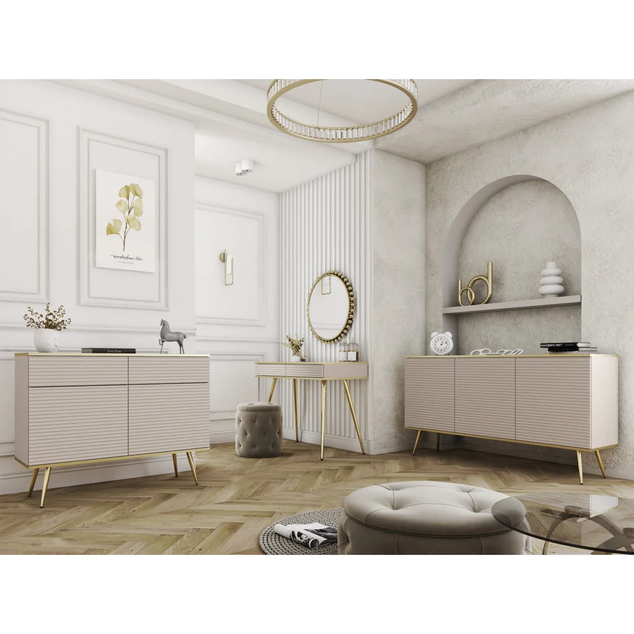 Komoda Mavi z szufladami to elegancki mebel w nowoczesnym stylu glamour. Ryflowany front, złote akcenty i minimalistyczna forma sprawiają, że będzie ozdobą każdego wnętrza.