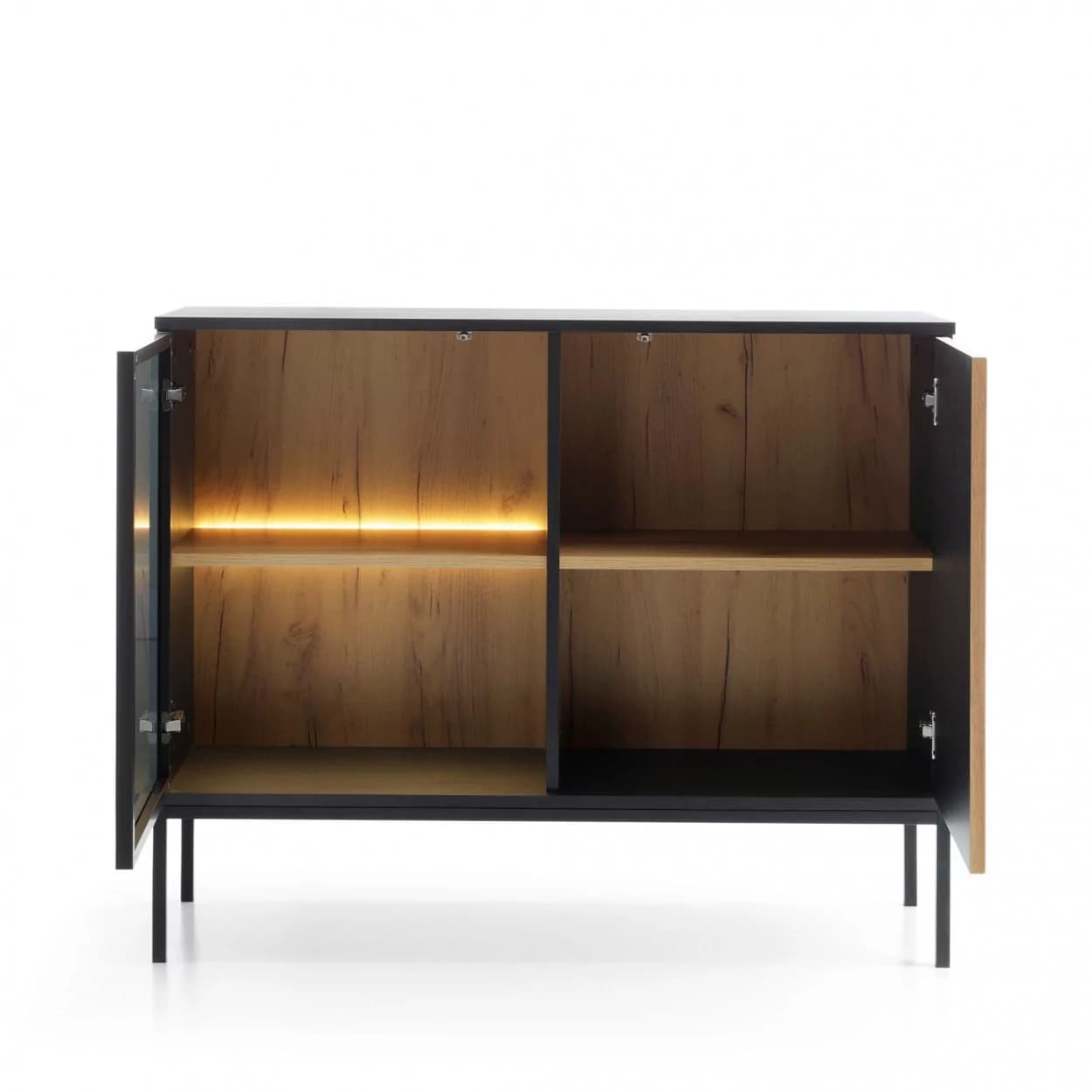 Komoda SORENTO w eleganckiej czerni z oświetleniem LED i lamelami 3D w odcieniu dębu wotan to nowoczesny i efektowny element każdego wnętrza. Osadzona na metalowych nóżkach, łączy trwałość z wyjątkowym designem, zapewniając także praktyczne rozwiązania do przechowywania.