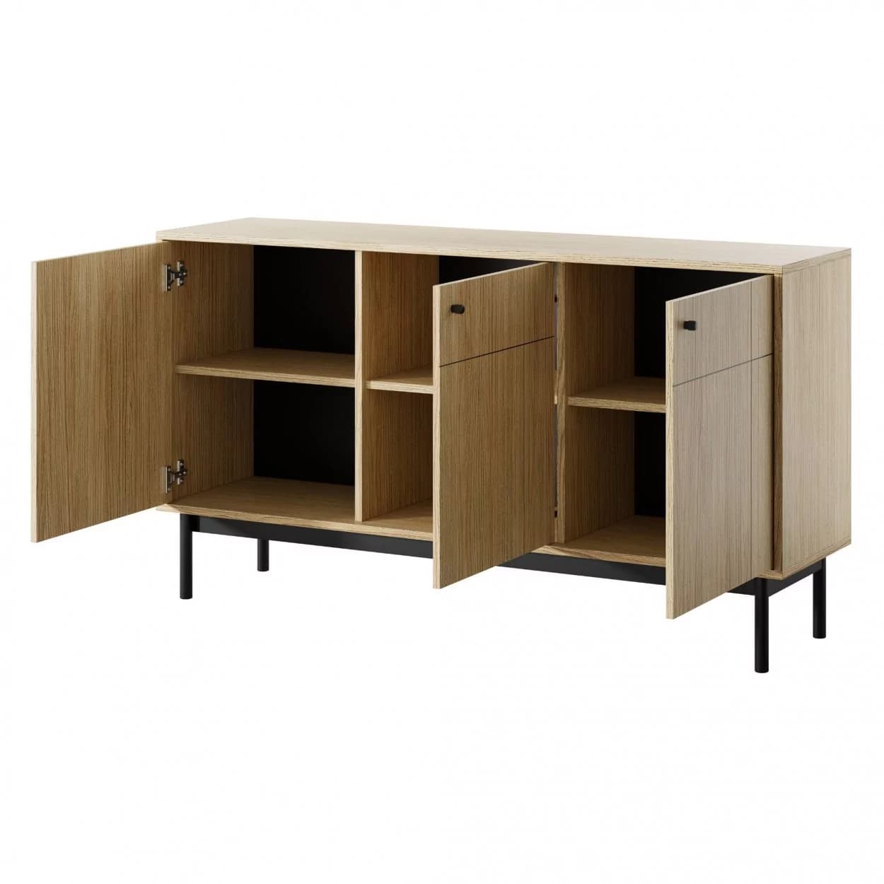 Komoda FRAME w kolorze Dąb Linea łączy stylowy wygląd z funkcjonalnością. Czarne uchwyty i frezowany front dodają jej nowoczesnego charakteru.