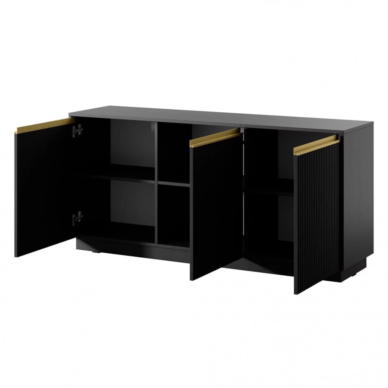Komoda SHINE w kolorze czarnym to połączenie nowoczesnego designu i funkcjonalności. Wyposażona w frezowane fronty, złote uchwyty i trzy pojemne półki, doskonale sprawdzi się w każdym wnętrzu.