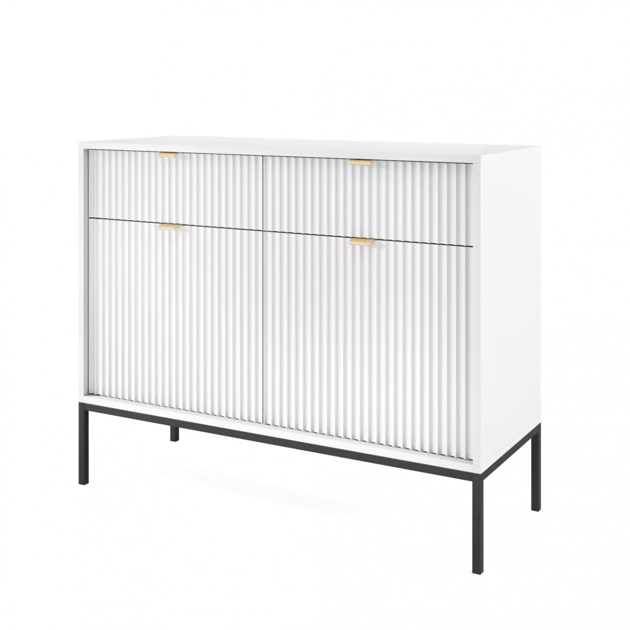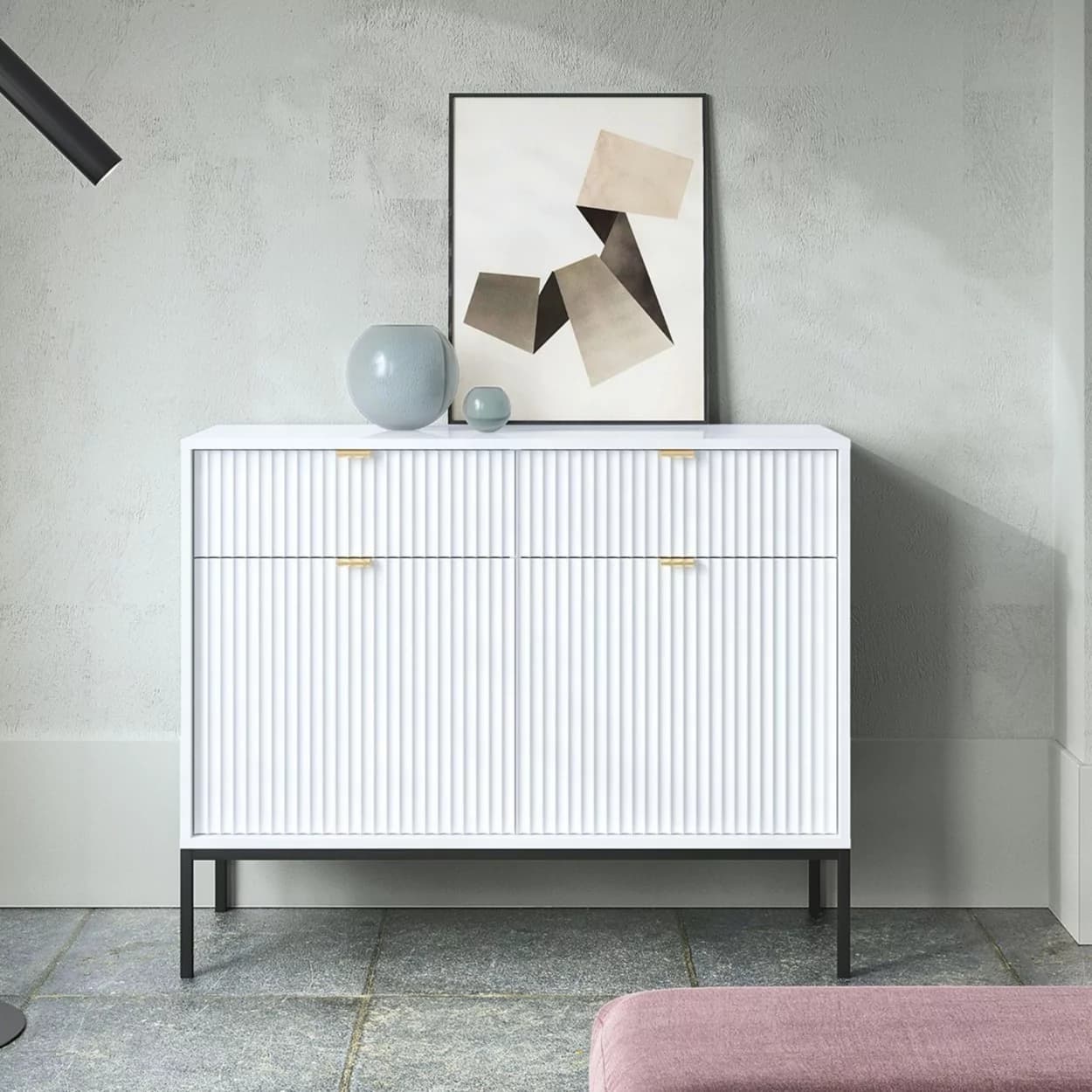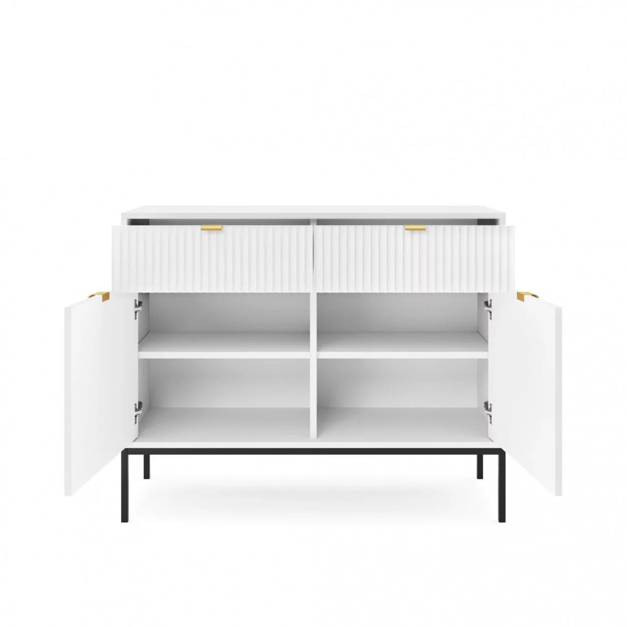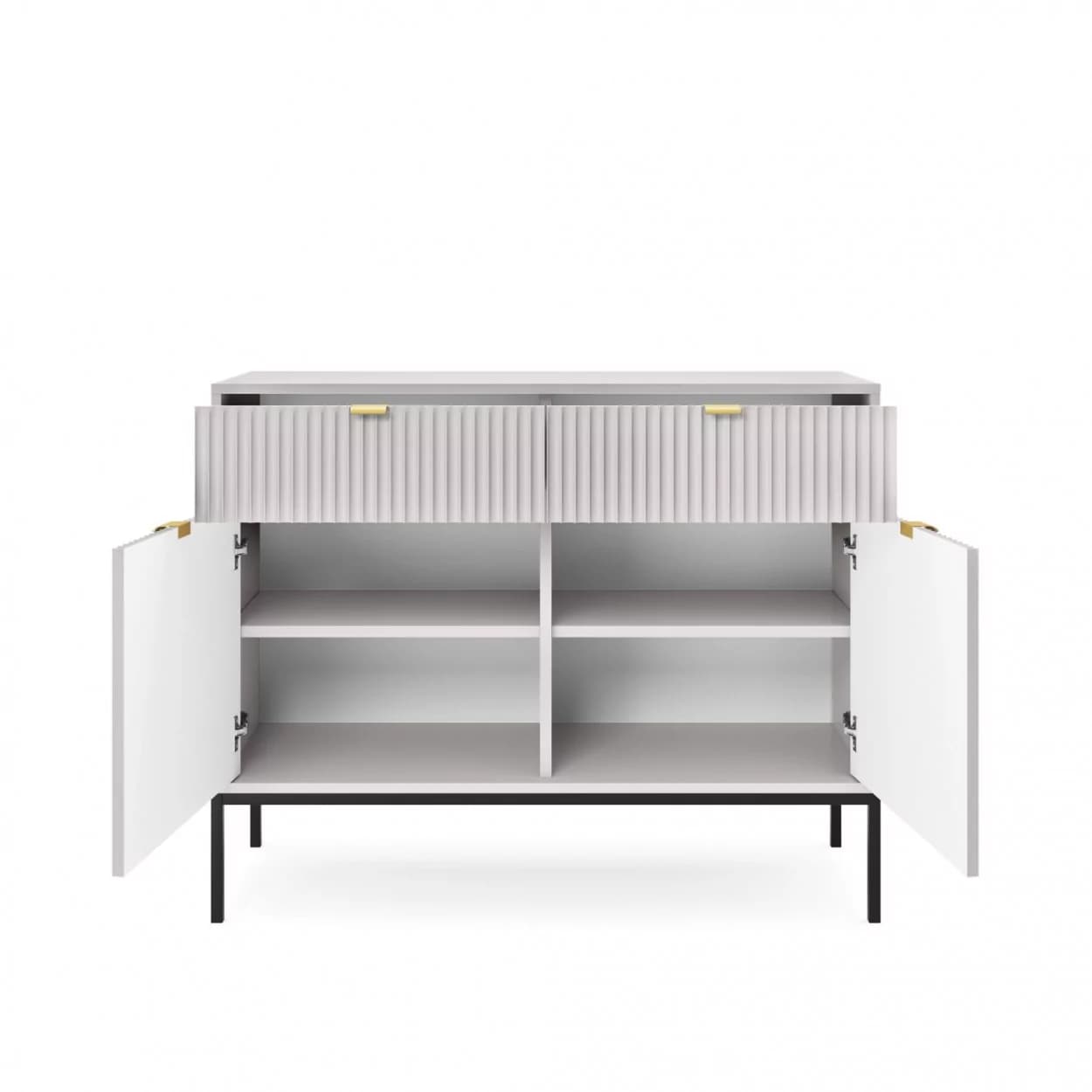 Nowoczesna komoda z ryflowanymi frontami i metalowymi nóżkami. Pojemne szuflady i szafki zapewniają funkcjonalność, a stylowy design uzupełnia każde wnętrze.