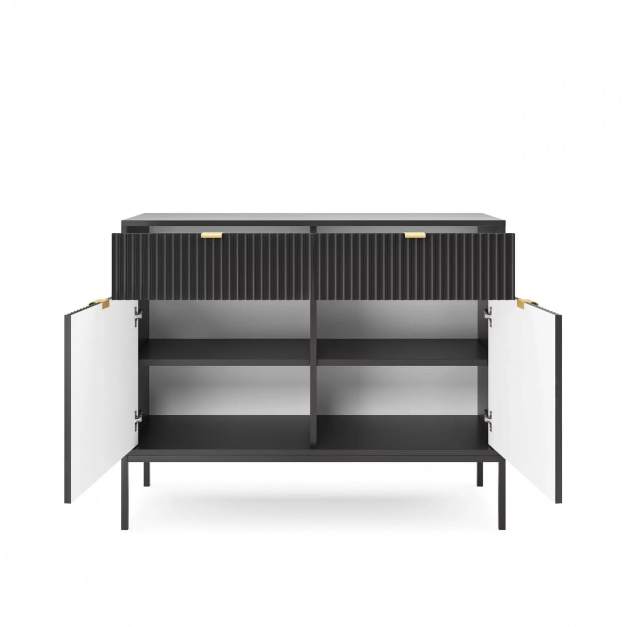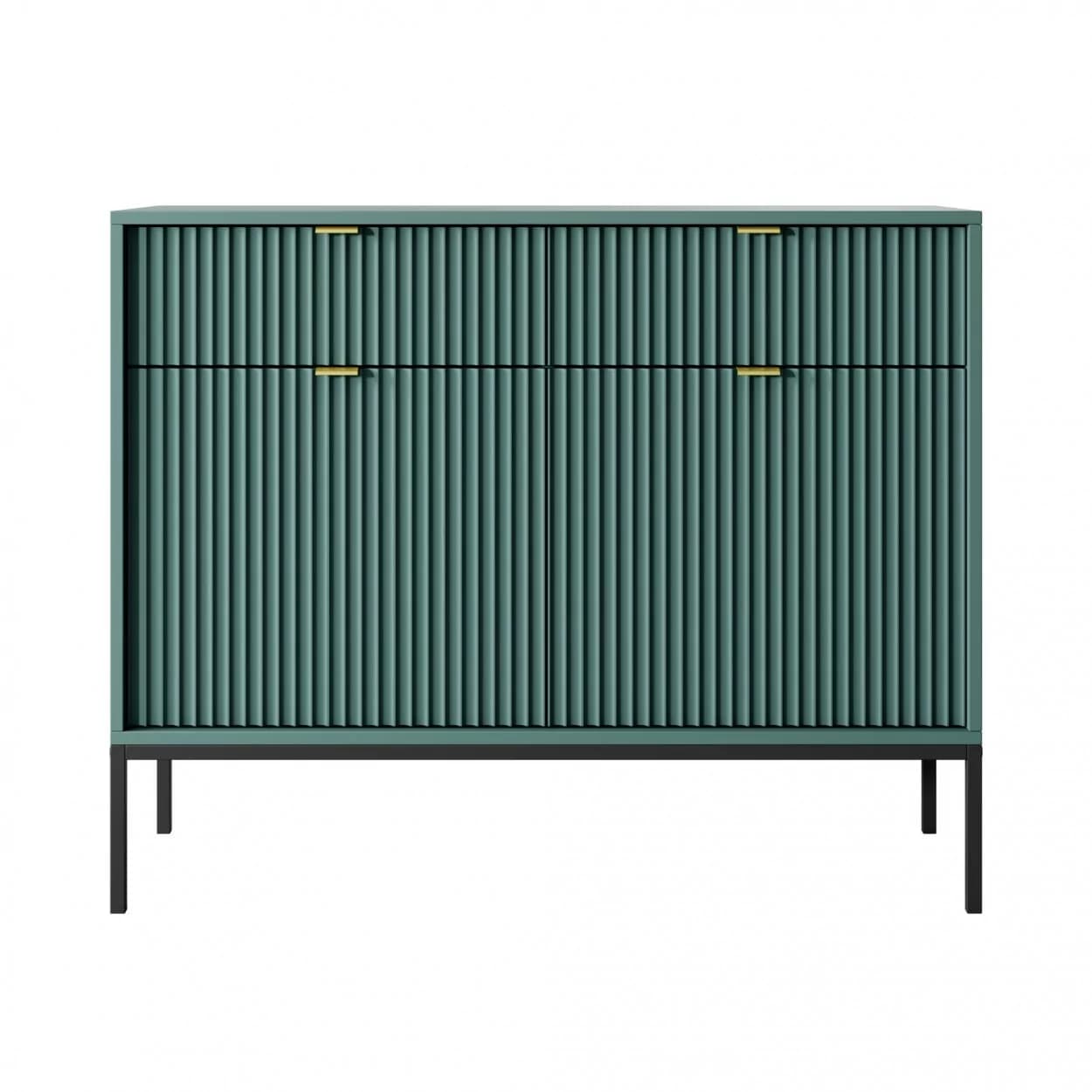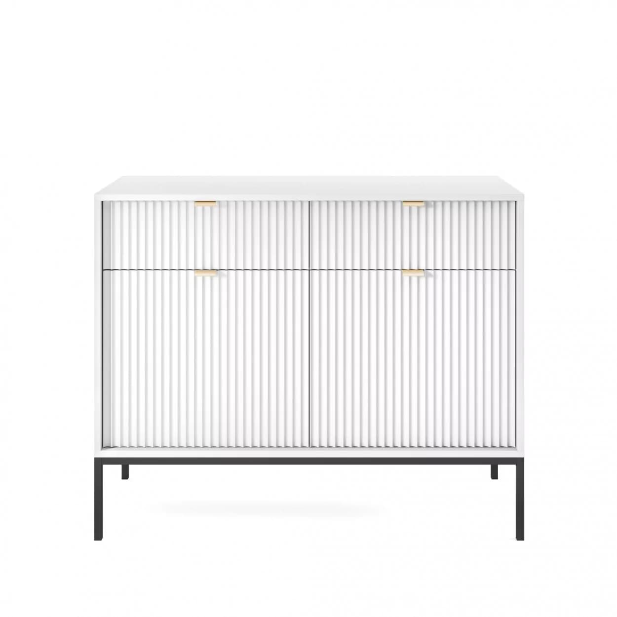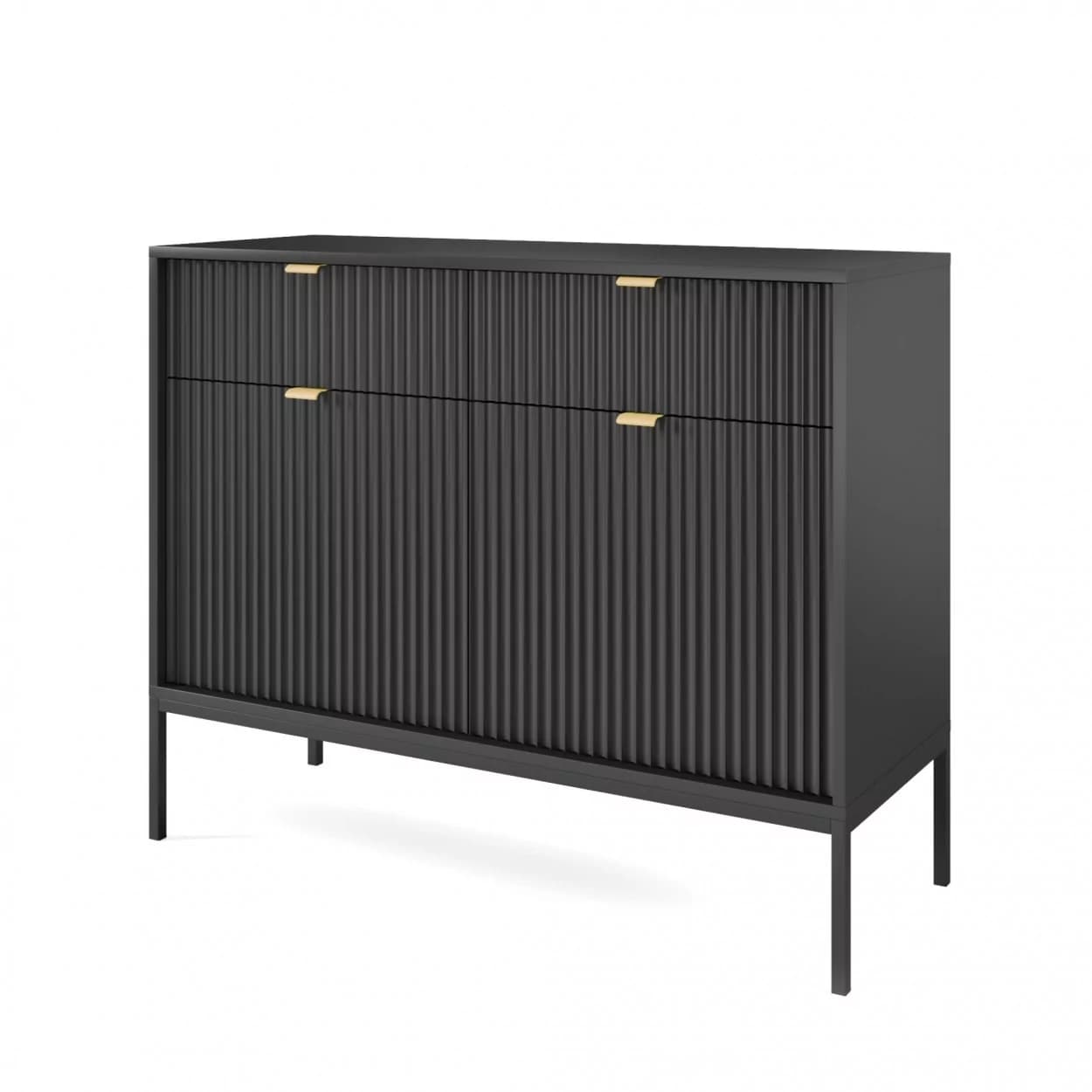 Nowoczesna komoda z ryflowanymi frontami i metalowymi nóżkami. Pojemne szuflady i szafki zapewniają funkcjonalność, a stylowy design uzupełnia każde wnętrze.