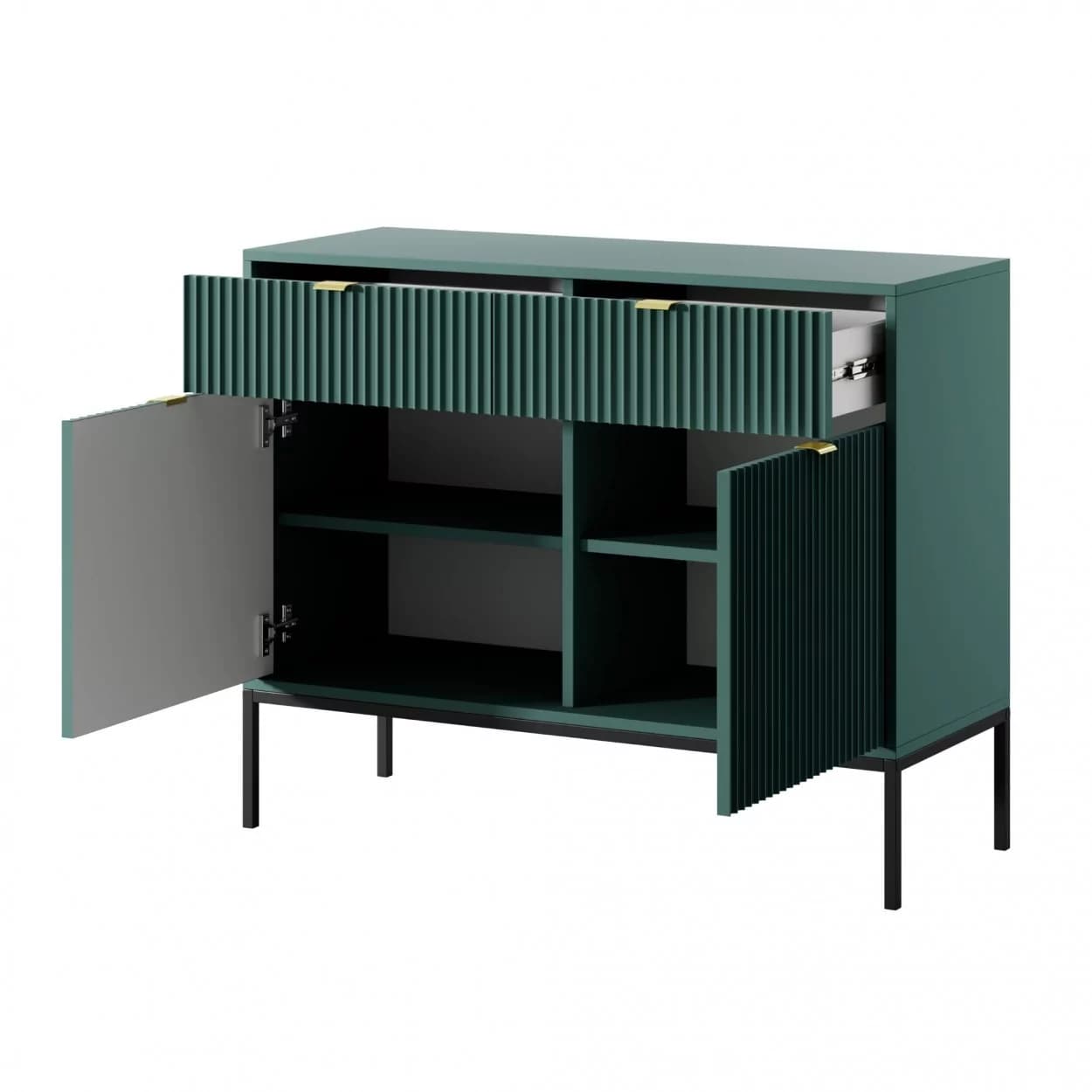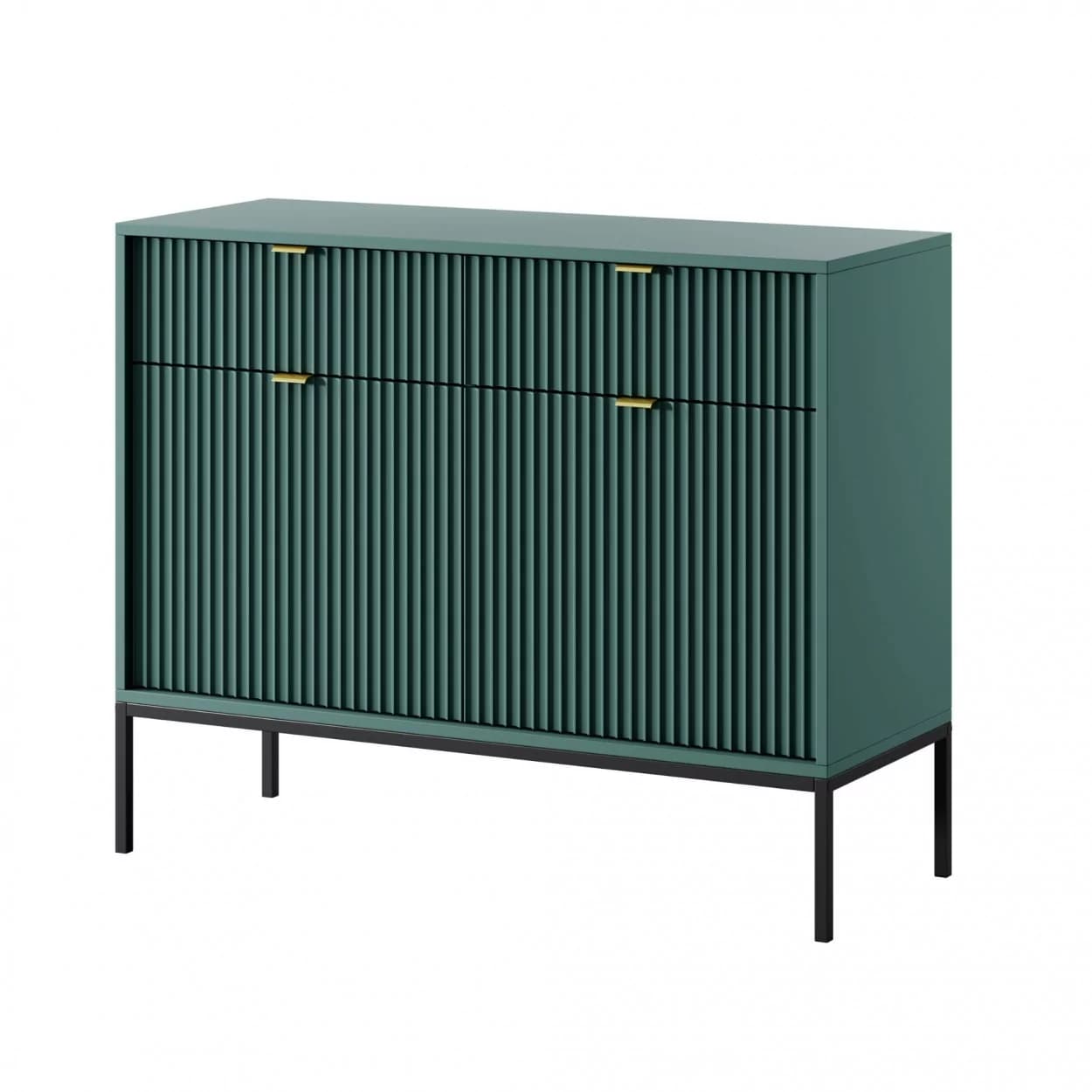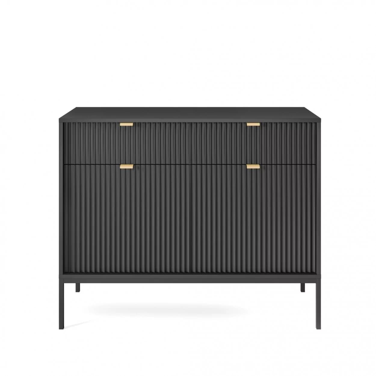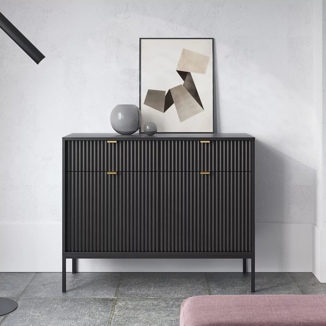 Nowoczesna komoda z ryflowanymi frontami i metalowymi nóżkami. Pojemne szuflady i szafki zapewniają funkcjonalność, a stylowy design uzupełnia każde wnętrze.