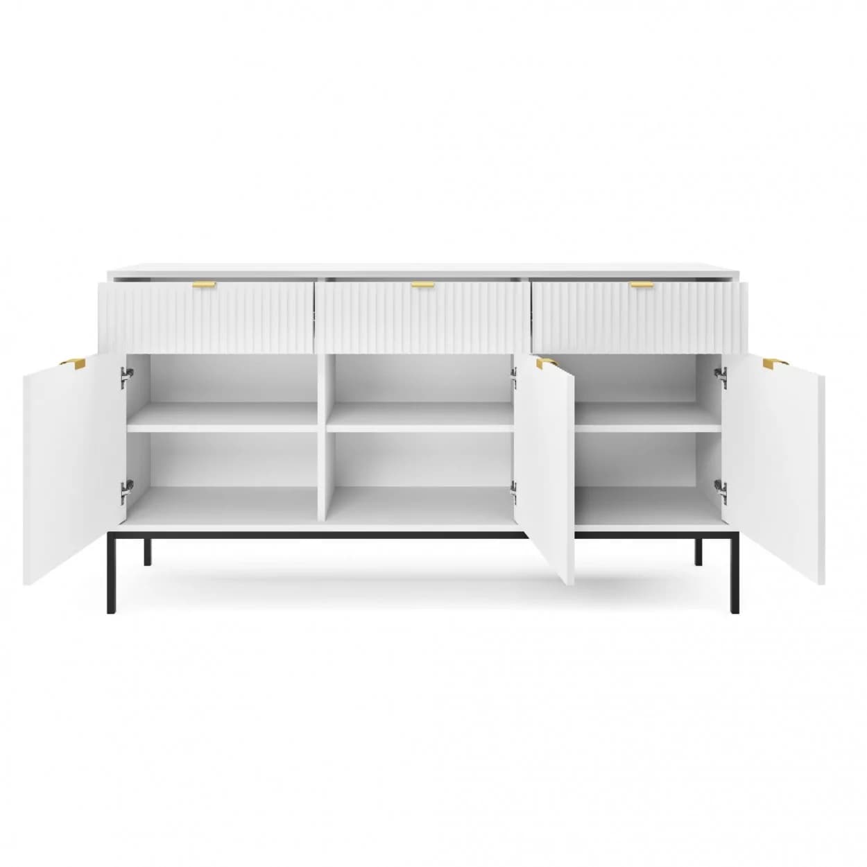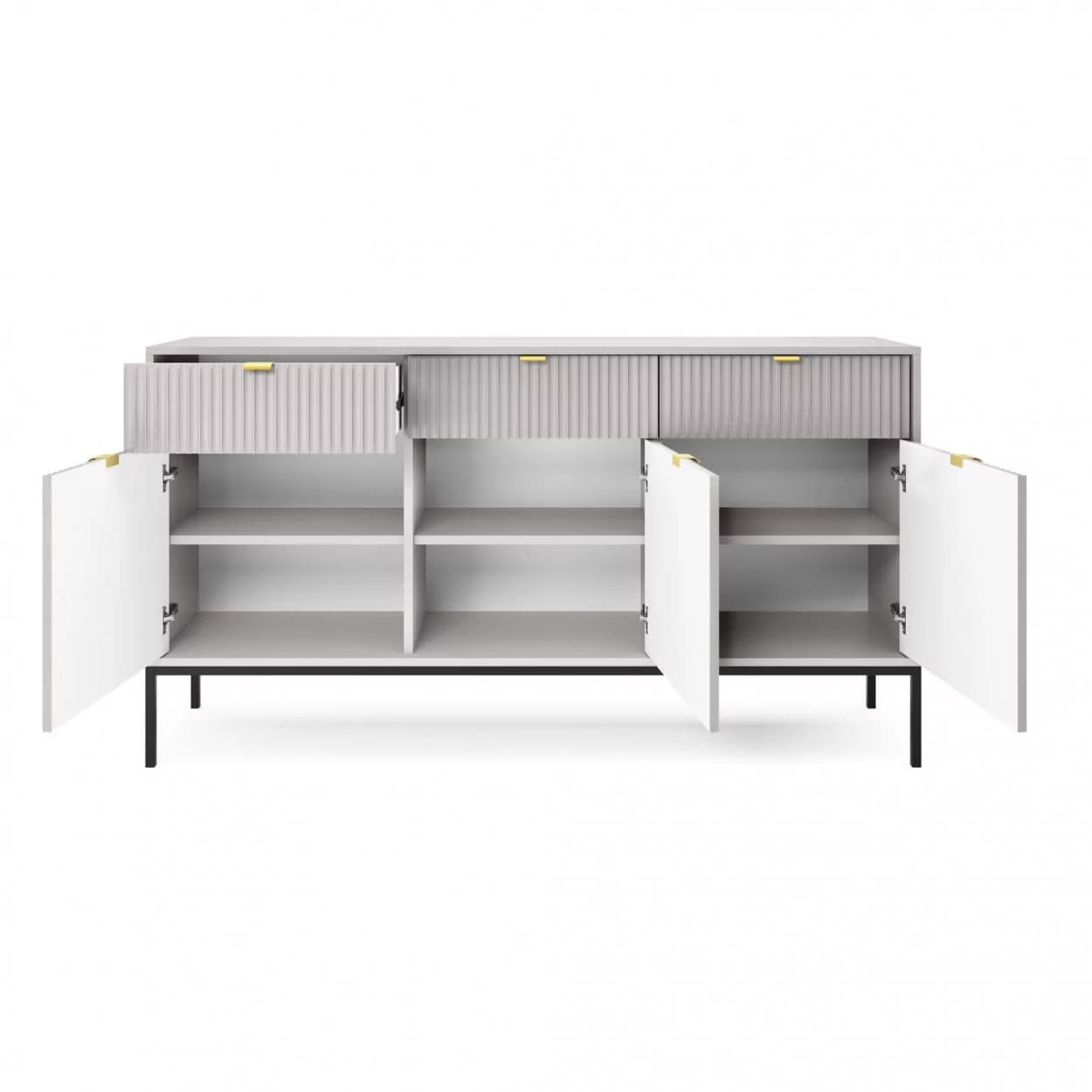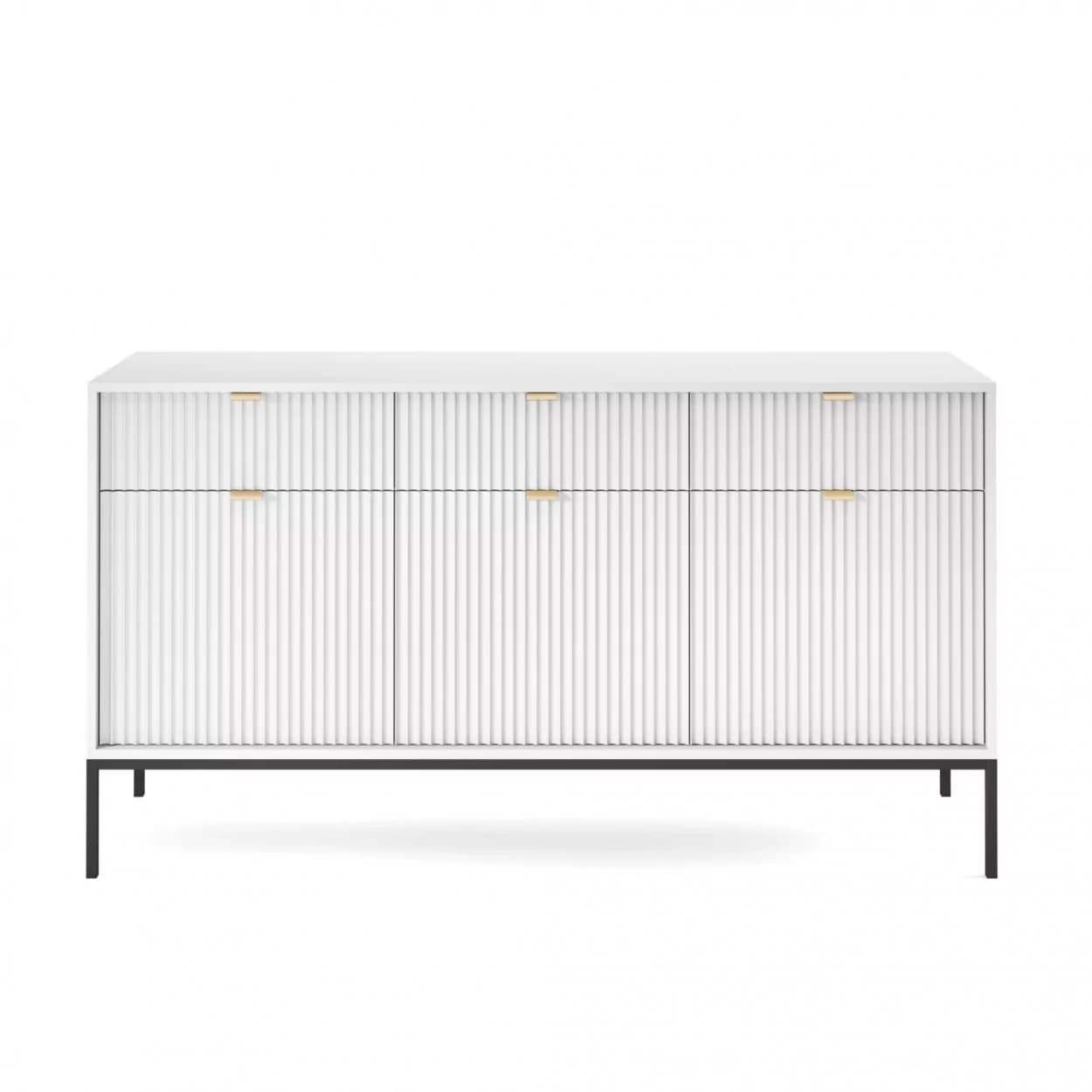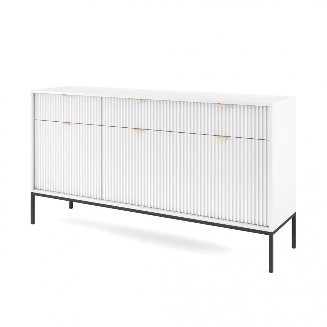Komoda VESTA dostępna w czterech wariantach kolorystycznych wyróżnia się efektownymi ryflowanymi frontami oraz solidnymi metalowymi nóżkami. Wyposażona w trzy pojemne szuflady i szafki, oferuje przestronność i świetną organizację.