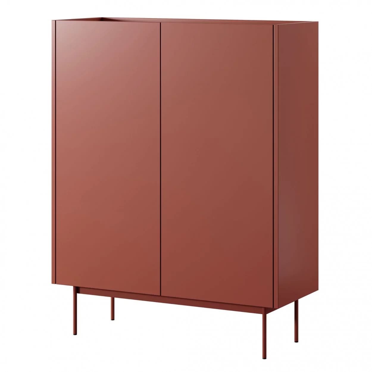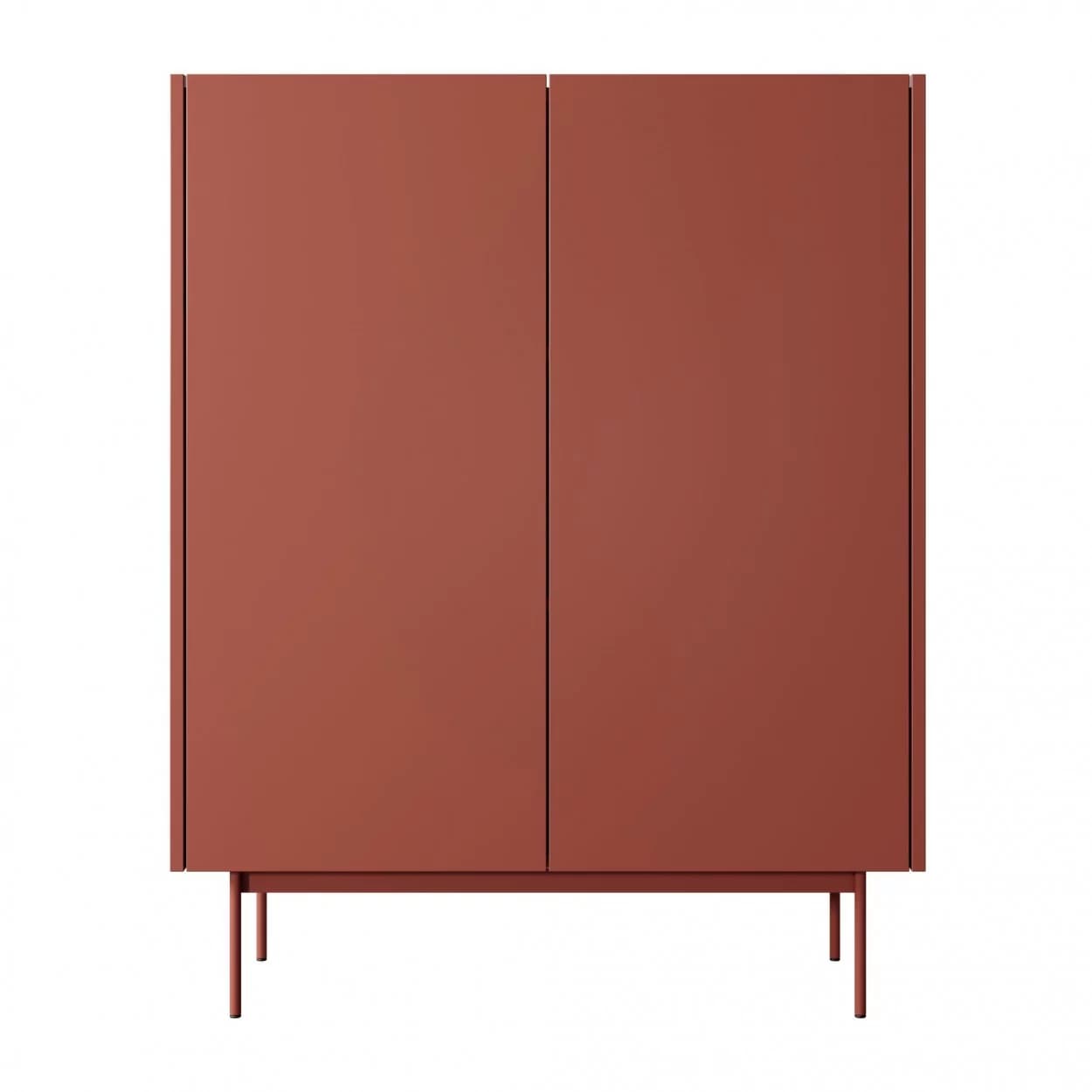 Dwudrzwiowa komoda Lumina to stylowy mebel w kolorze Ceramic Red / Dąb Linea, łączący estetykę z praktycznością. Dzięki bezuchwytowemu systemowi i metalowym nogom dopasowanym do frontu zapewnia minimalistyczny i funkcjonalny wygląd. Świetny wybór do nowoczesnych aranżacji salonu.