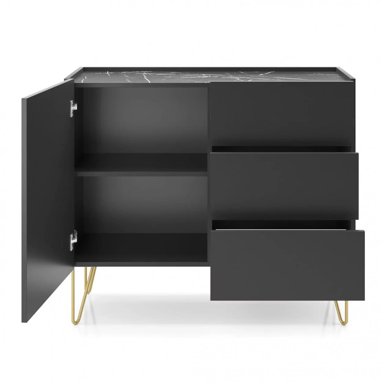 Komoda HILTON to połączenie wyrafinowanego designu i funkcjonalności. Złote gięte nogi, marmurowy blat i system push to open nadają jej elegancki charakter. Idealna do stylowych, nowoczesnych wnętrz.
