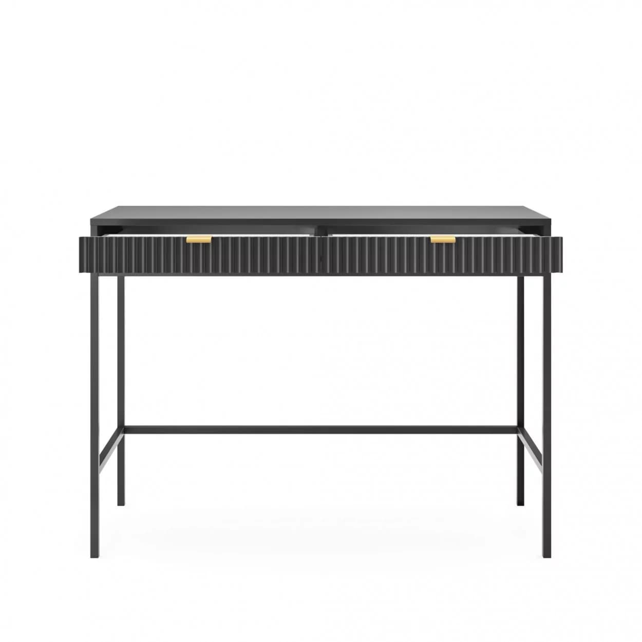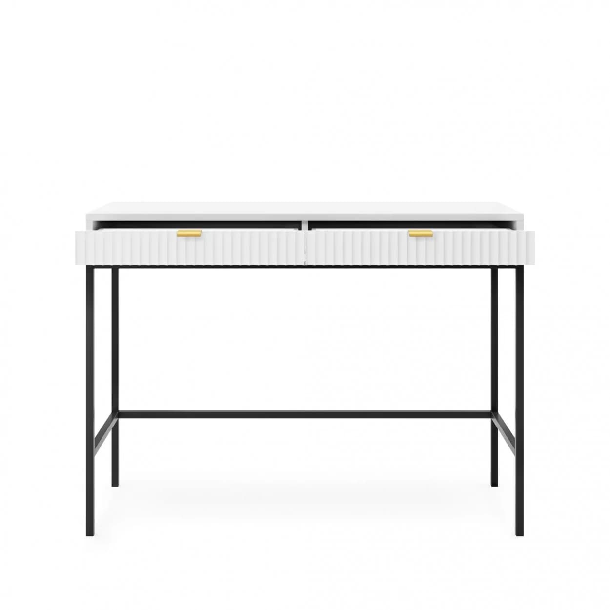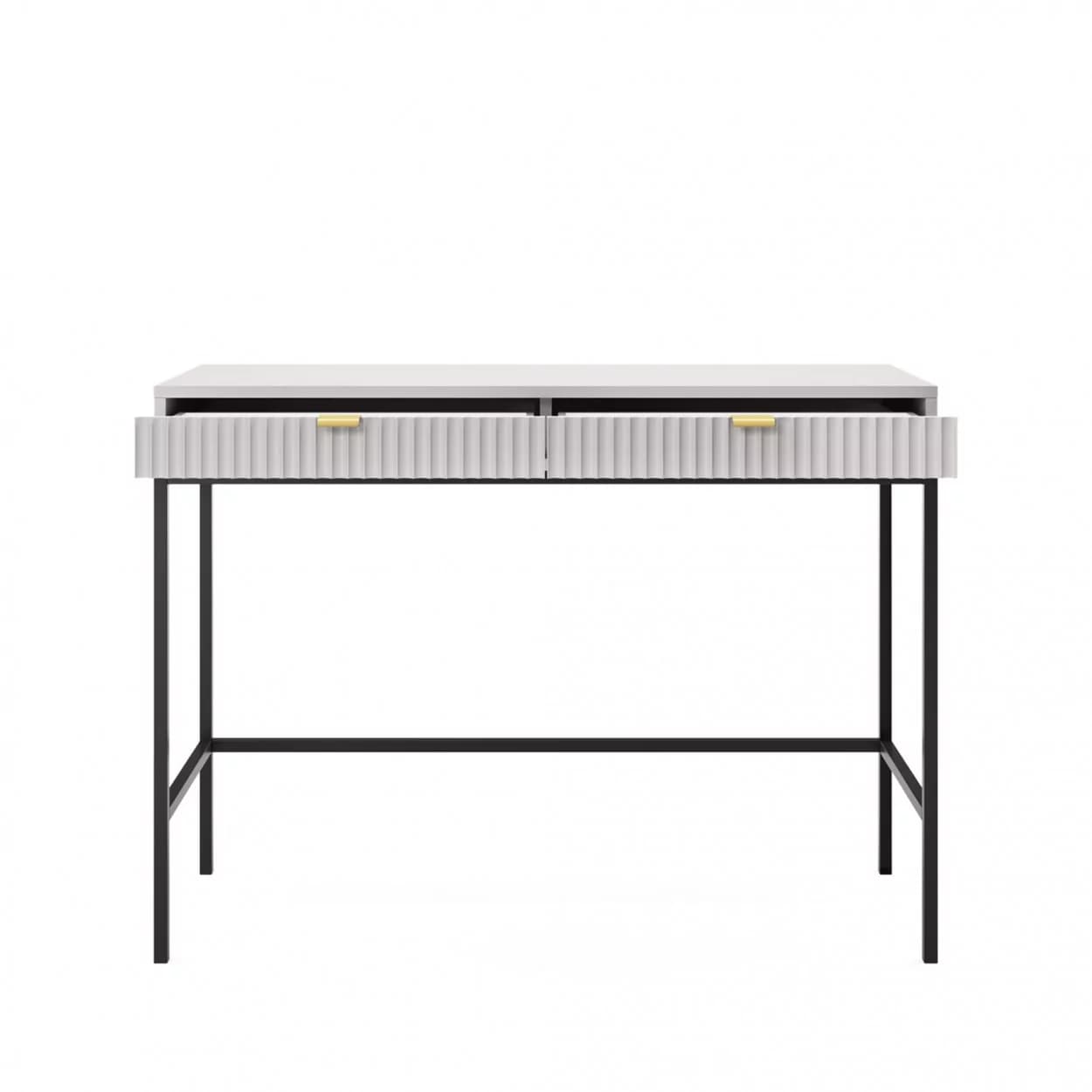 Konsola VESTA dostępna w czterech wariantach kolorystycznych wyróżnia się ryflowanymi frontami i solidnym metalowym stelażem. Wyposażona w dwie pojemne szuflady, łączy elegancję z funkcjonalnością.
