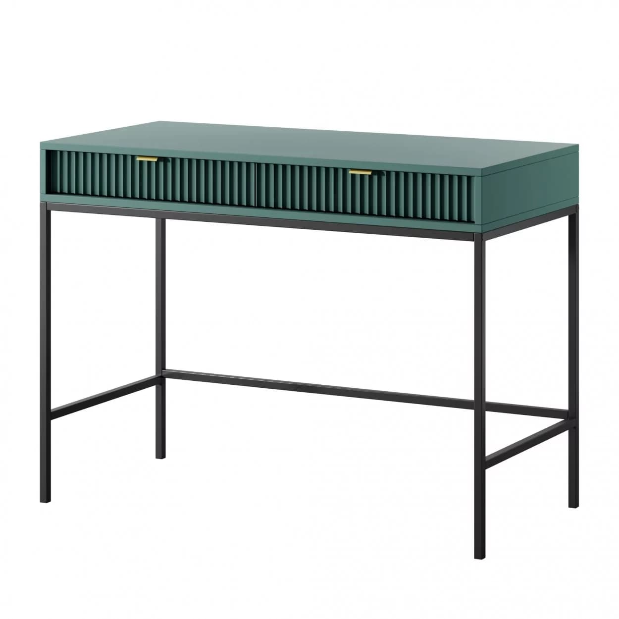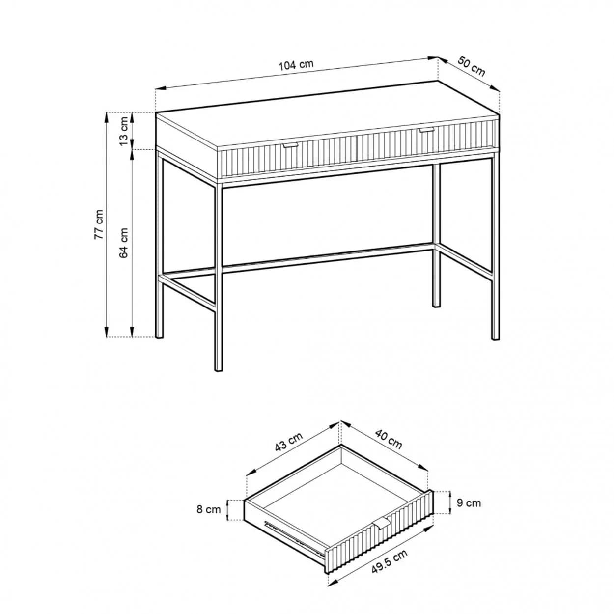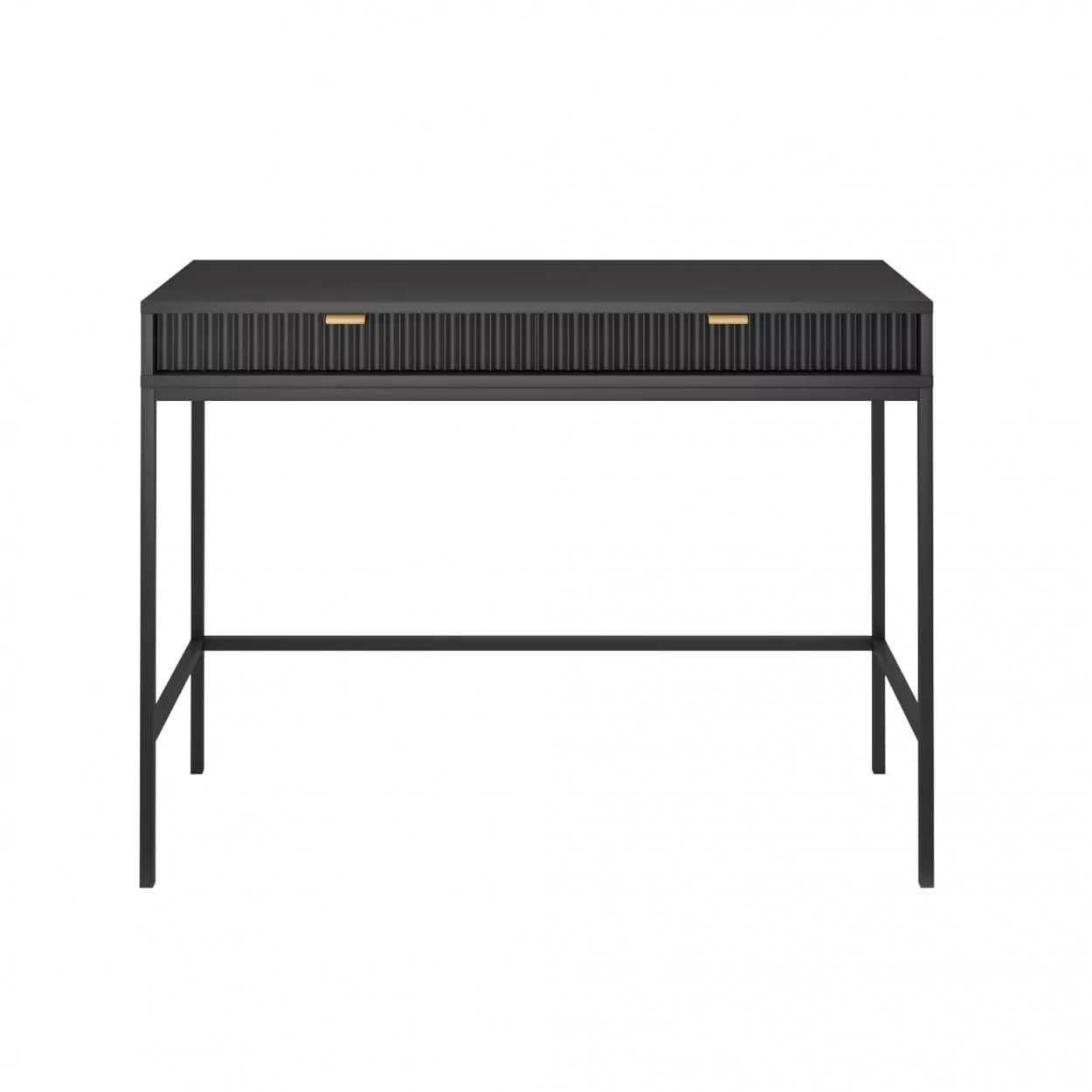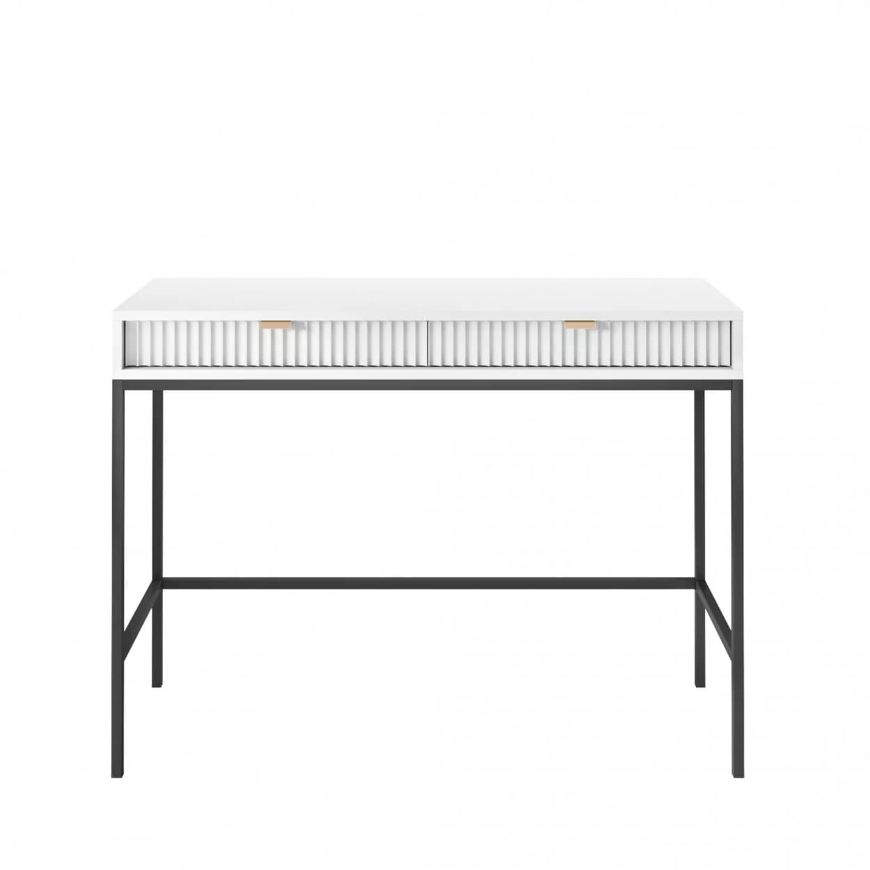 Konsola VESTA dostępna w czterech wariantach kolorystycznych wyróżnia się ryflowanymi frontami i solidnym metalowym stelażem. Wyposażona w dwie pojemne szuflady, łączy elegancję z funkcjonalnością.