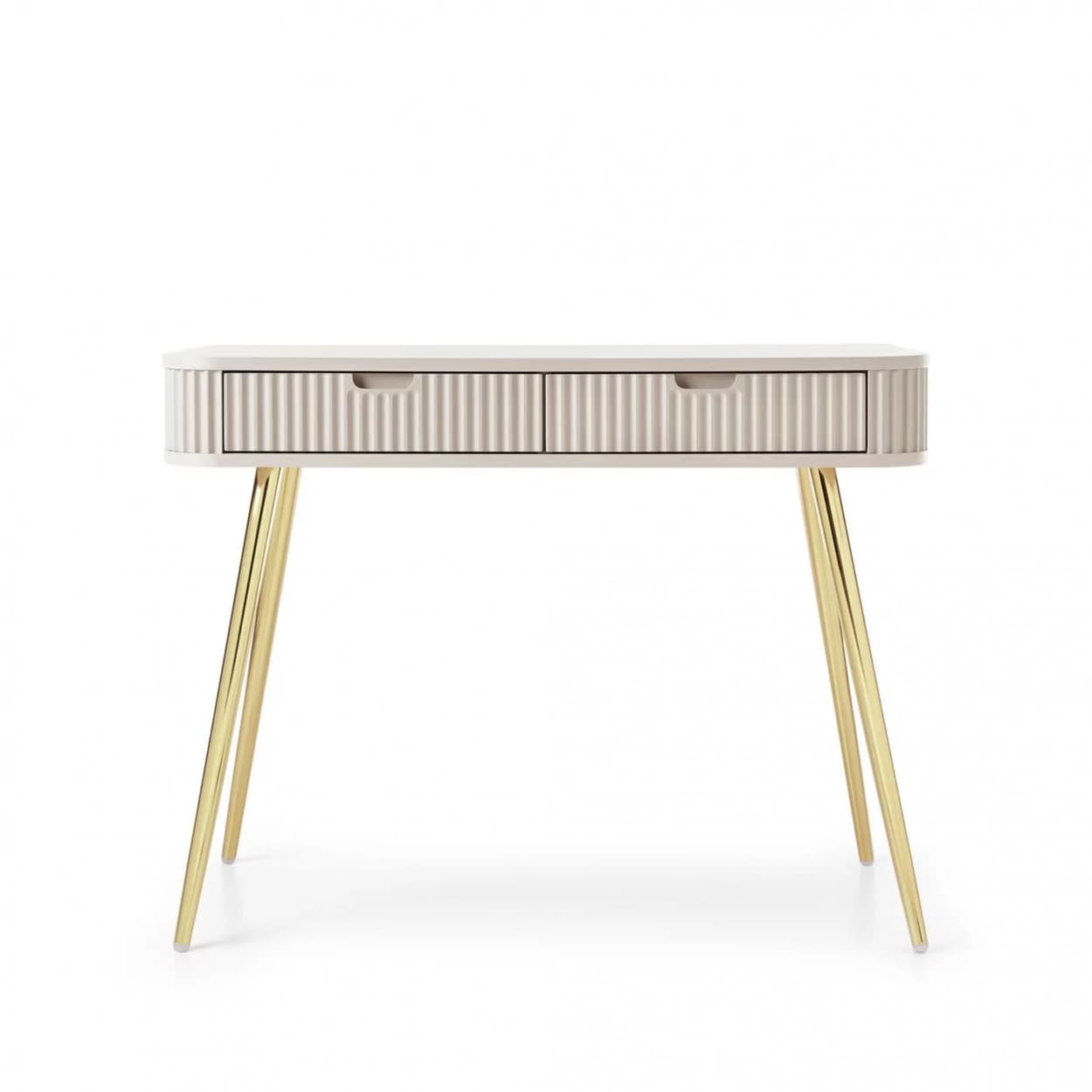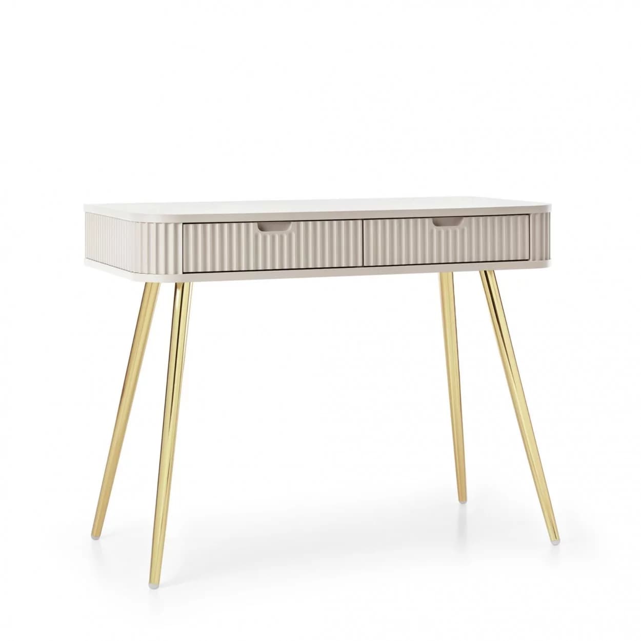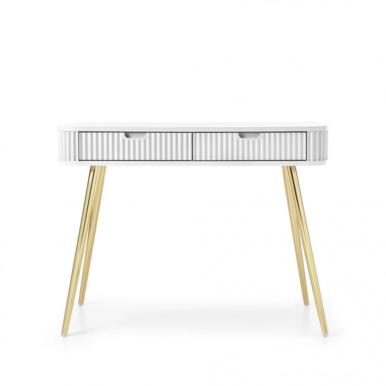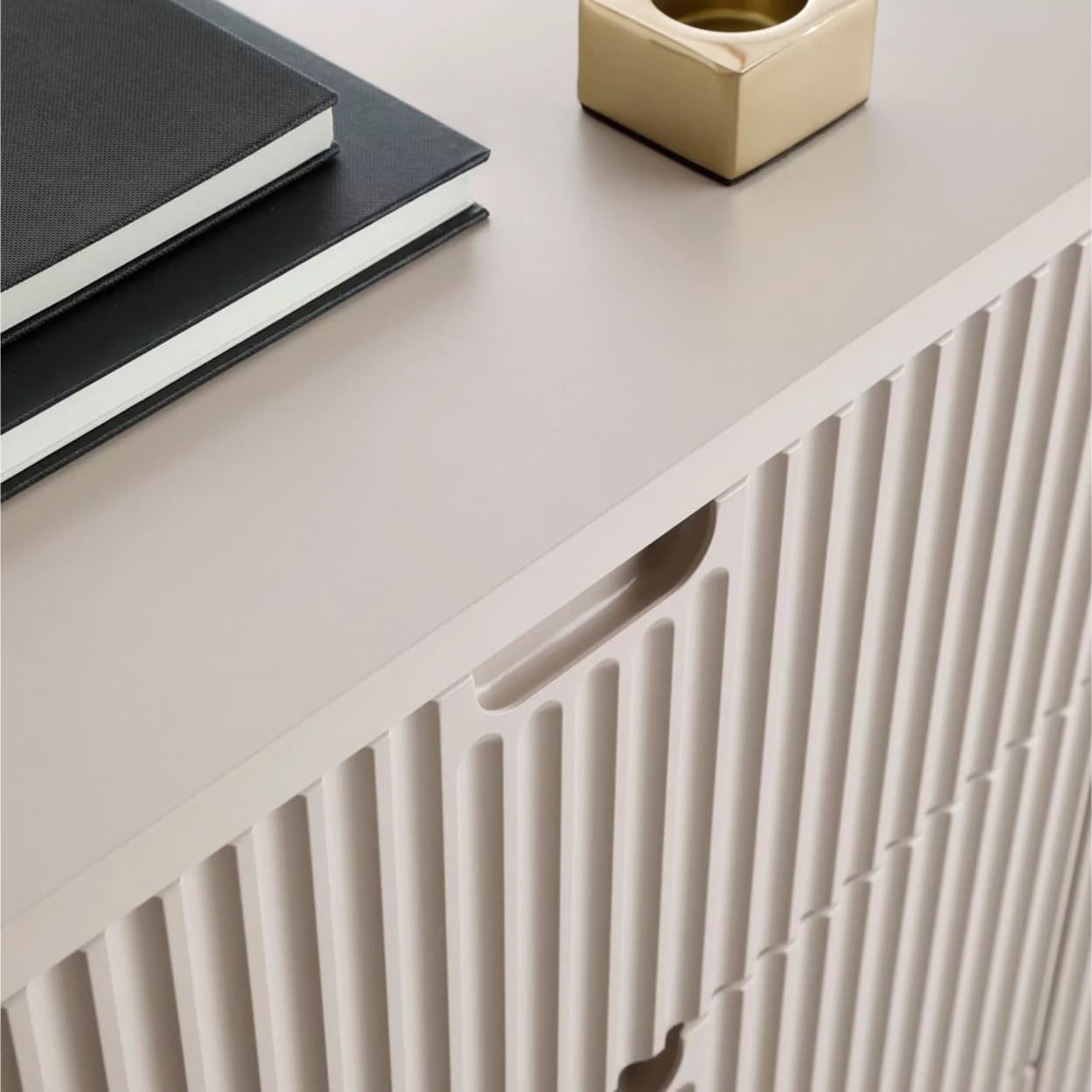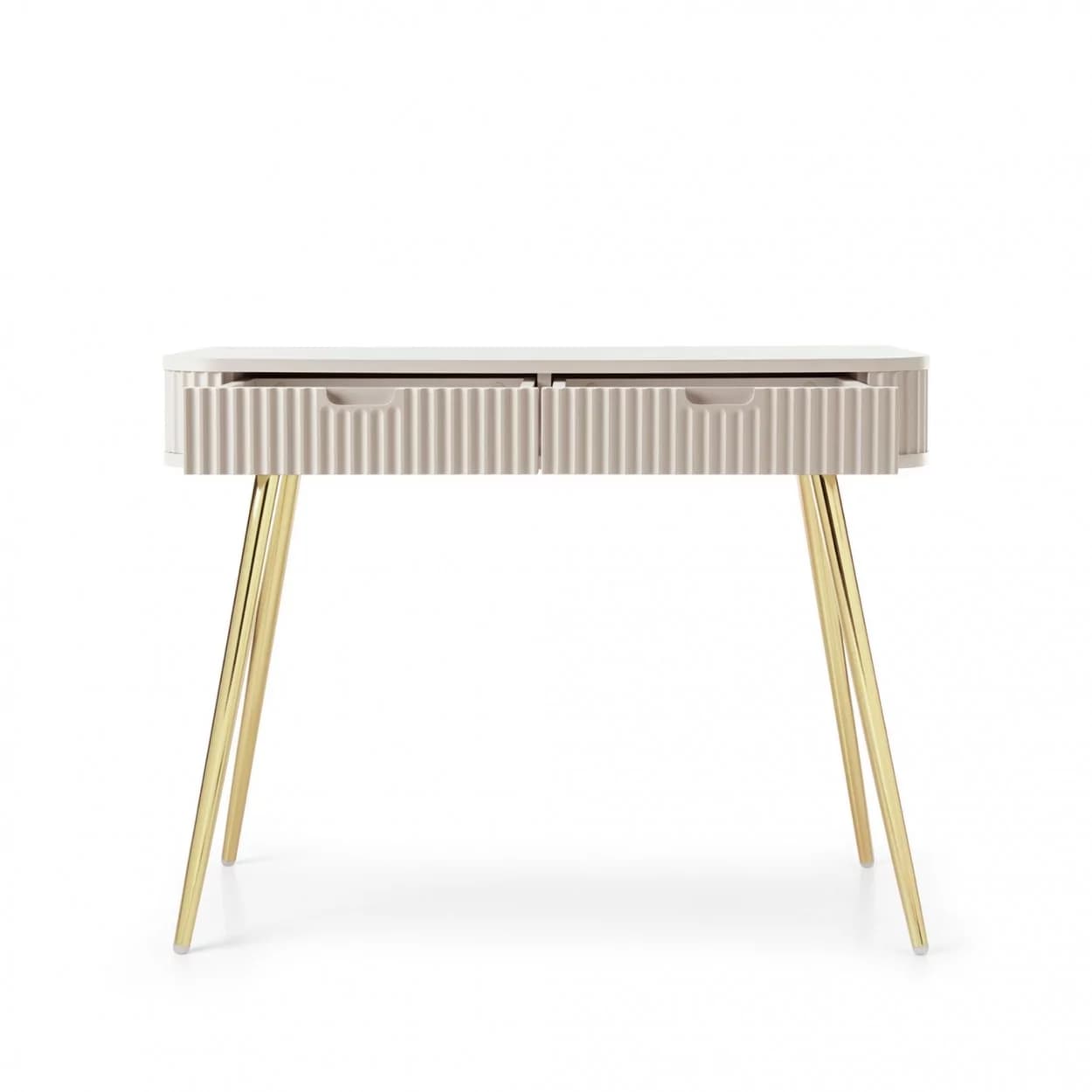 Konsola ZOYA z ryflowanym frontem i zaokrąglonymi bokami to połączenie nowoczesnego stylu i praktyczności. Dostępna w trzech kolorach, z nóżkami w złotym lub czarnym wykończeniu.