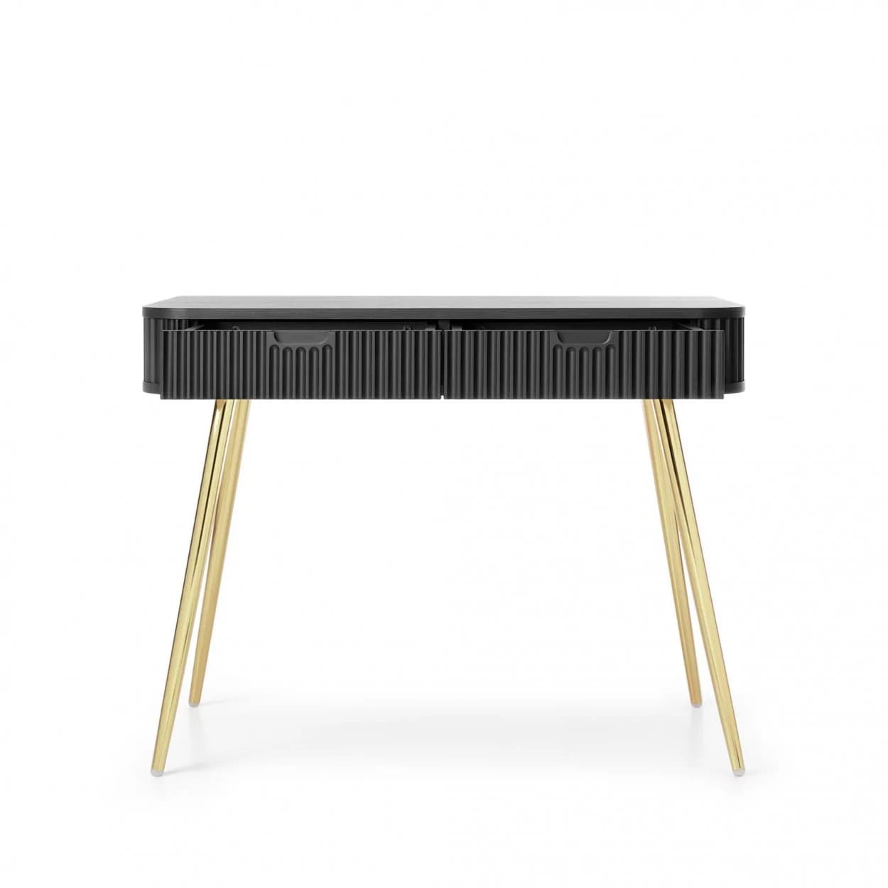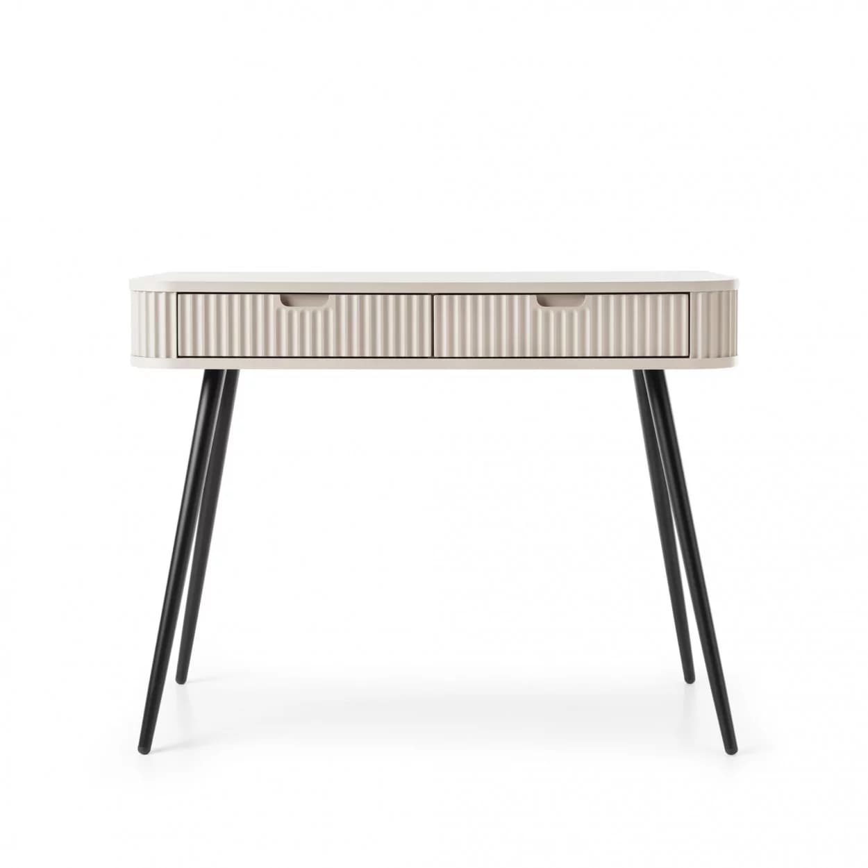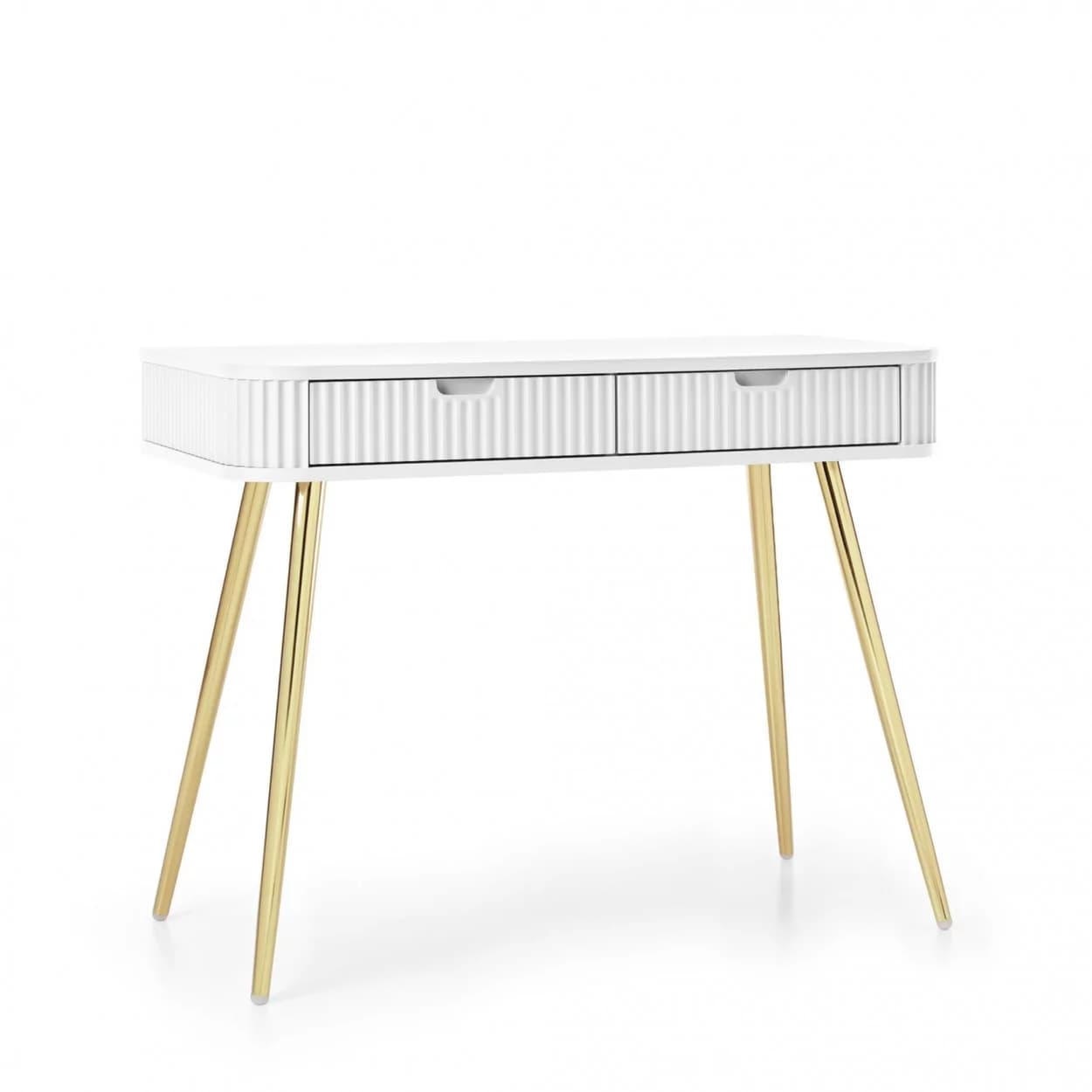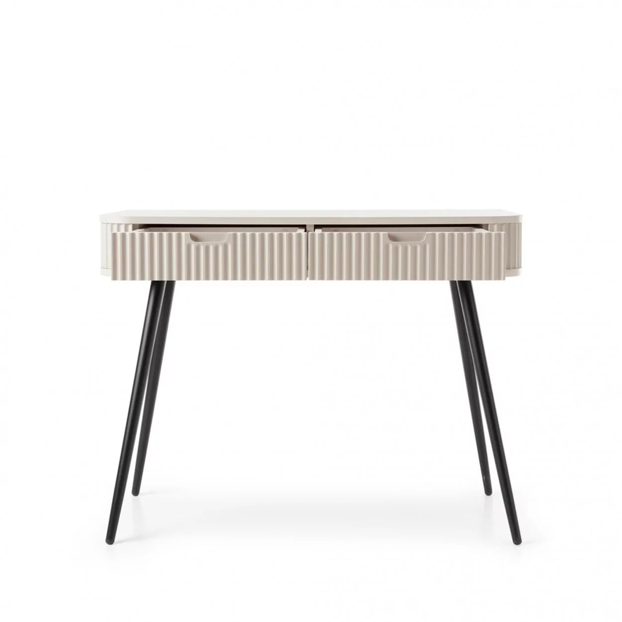Konsola ZOYA z ryflowanym frontem i zaokrąglonymi bokami to połączenie nowoczesnego stylu i praktyczności. Dostępna w trzech kolorach, z nóżkami w złotym lub czarnym wykończeniu.