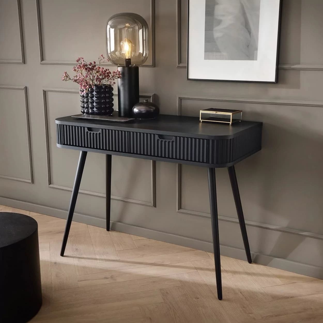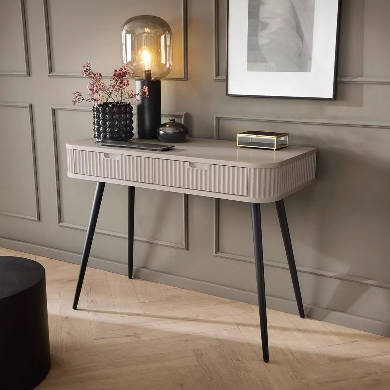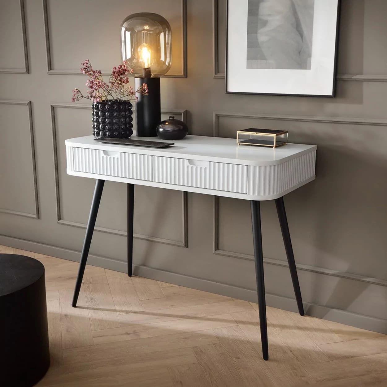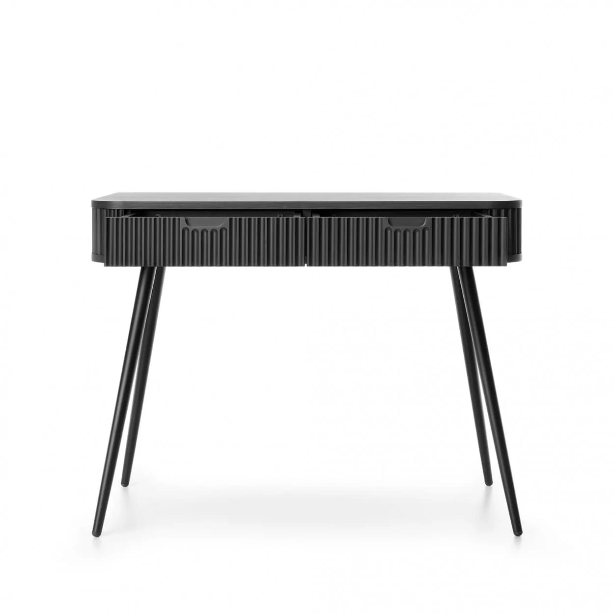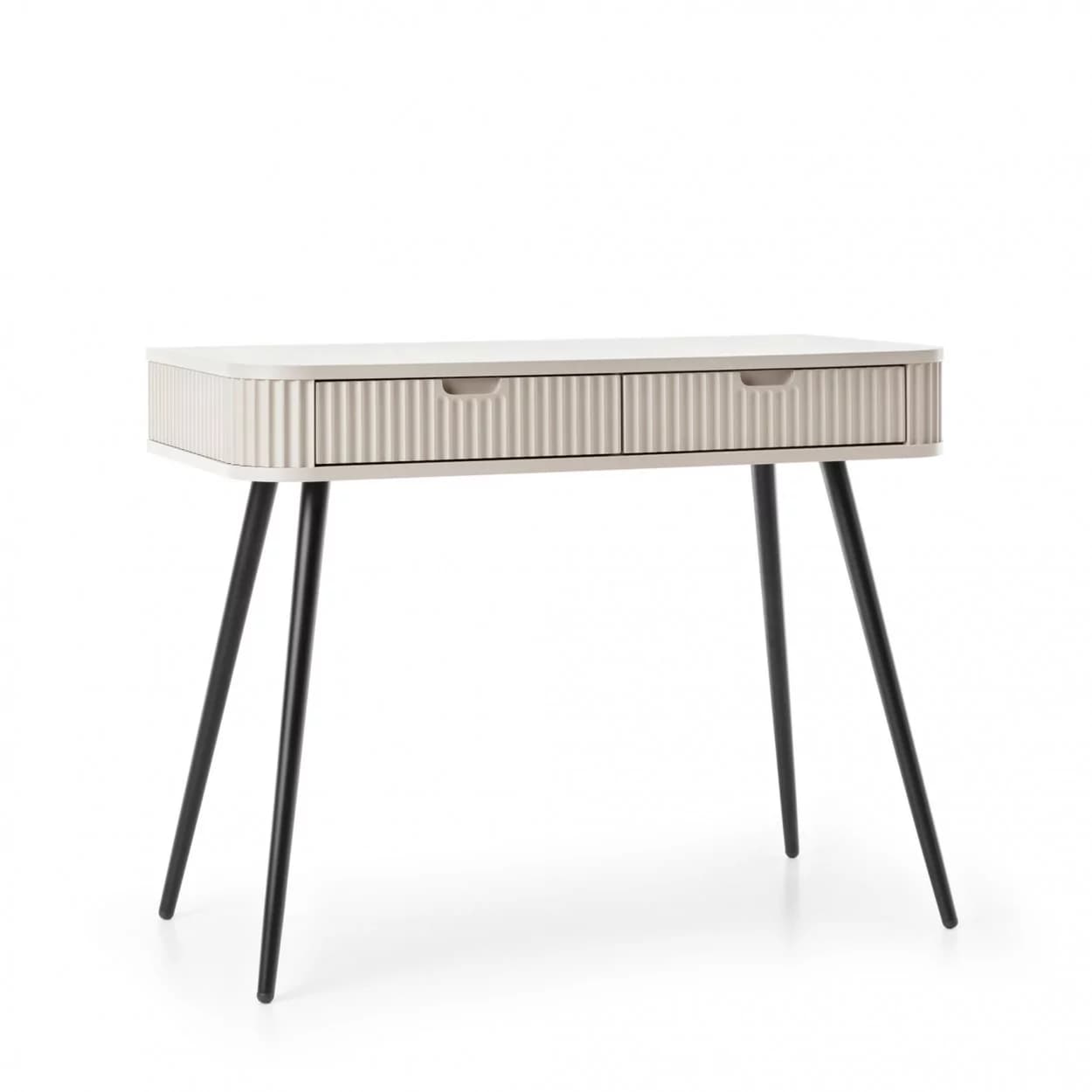 Konsola ZOYA z ryflowanym frontem i zaokrąglonymi bokami to połączenie nowoczesnego stylu i praktyczności. Dostępna w trzech kolorach, z nóżkami w złotym lub czarnym wykończeniu.