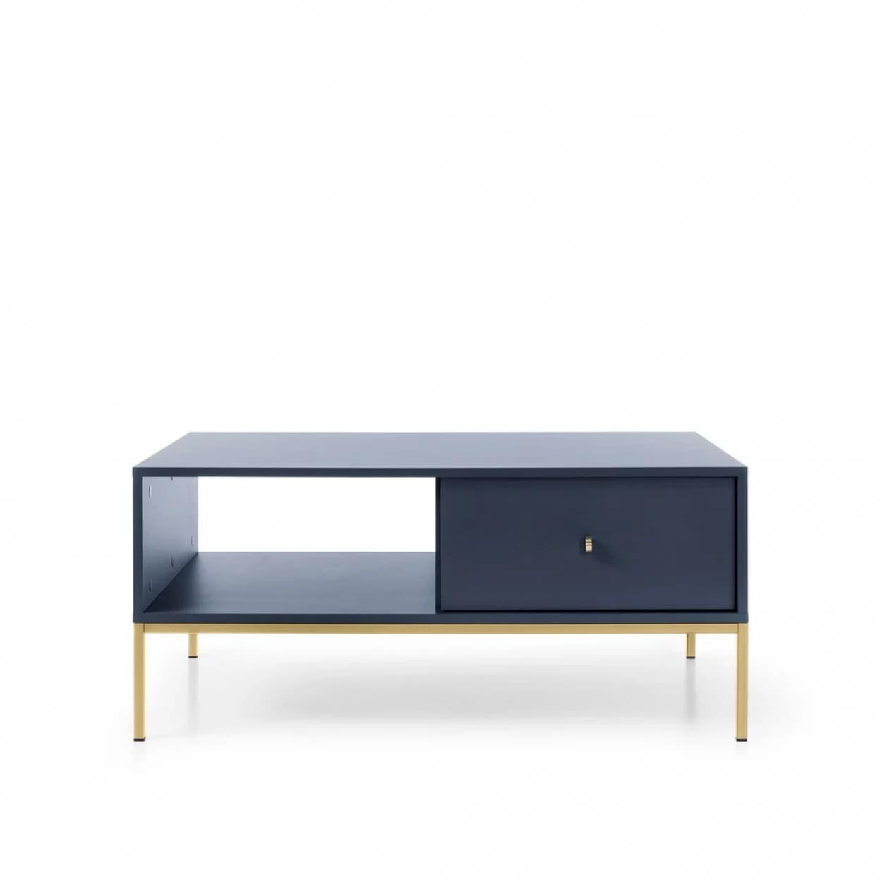 Ława Kawowa AZURE w subtelnym odcieniu granatu, na metalowym stelażu w kolorze czarnym lub złotym. Wyposażona w praktyczną szufladę i złoty uchwyt, łączy funkcjonalność z elegancją.