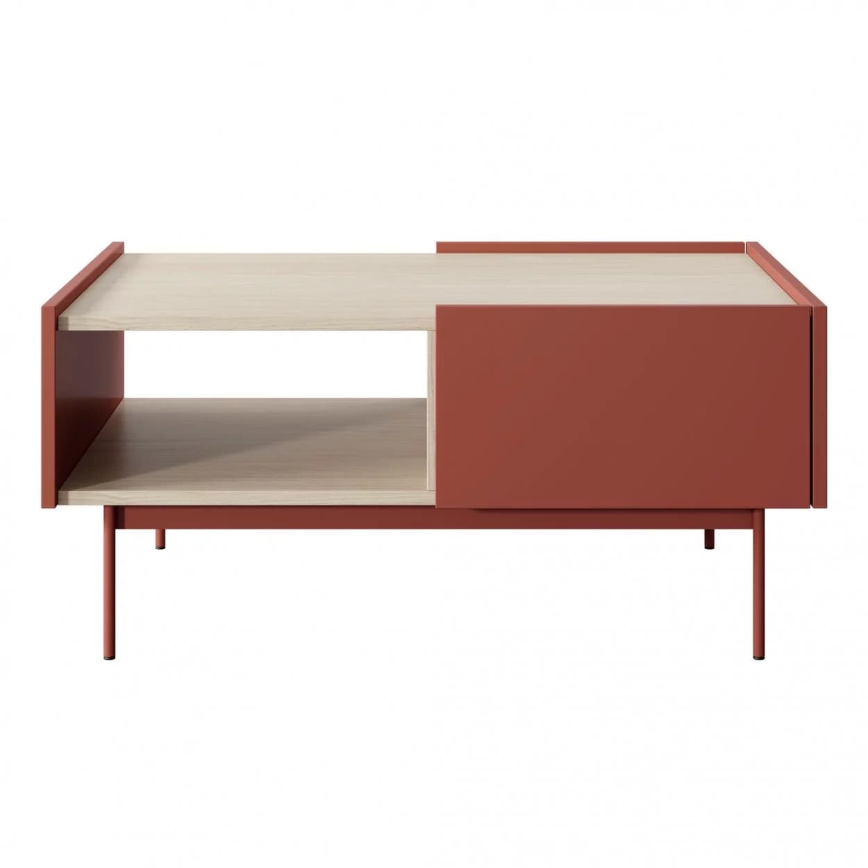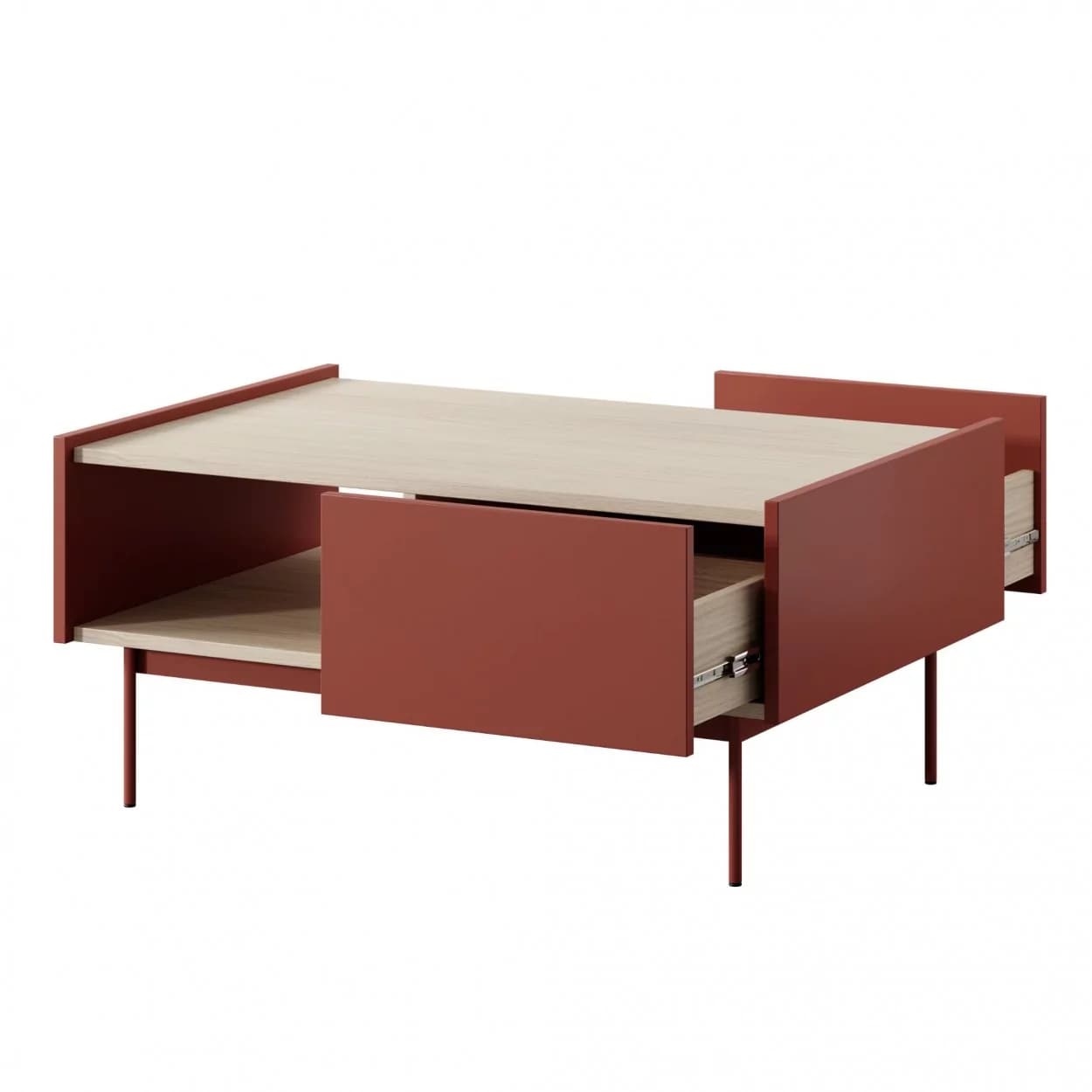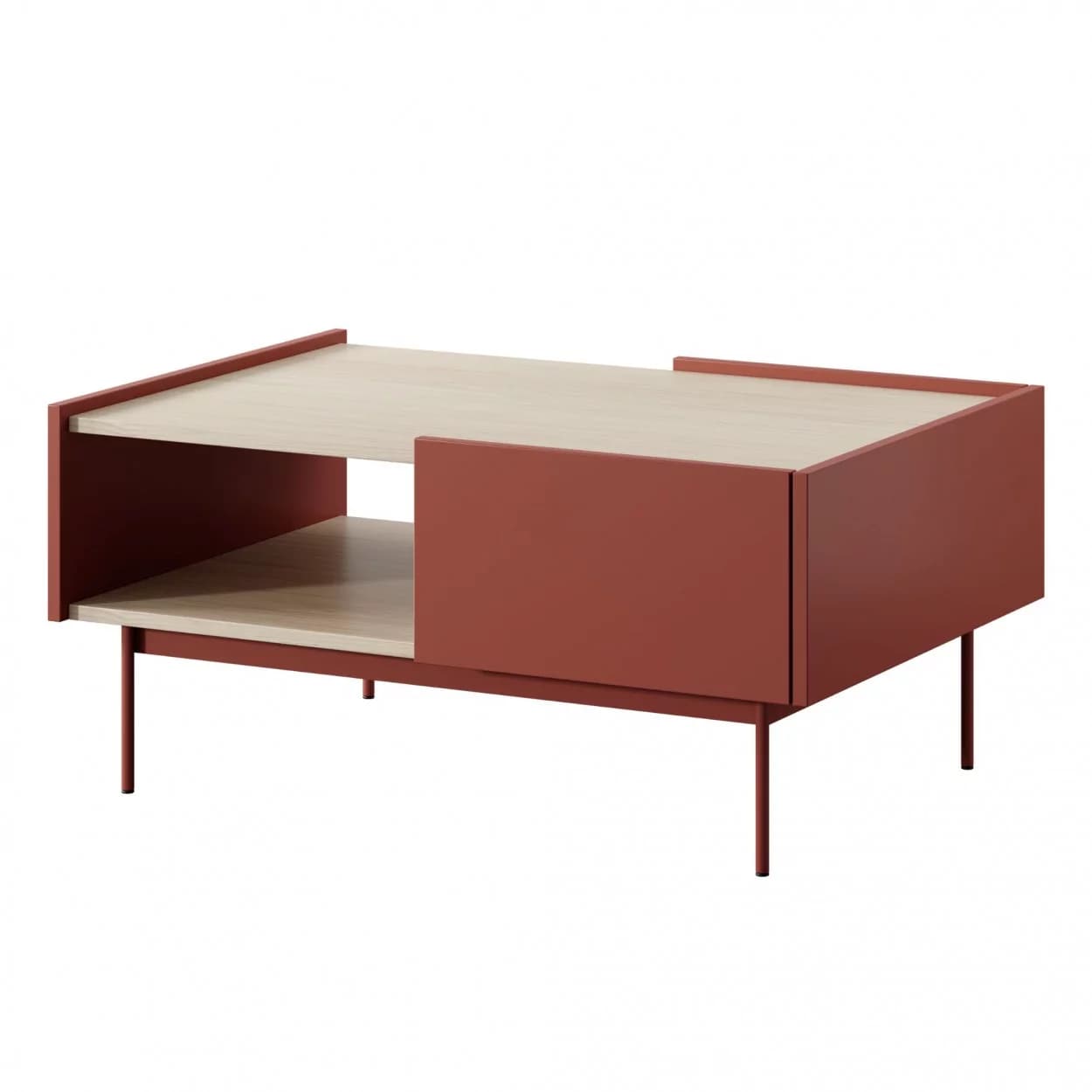 Ława kawowa Lumina w Ceramic Red i Dąb Linea to funkcjonalny i nowoczesny mebel z bezuchwytowym otwieraniem, wpuszczonym blatem i praktyczną szufladą, idealny do stylowego salonu.