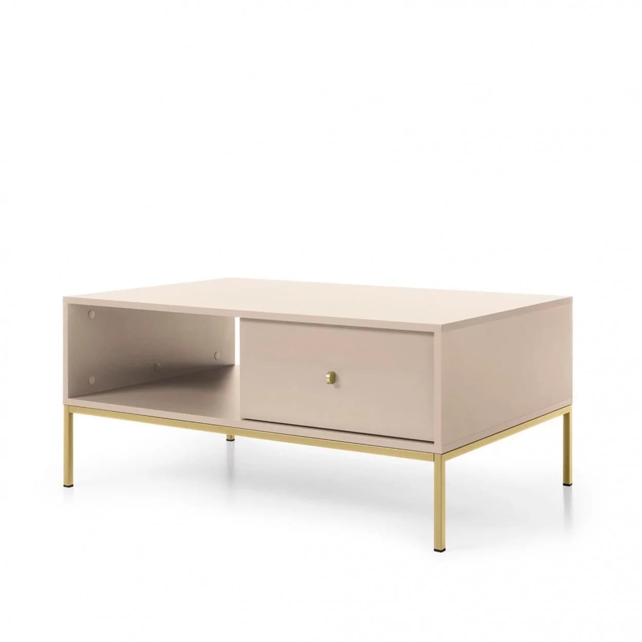 Ława Kawowa TANSY w beżowym kolorze z praktyczną szufladą i metalowym stelażem. Dostępna w dwóch kolorach: czarnym lub złotym, ze złotym uchwytem, który dodaje elegancji.