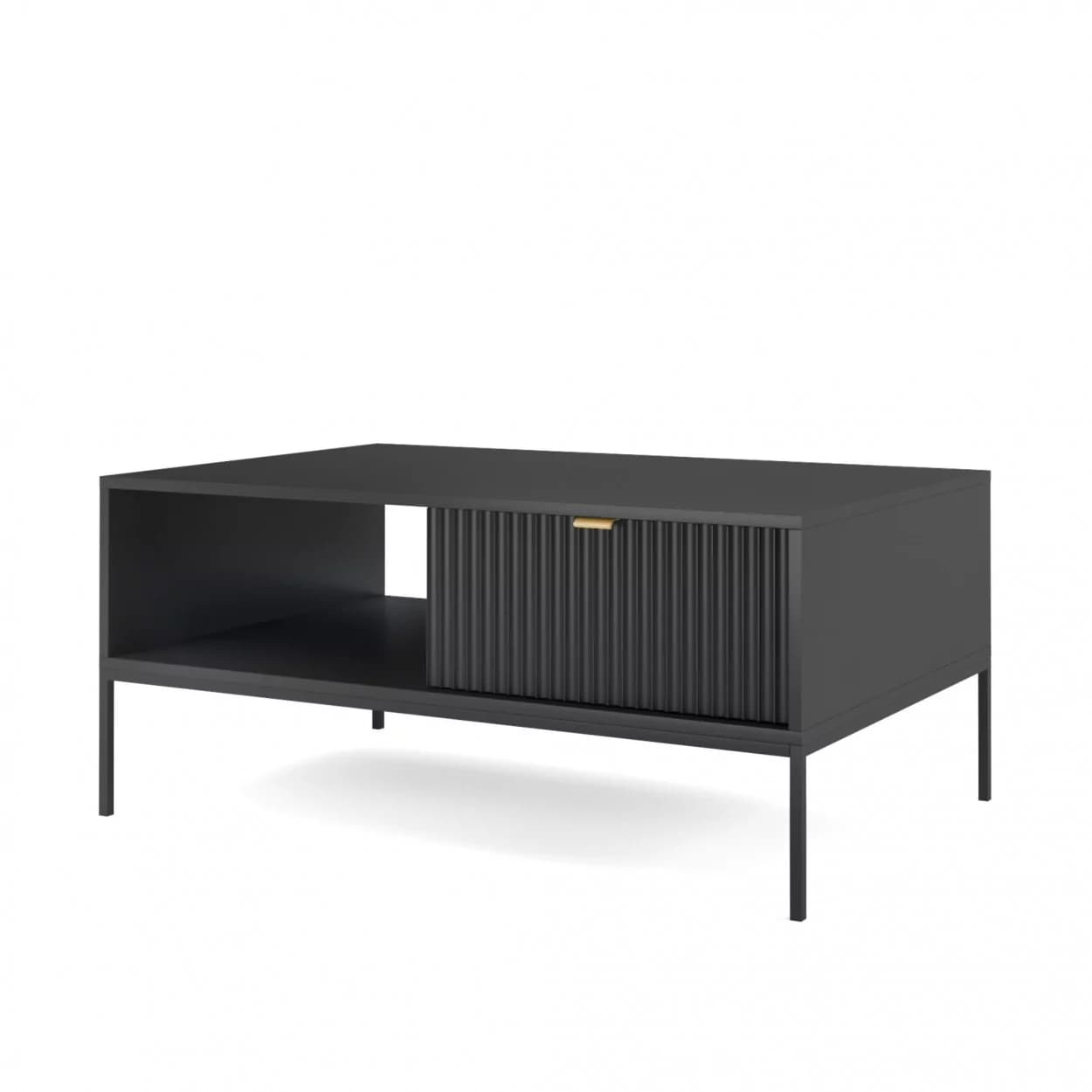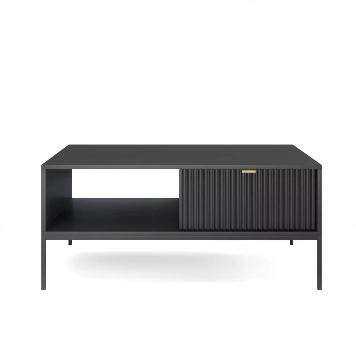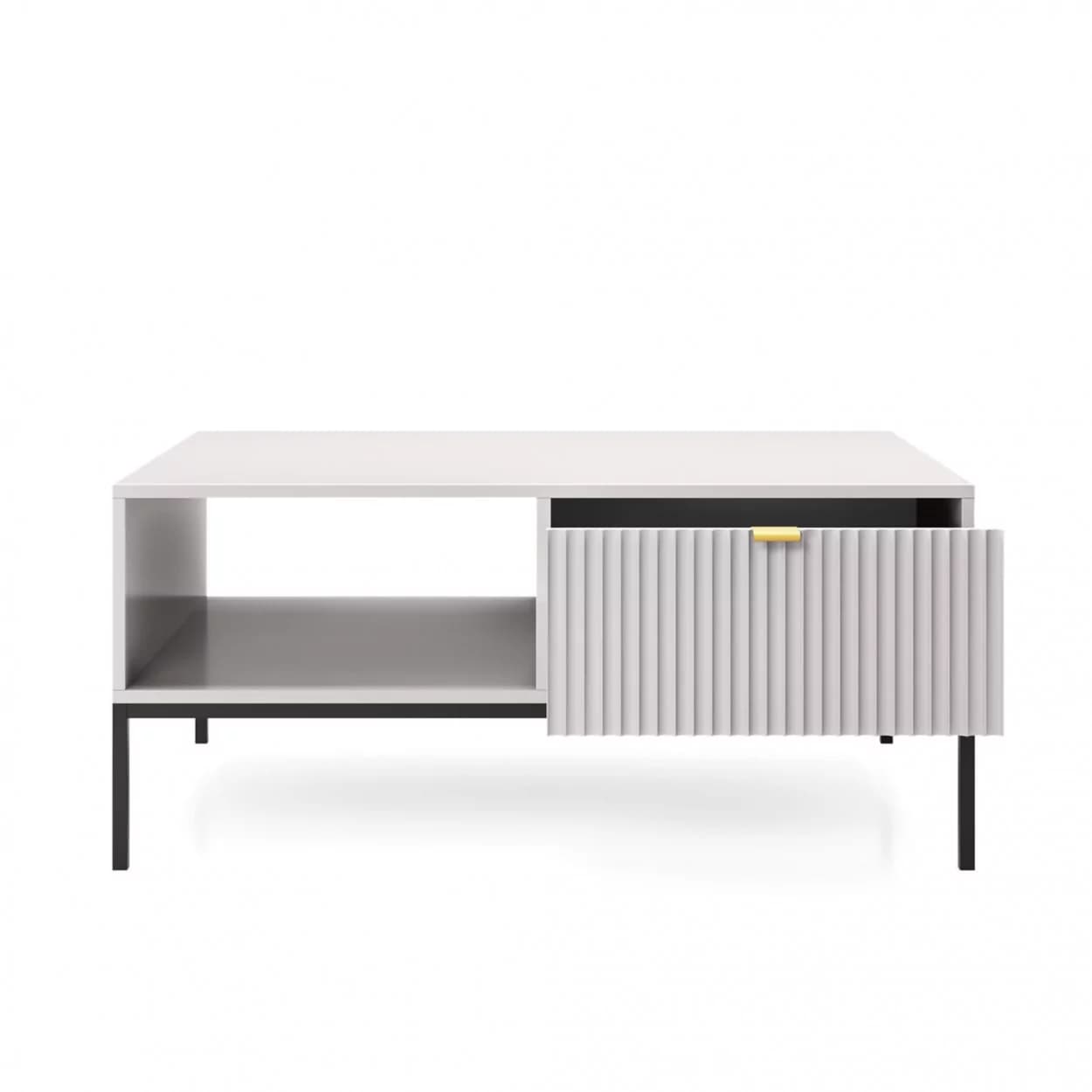 Ława kawowa VESTA dostępna w czterech wariantach kolorystycznych wyróżnia się efektownymi, ryflowanymi frontami oraz solidnym metalowym stelażem. Posiada praktyczną szufladę na drobiazgi, łącząc styl z funkcjonalnością.