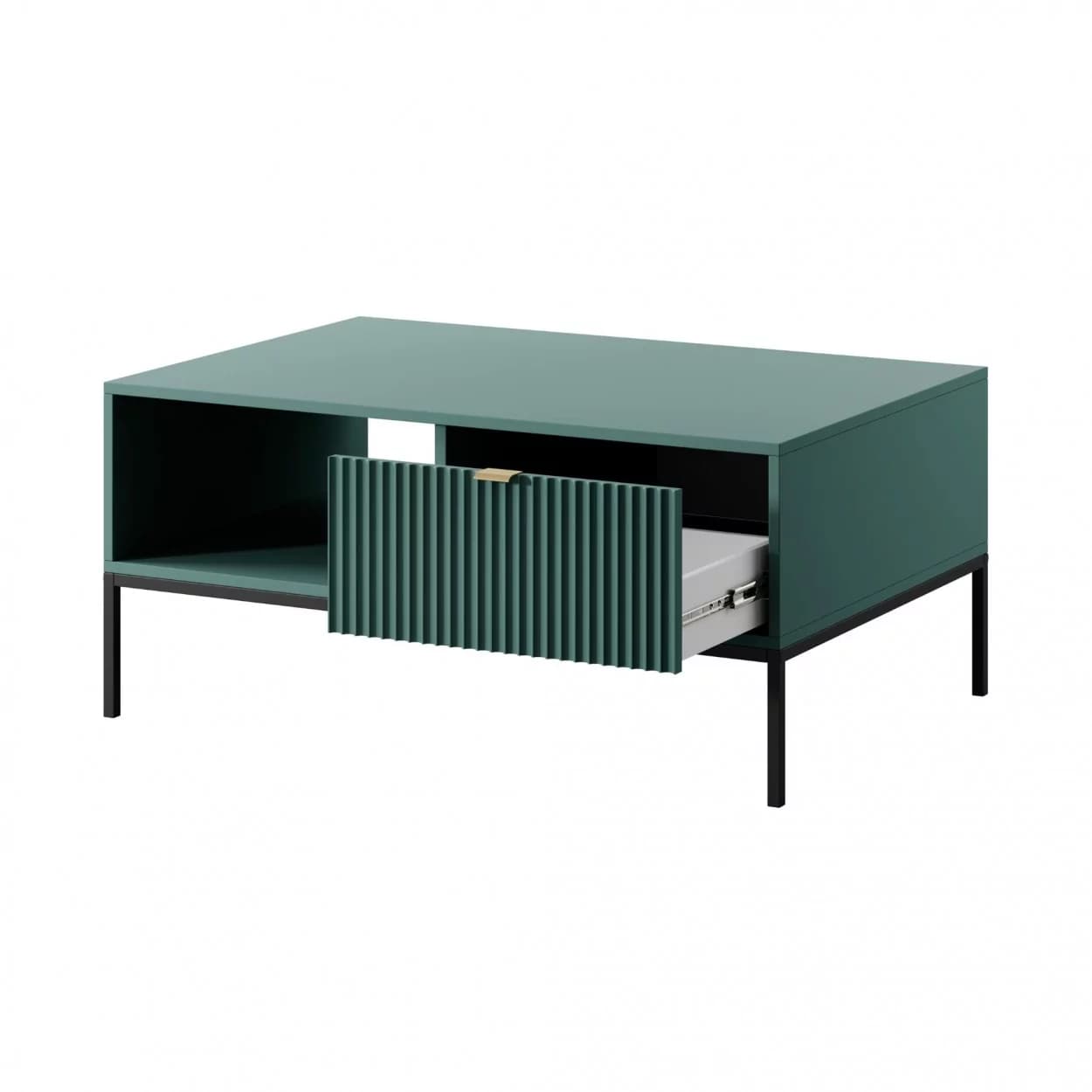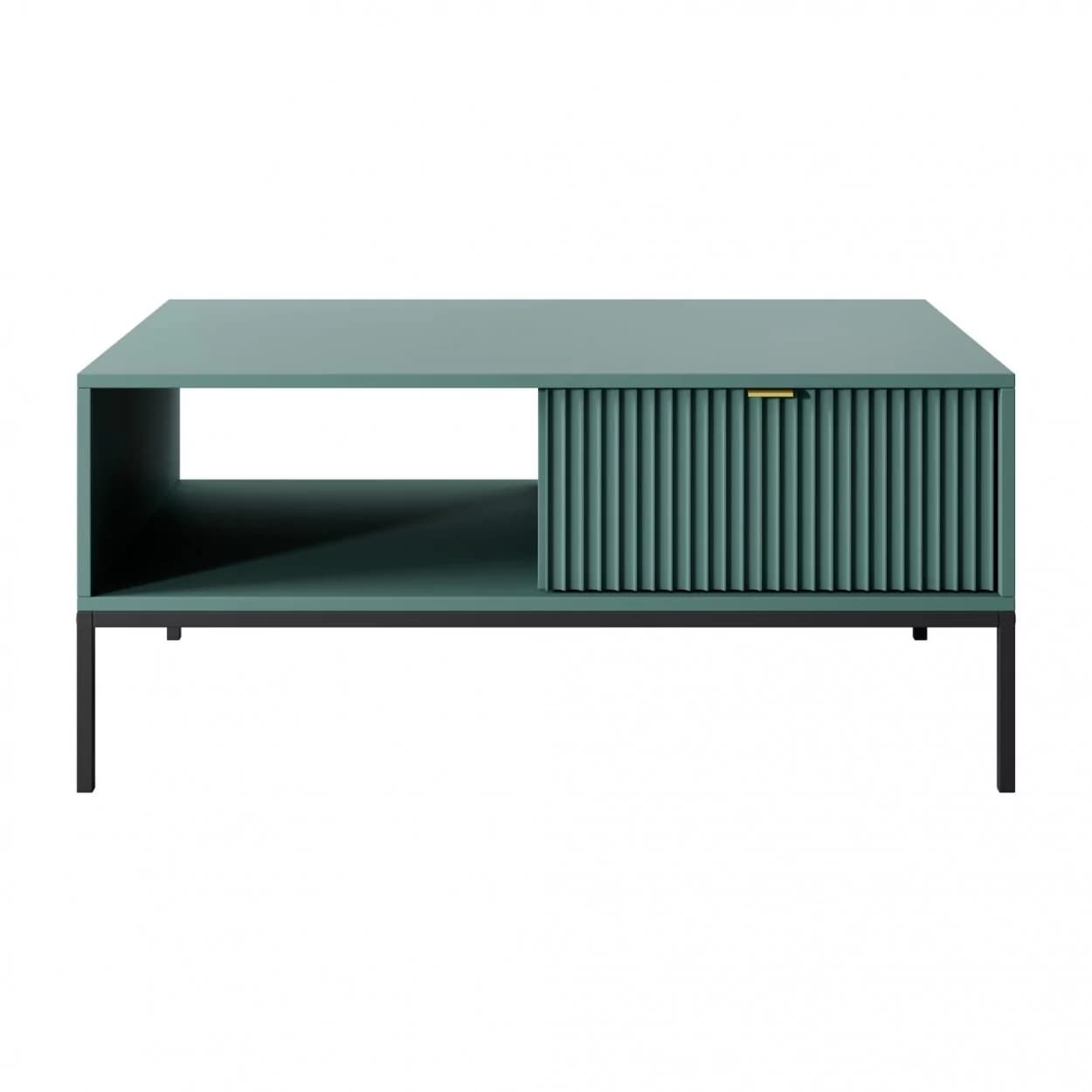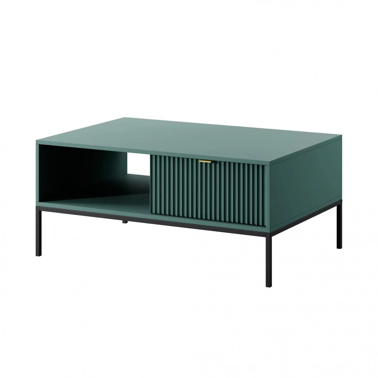 Ława kawowa VESTA dostępna w czterech wariantach kolorystycznych wyróżnia się efektownymi, ryflowanymi frontami oraz solidnym metalowym stelażem. Posiada praktyczną szufladę na drobiazgi, łącząc styl z funkcjonalnością.