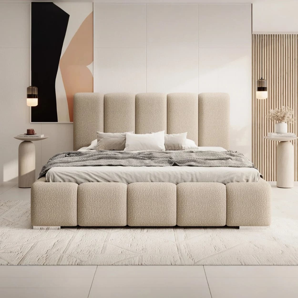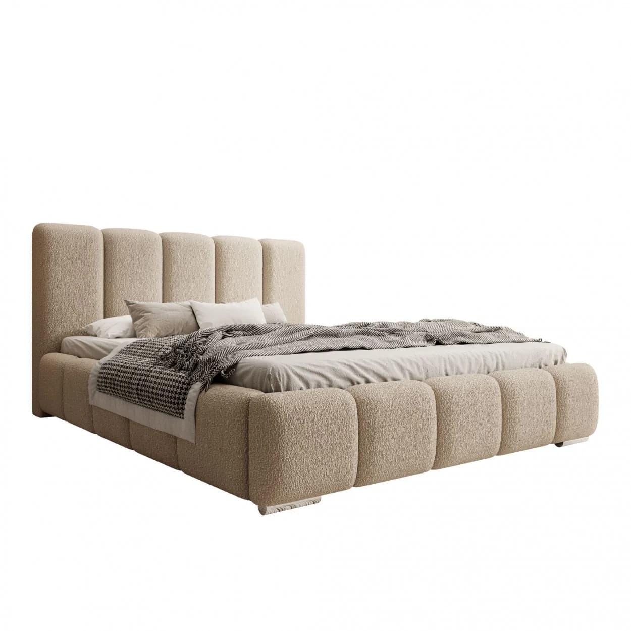 Styl glamour, tapicerka Boucle, chromowane nóżki, pojemnik na pościel z mechanizmem sprężynowym, wysoki zagłówek, komfort i funkcjonalność.