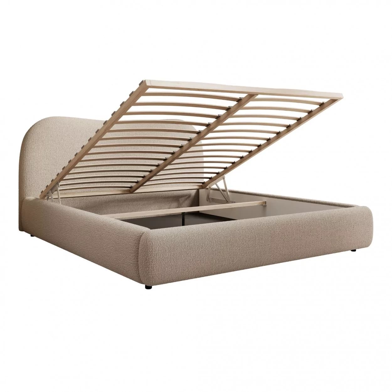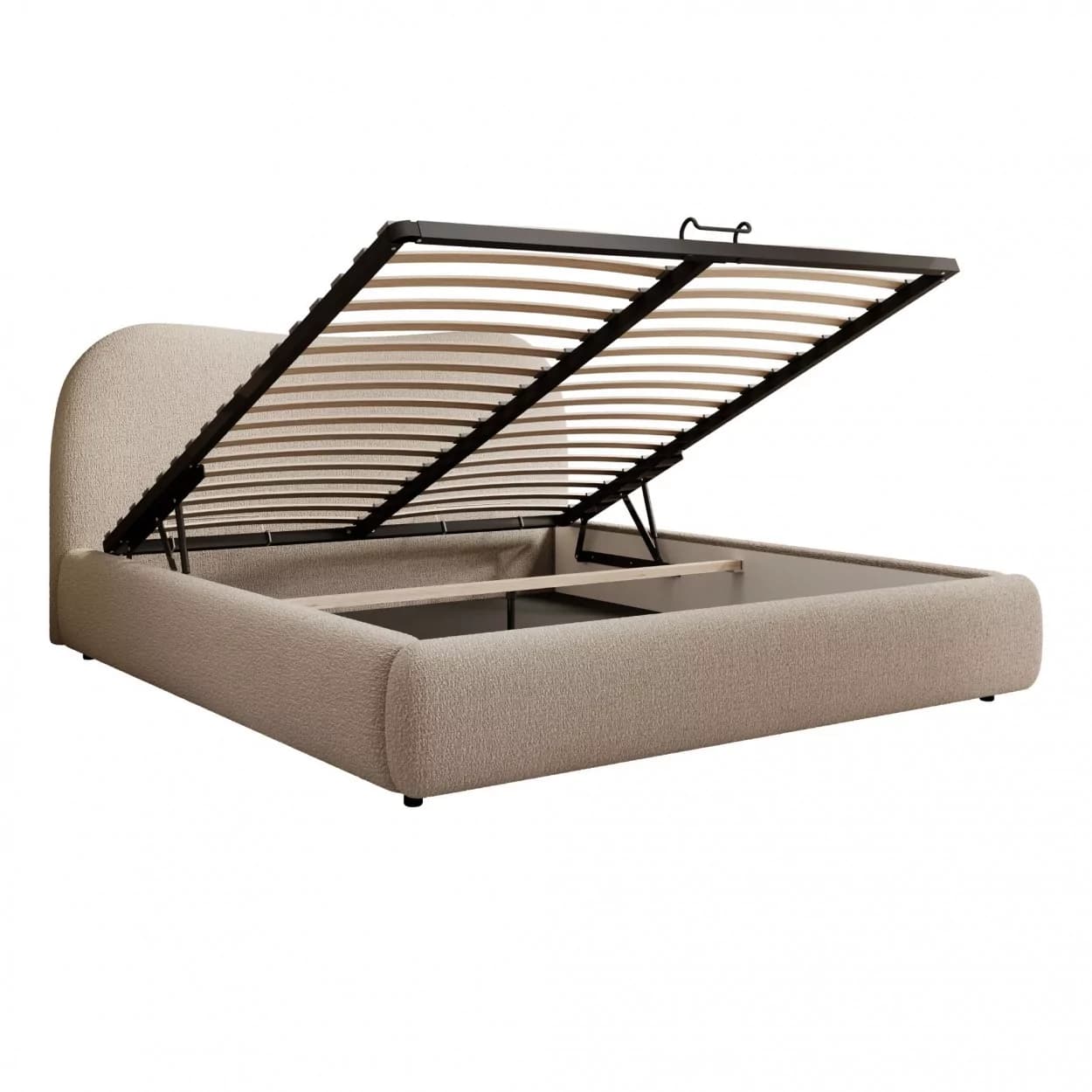 Łóżko SELVIO to połączenie wysokiej estetyki i praktycznych rozwiązań. Jego największym atutem jest subtelnie zaokrąglony, tapicerowany zagłówek, który zapewnia komfort podczas wypoczynku i stanowi dekoracyjny element sypialni. Solidna konstrukcja i charakterystyczna tkanina boucle nadają meblowi wyrazistego stylu i przytulności.