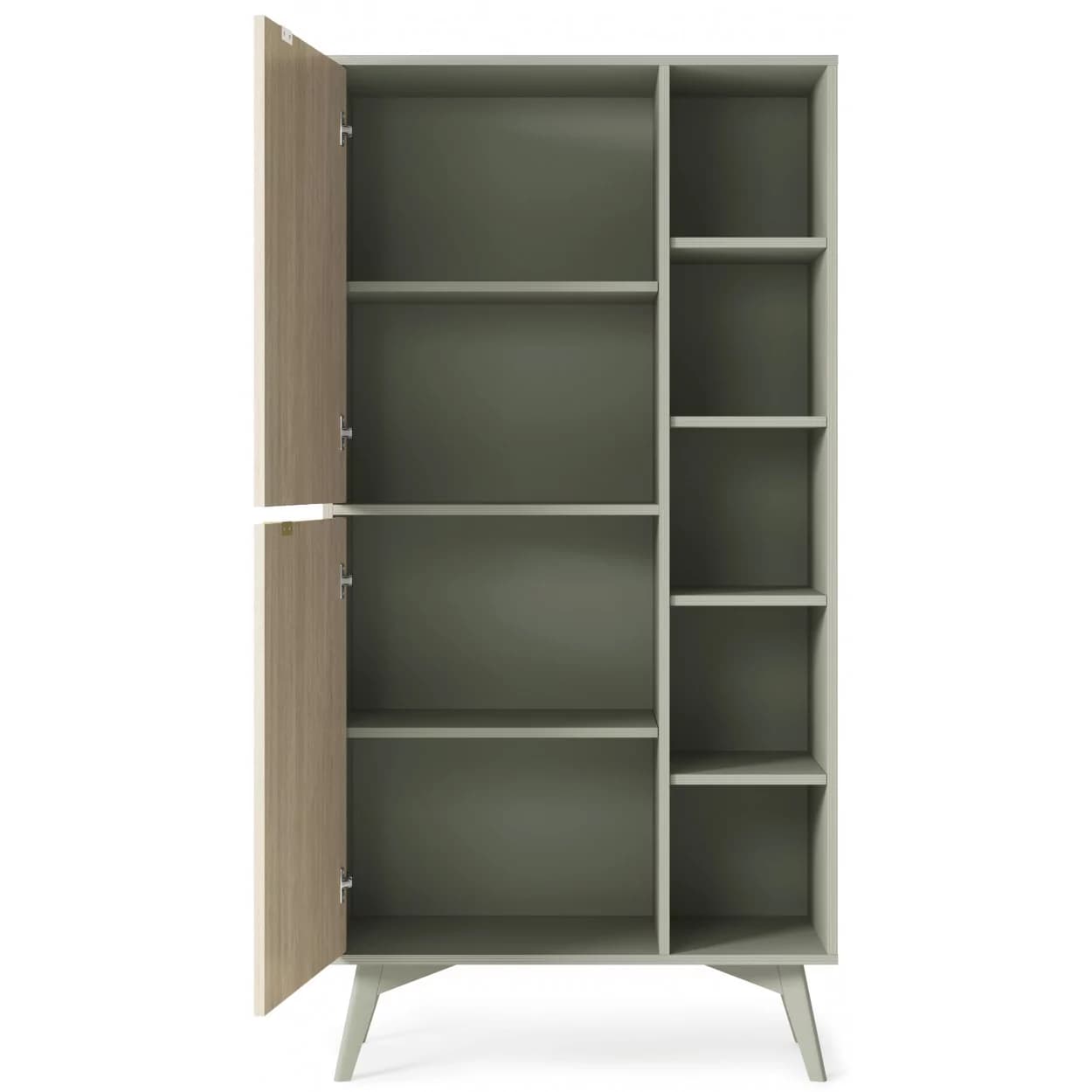 Regał FLOSSY w eukaliptusowym kolorze z złotymi detalami i motywem jodełki to elegancki i praktyczny dodatek do nowoczesnych wnętrz.