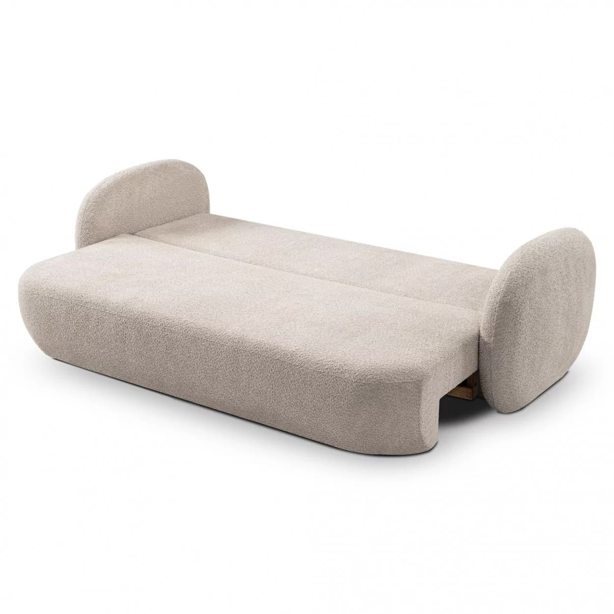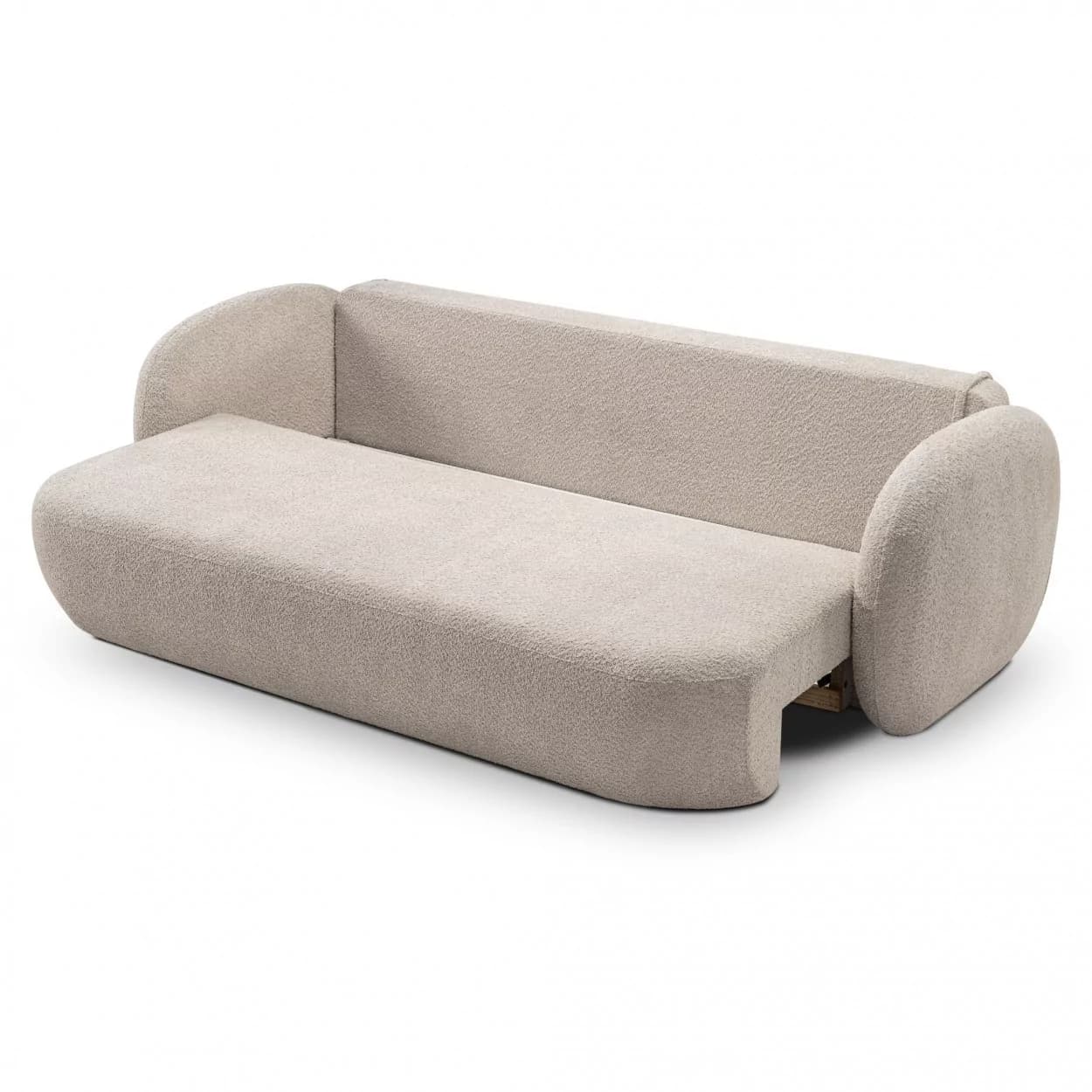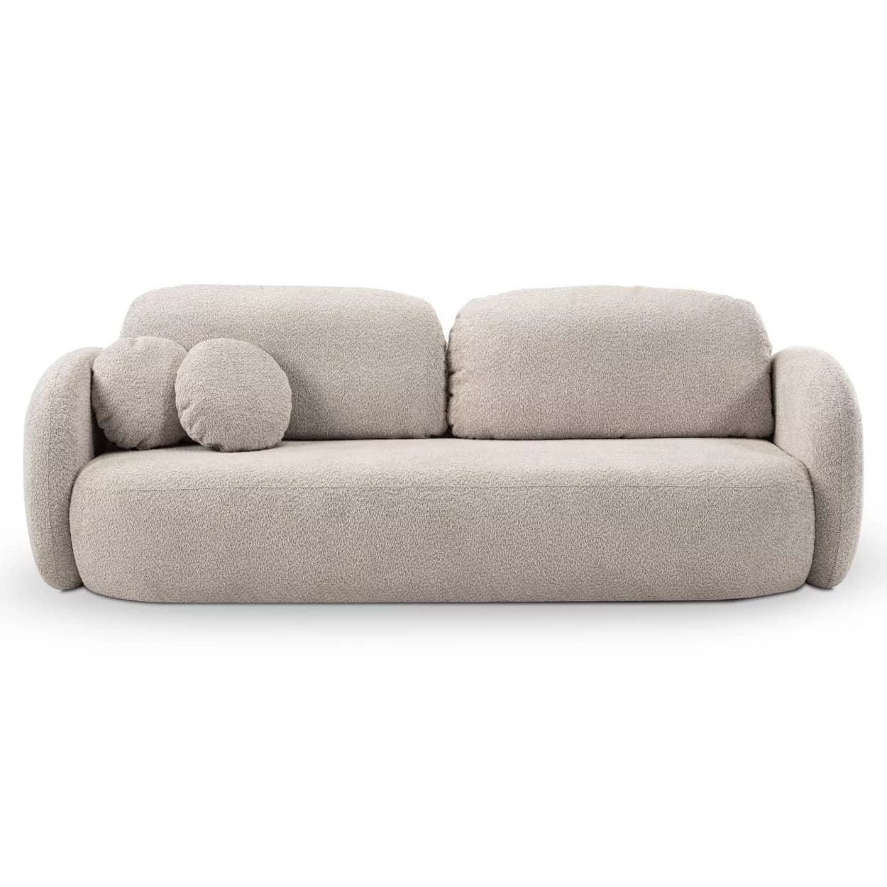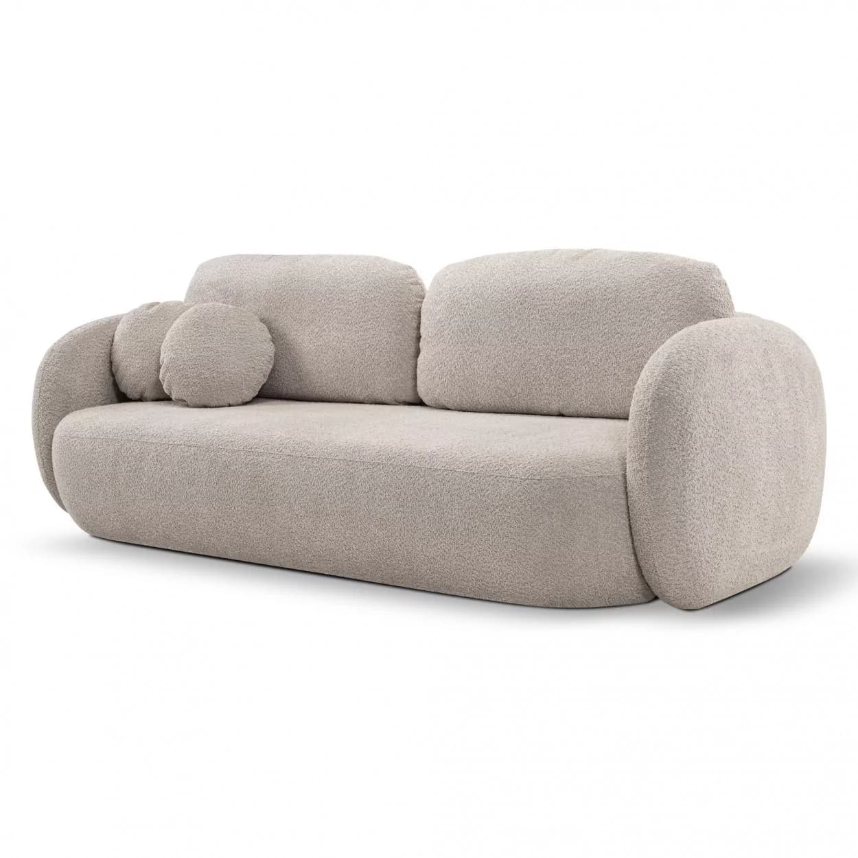 Kanapa VELO to stylowy mebel z tkaniny boucle ABRIAMO, wyposażony w funkcję spania i pojemnik na pościel. Jej obła forma i nowoczesny design sprawiają, że idealnie sprawdzi się w każdym wnętrzu, łącząc wygodę z elegancją.