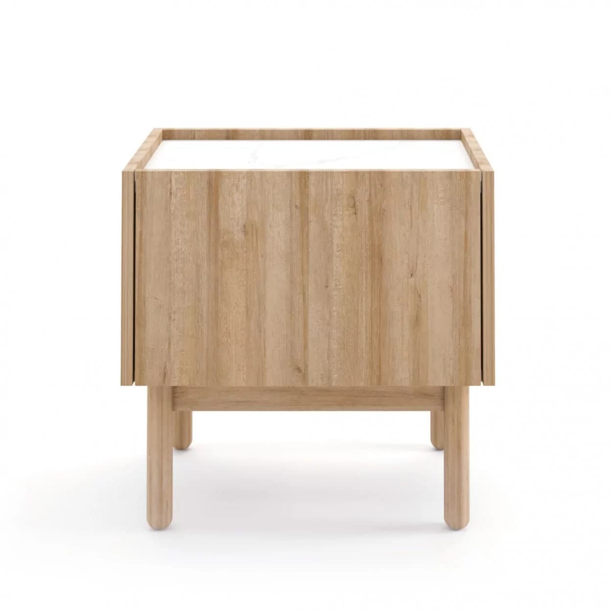 Stolik nocny FRISK w kolorze Dąb Riviera / Marmur Bianco z bezuchwytowym otwieraniem i wpuszczonym blatem to minimalistyczny, stylowy dodatek do sypialni.