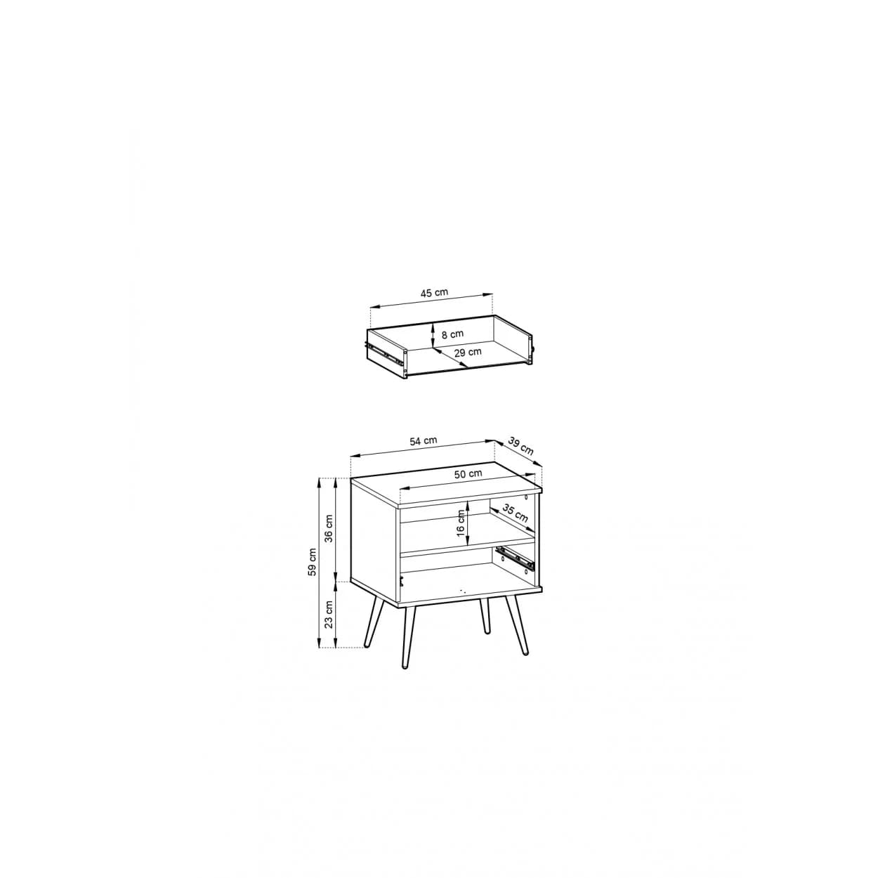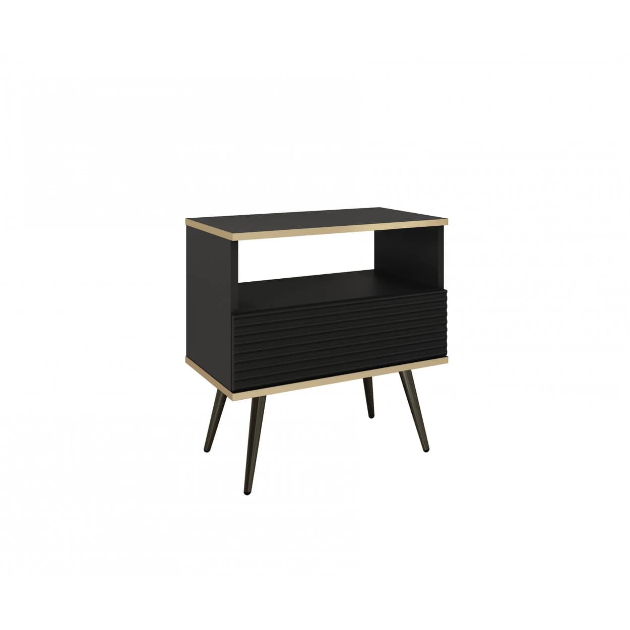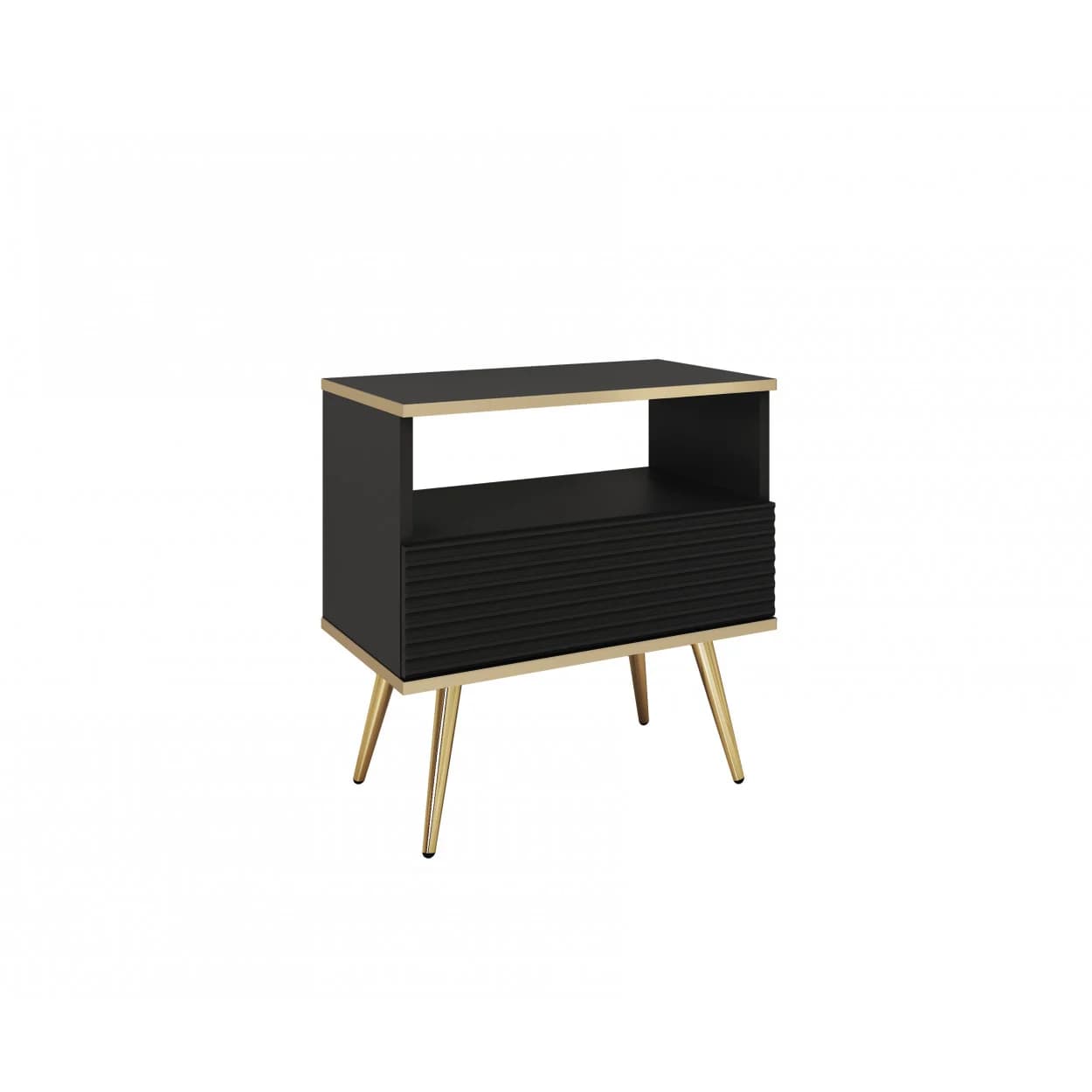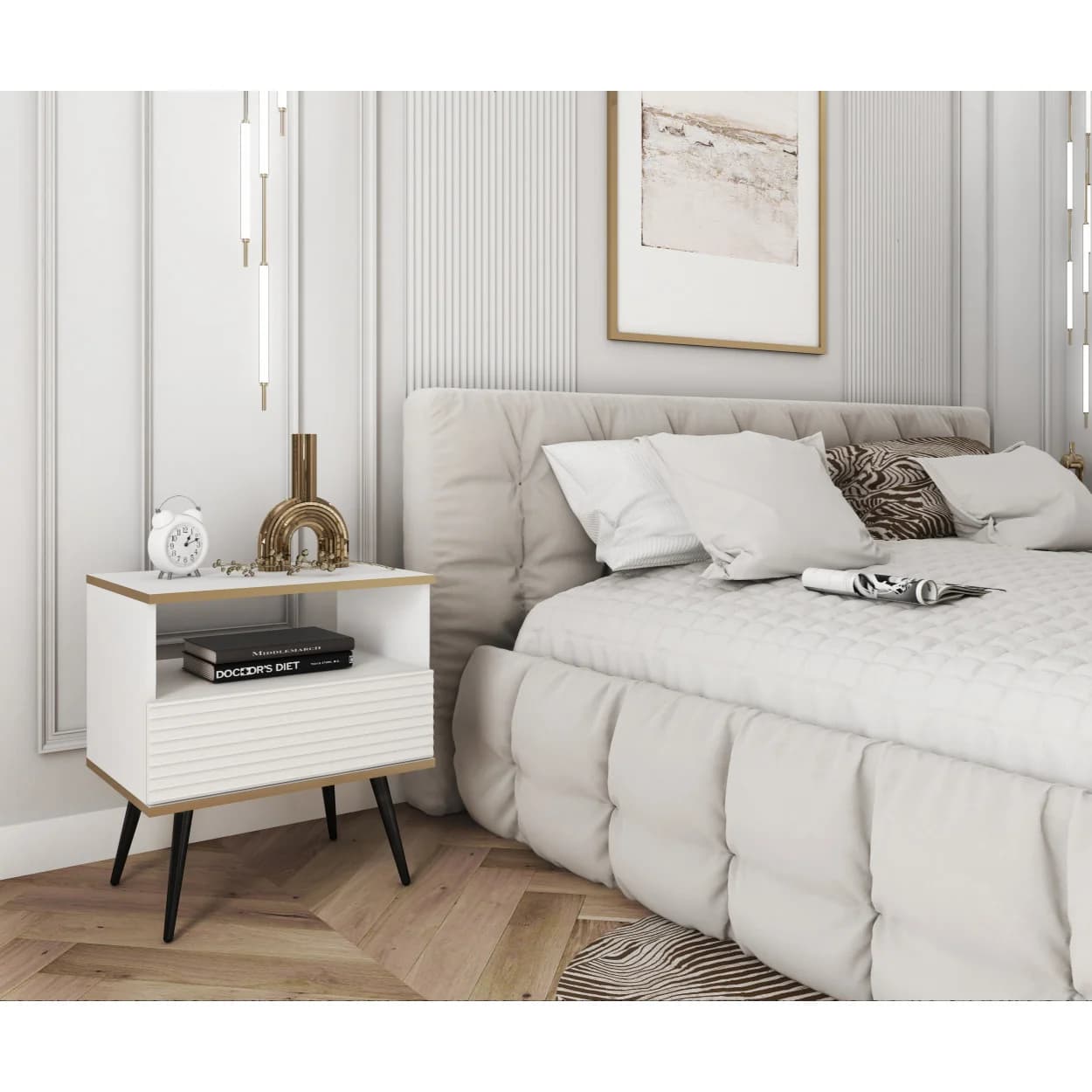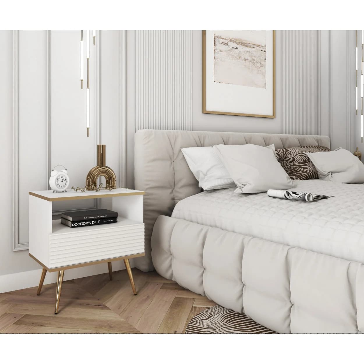 Stolik nocny Mavi łączy elegancję z funkcjonalnością. Ryflowany front, złote akcenty i bezuchwytowy system otwierania tworzą nowoczesny, spójny z kolekcją design.