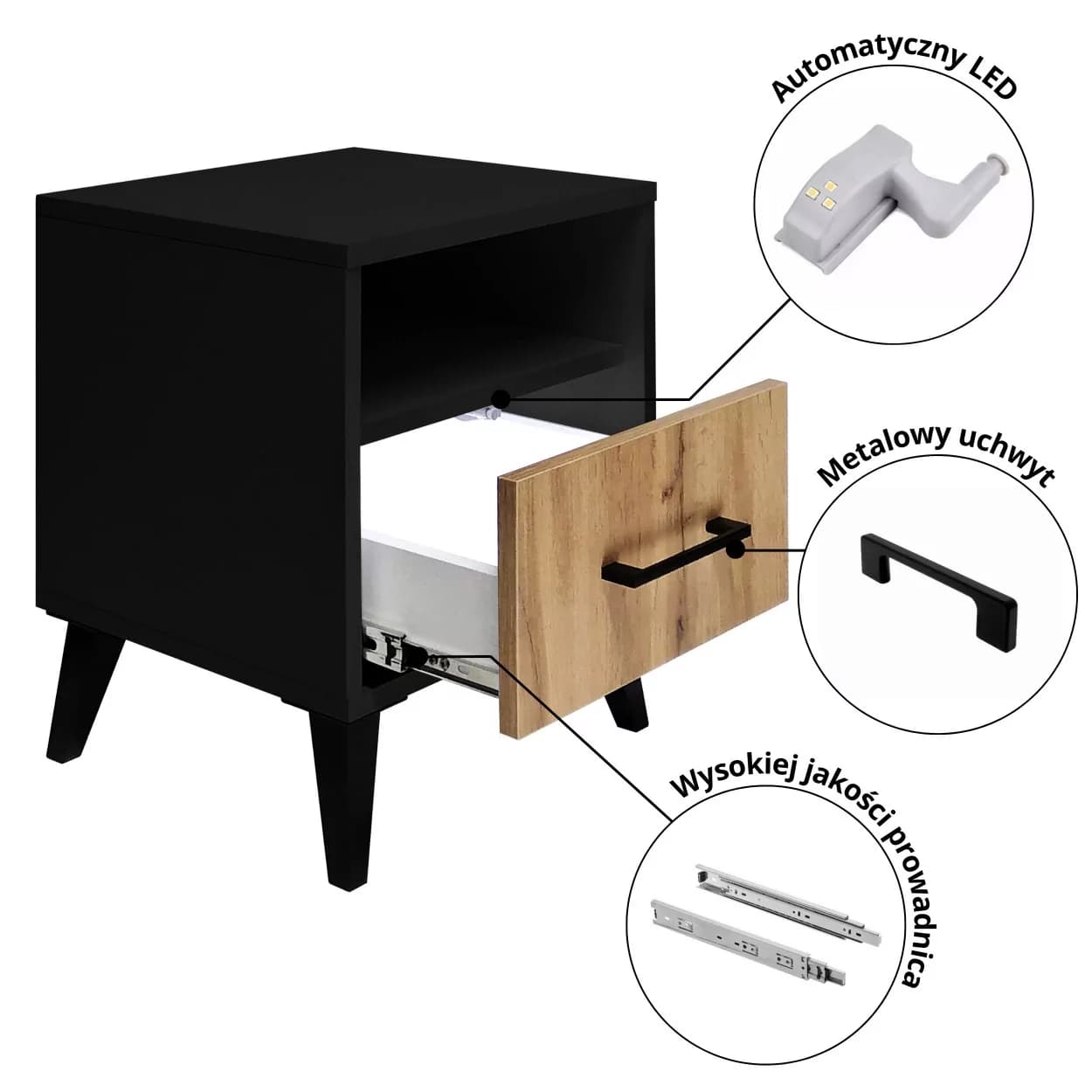 Stolik nocny MODIV VI w kolorze Czarny Mat z frontem dąb wotan to elegancki i funkcjonalny mebel z pojemną szufladą, półką oraz automatycznym oświetleniem LED. Idealny do nowoczesnej sypialni.