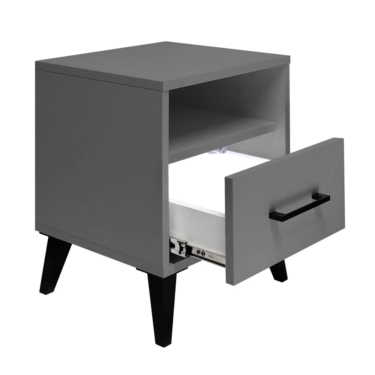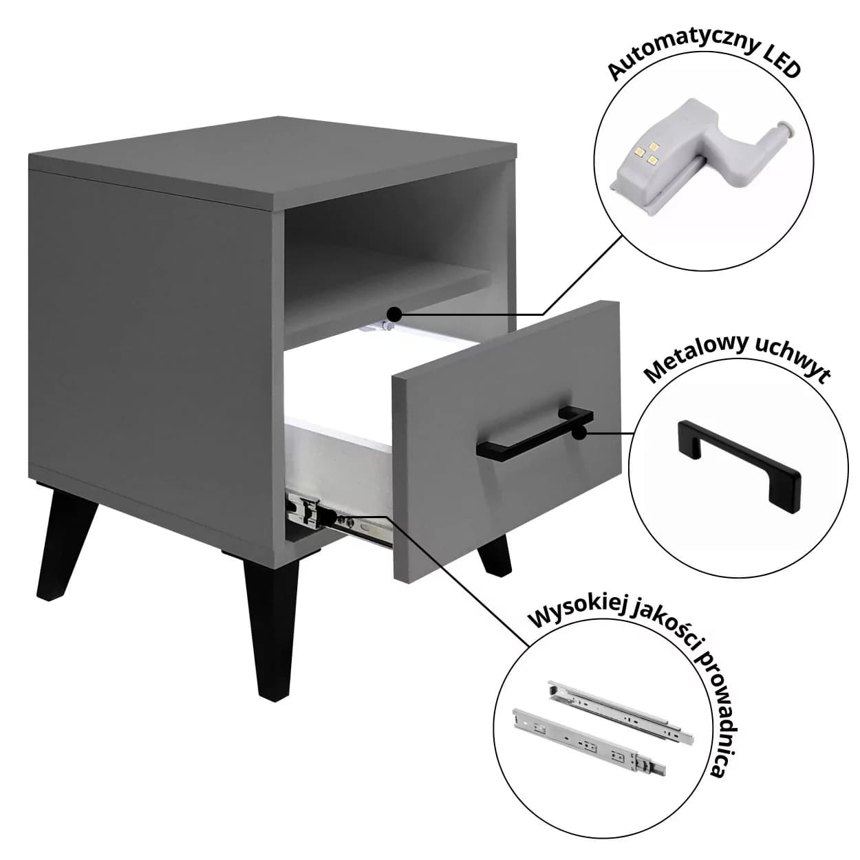 Stolik nocny MODIV VII w kolorze antracytowym to praktyczny i stylowy mebel z pojemną szufladą, półką oraz automatycznym oświetleniem LED. Idealny do nowoczesnych sypialni.