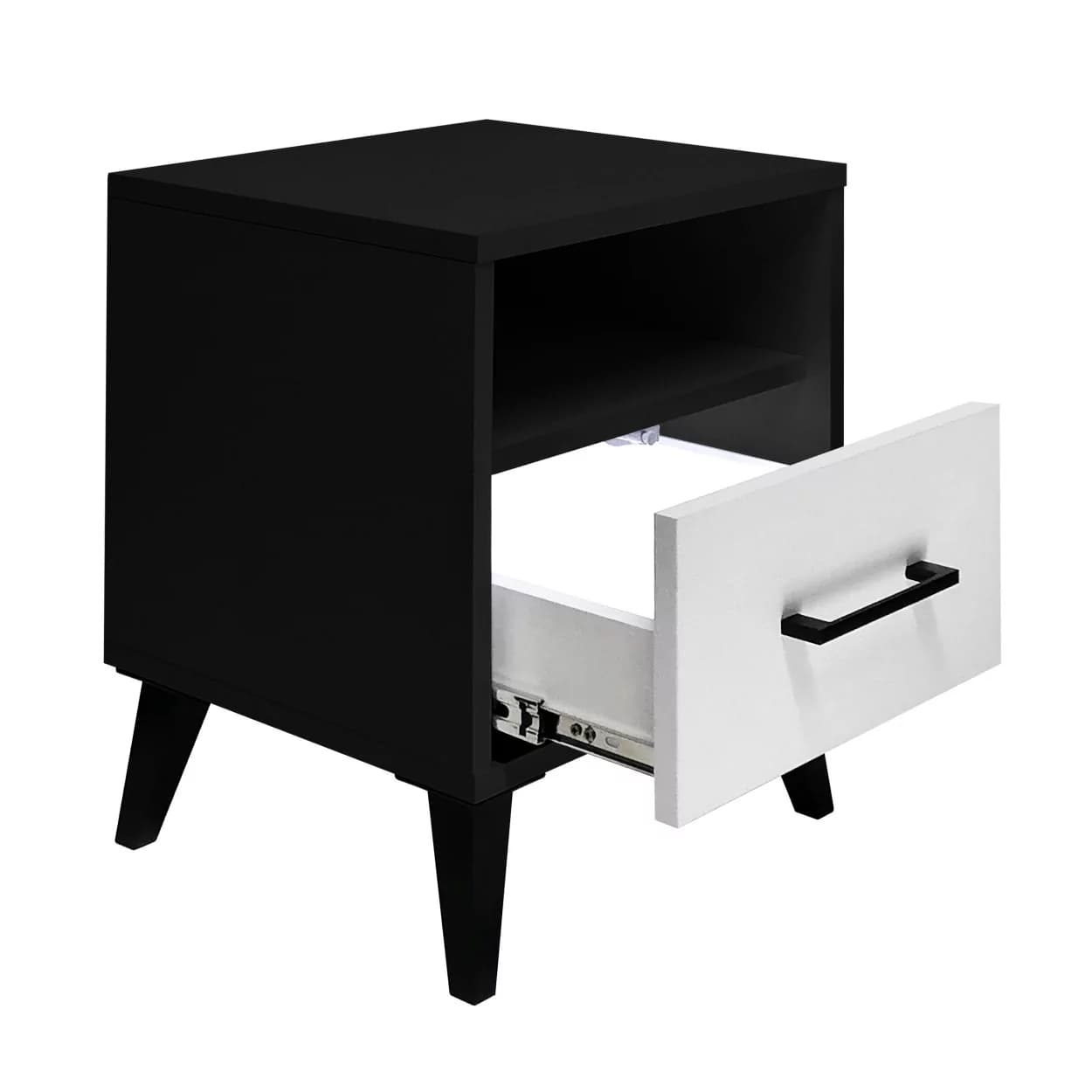 Stolik nocny MODIV X to nowoczesny i funkcjonalny mebel w stylowym połączeniu czerni i bieli. Pojemna szuflada, półka i automatyczne oświetlenie LED zapewniają komfort i praktyczność w sypialni.