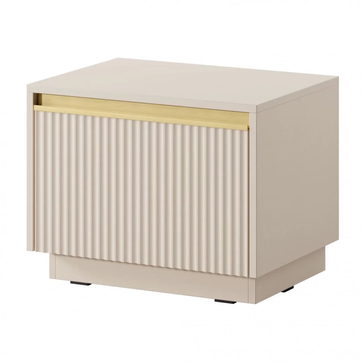 Stolik nocny SHINE w kolorze beż piaskowy zachwyca frezowanym frontem i złotym uchwytem listwowym. Na cokole z pojemną, cichą szufladą — praktyczny i elegancki dodatek do sypialni.