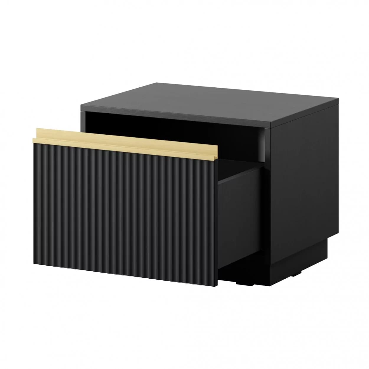 Stolik nocny SHINE w klasycznej czerni z frezowanym frontem i złotym, aluminiowym uchwytem. Elegancki i funkcjonalny.