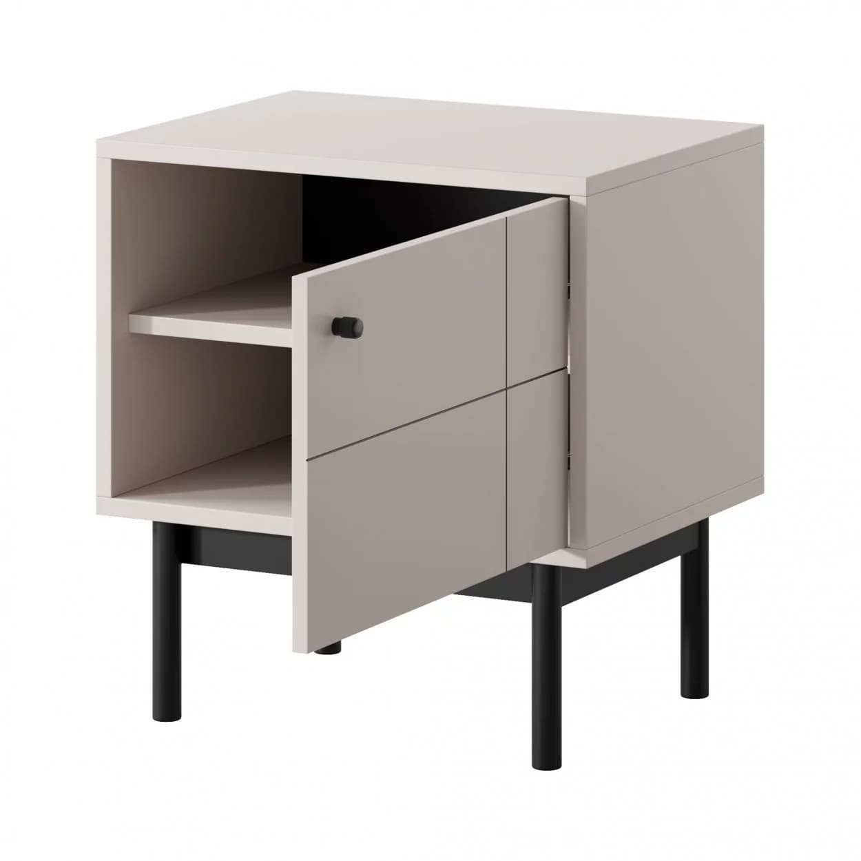 Szafka nocna SCALA w kolorze kaszmiru z drewnianym stelażem, czarnym metalowym uchwytem i dekoracyjnym frezem. Elegancka, stylowa i praktyczna.