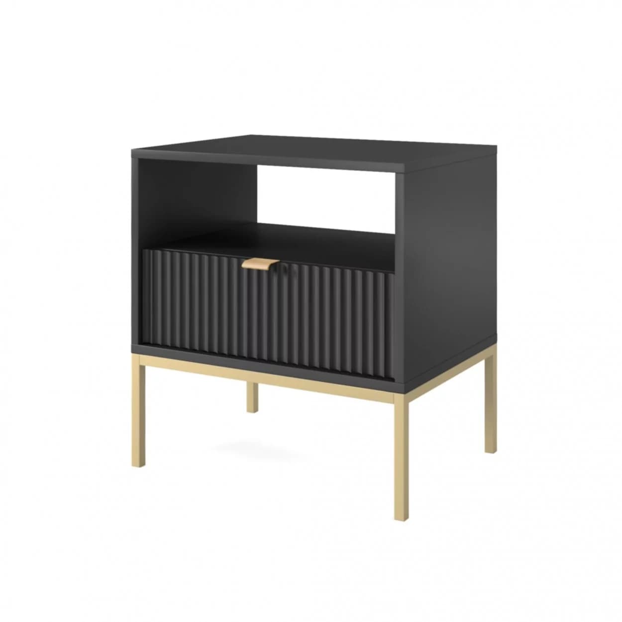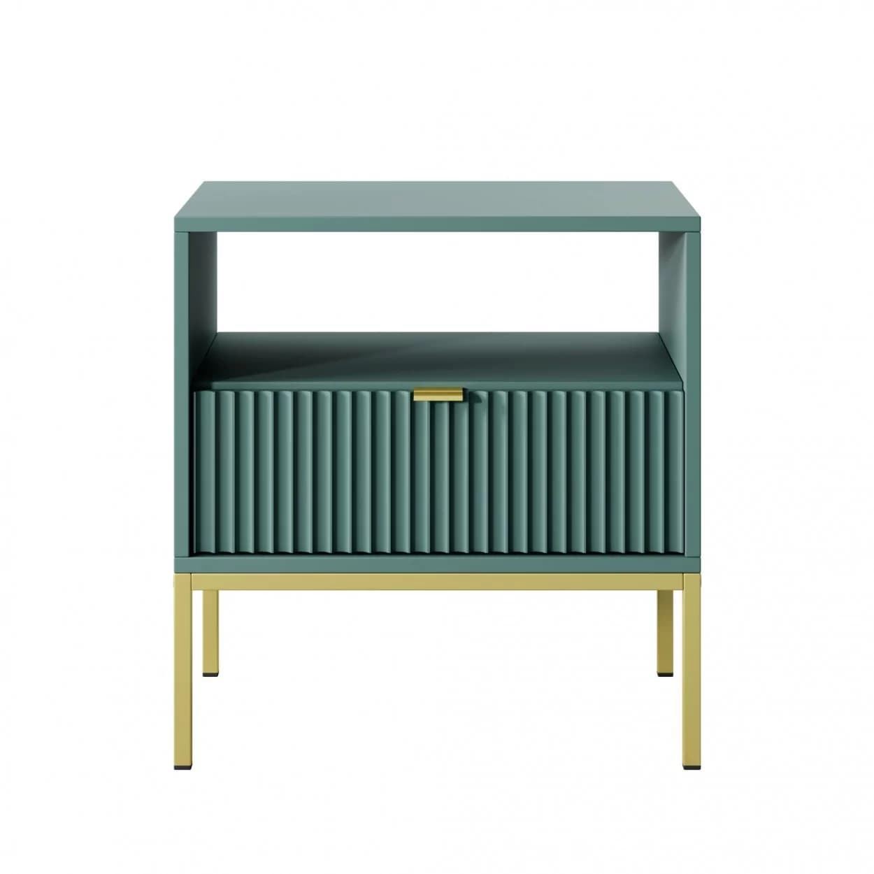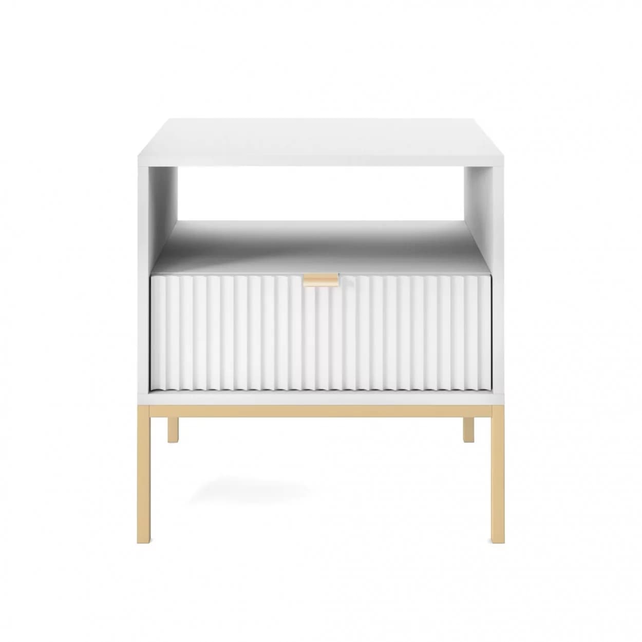 Szafka Nocna VESTA GOLD dostępna w czterech wariantach kolorystycznych, z eleganckimi ryflowanymi frontami i złotym stelażem. Posiada praktyczną szufladę i złote uchwyty, które dodają blasku i szyku.