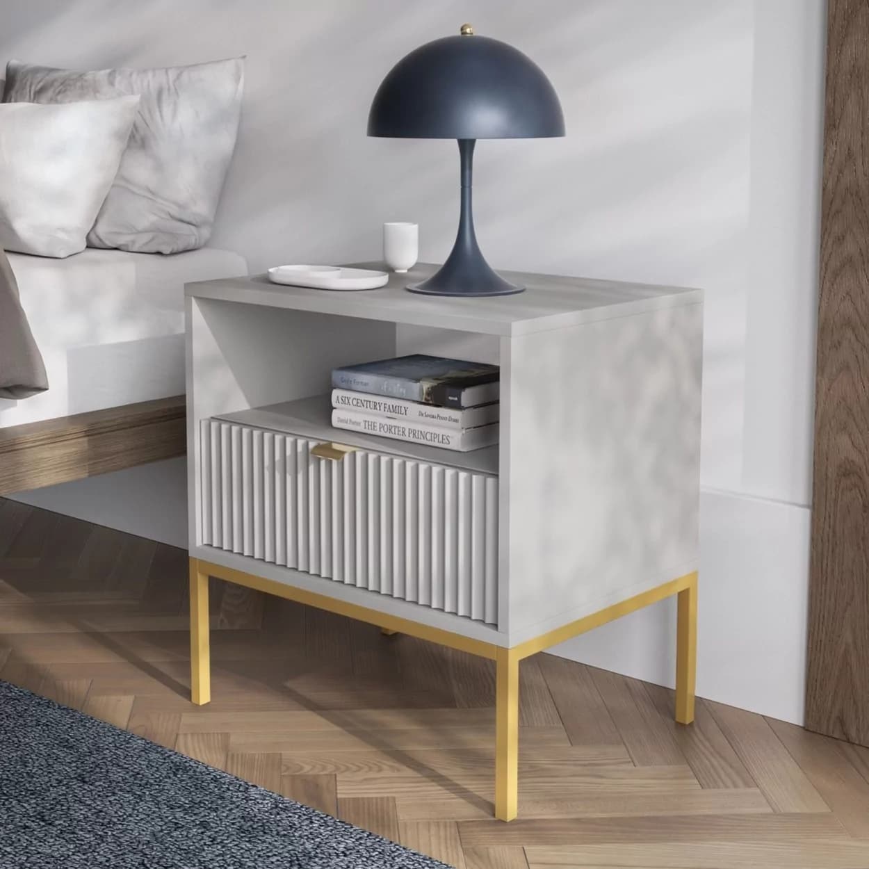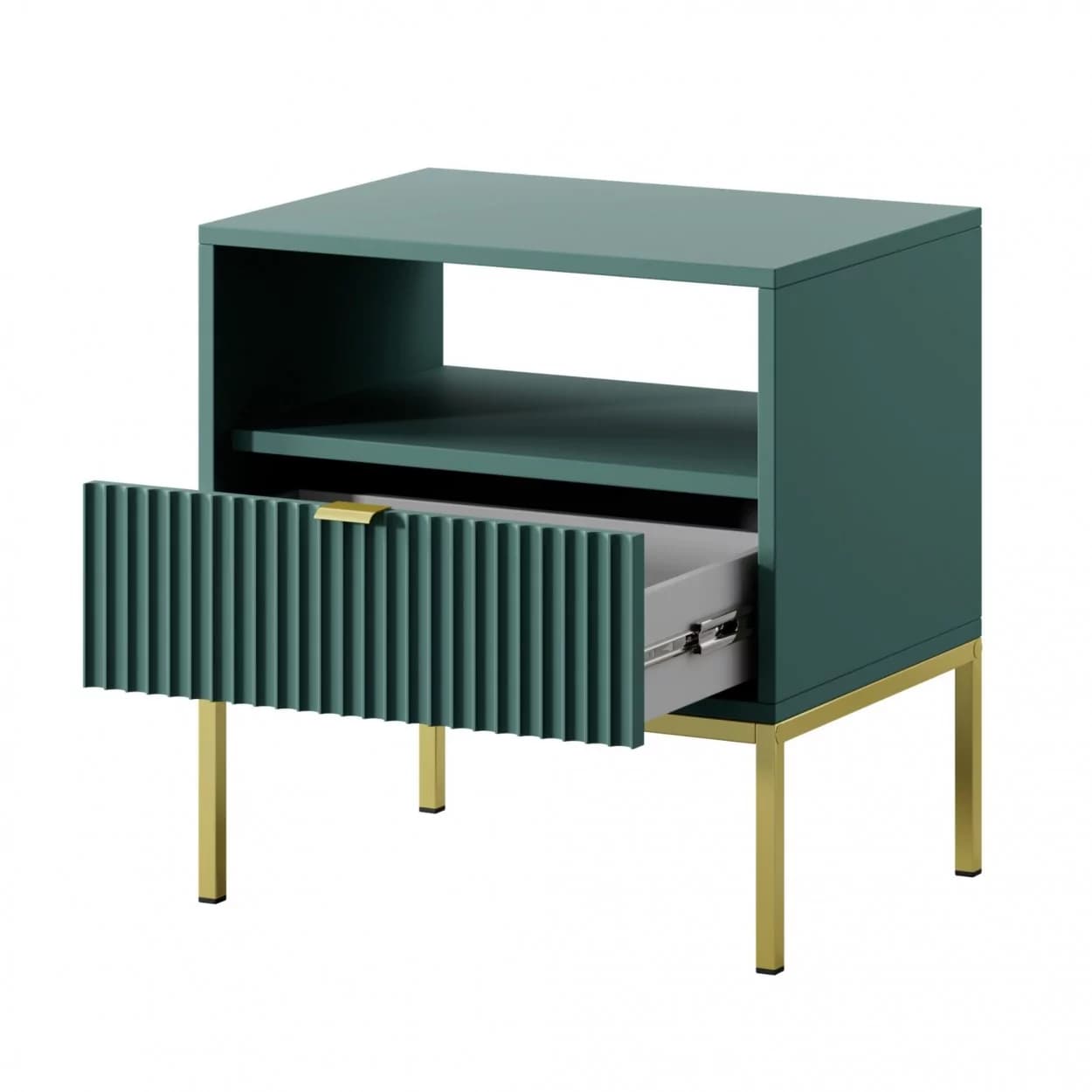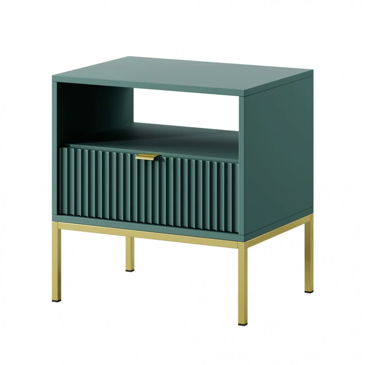 Szafka Nocna VESTA GOLD dostępna w czterech wariantach kolorystycznych, z eleganckimi ryflowanymi frontami i złotym stelażem. Posiada praktyczną szufladę i złote uchwyty, które dodają blasku i szyku.