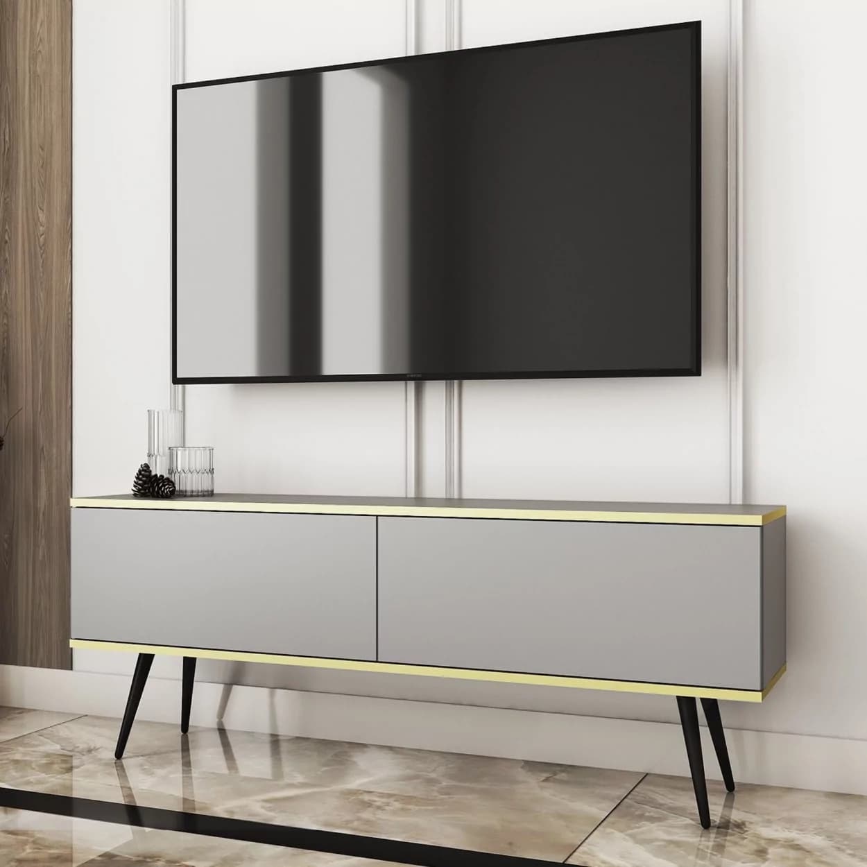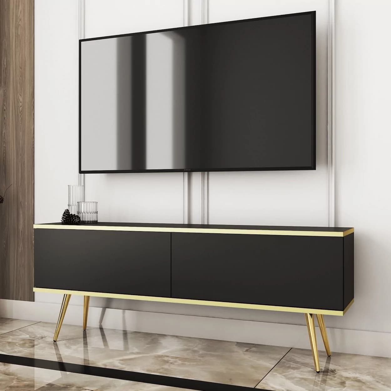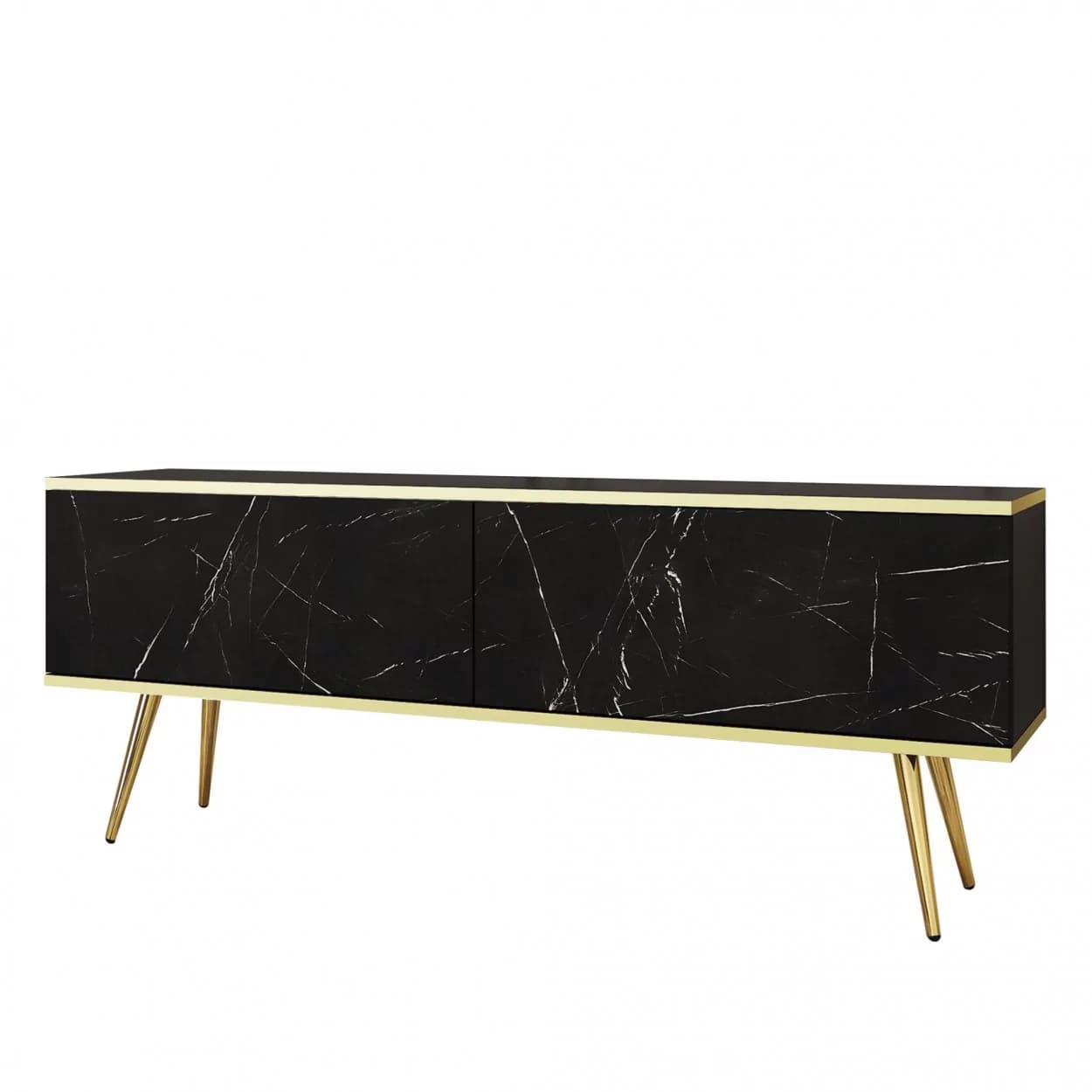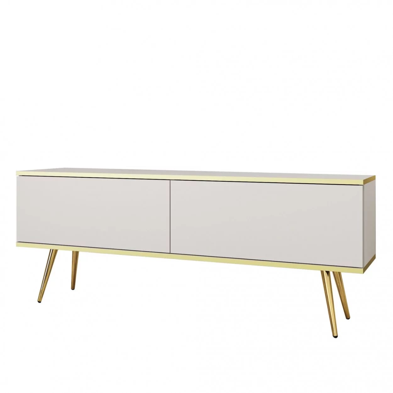 Szafka RTV LORI łączy nowoczesny design z funkcjonalnością. Dostępna w pięciu kolorach: czarnym, białym, beżowym, szarym i marmurze, z opcją złotych lub czarnych nóżek. Eleganckie złote listwy oraz bezuchwytowy system otwierania z matowym frontem opadającym do dołu zapewniają wygodę i styl. Idealna do nowoczesnych salonów, łącząc estetykę z praktycznymi rozwiązaniami.