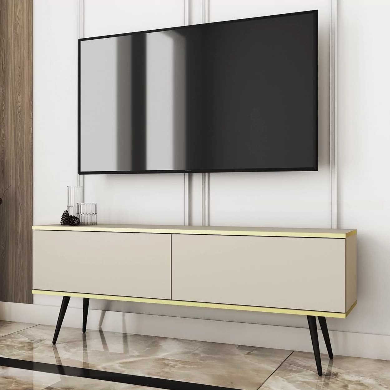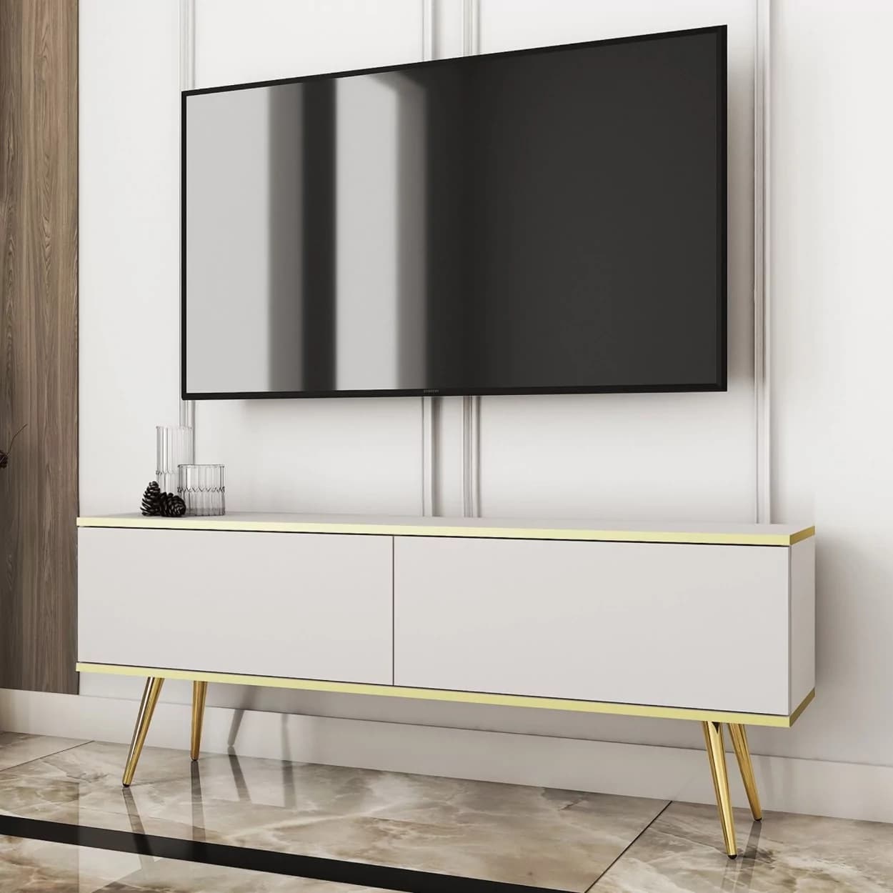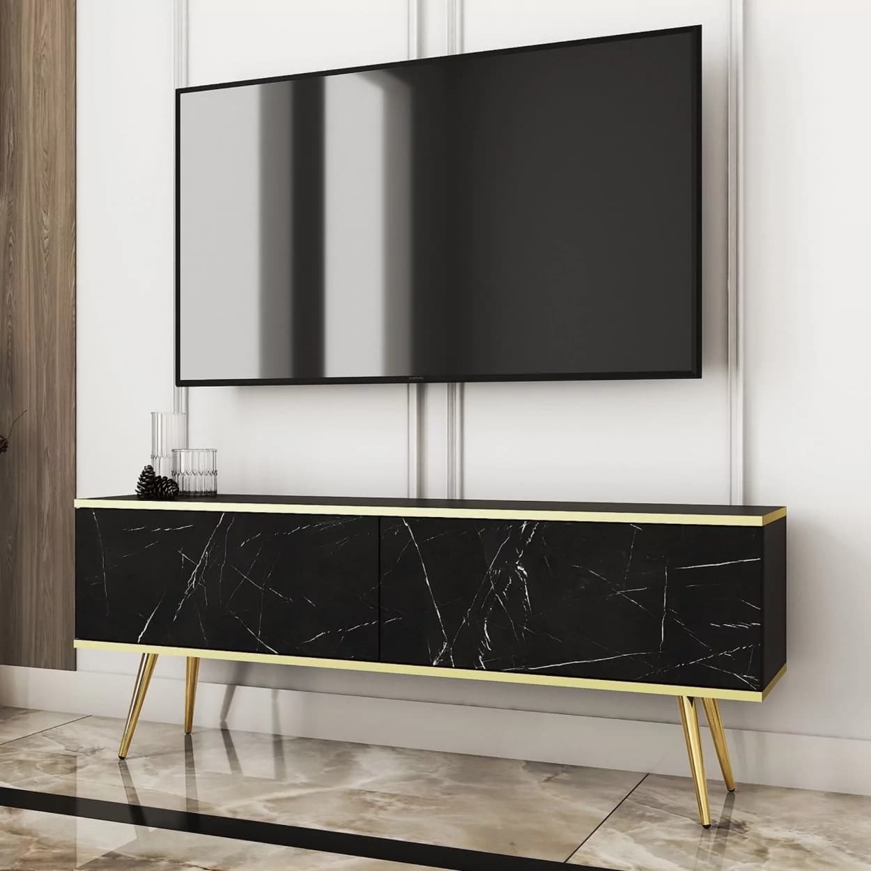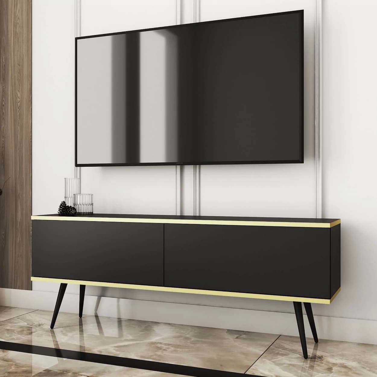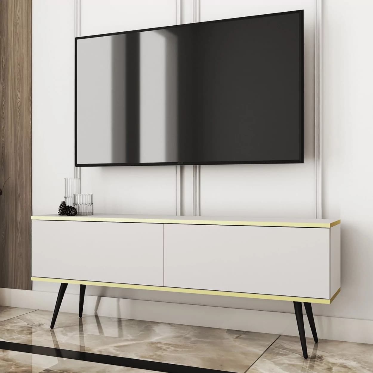 Szafka RTV LORI łączy nowoczesny design z funkcjonalnością. Dostępna w pięciu kolorach: czarnym, białym, beżowym, szarym i marmurze, z opcją złotych lub czarnych nóżek. Eleganckie złote listwy oraz bezuchwytowy system otwierania z matowym frontem opadającym do dołu zapewniają wygodę i styl. Idealna do nowoczesnych salonów, łącząc estetykę z praktycznymi rozwiązaniami.