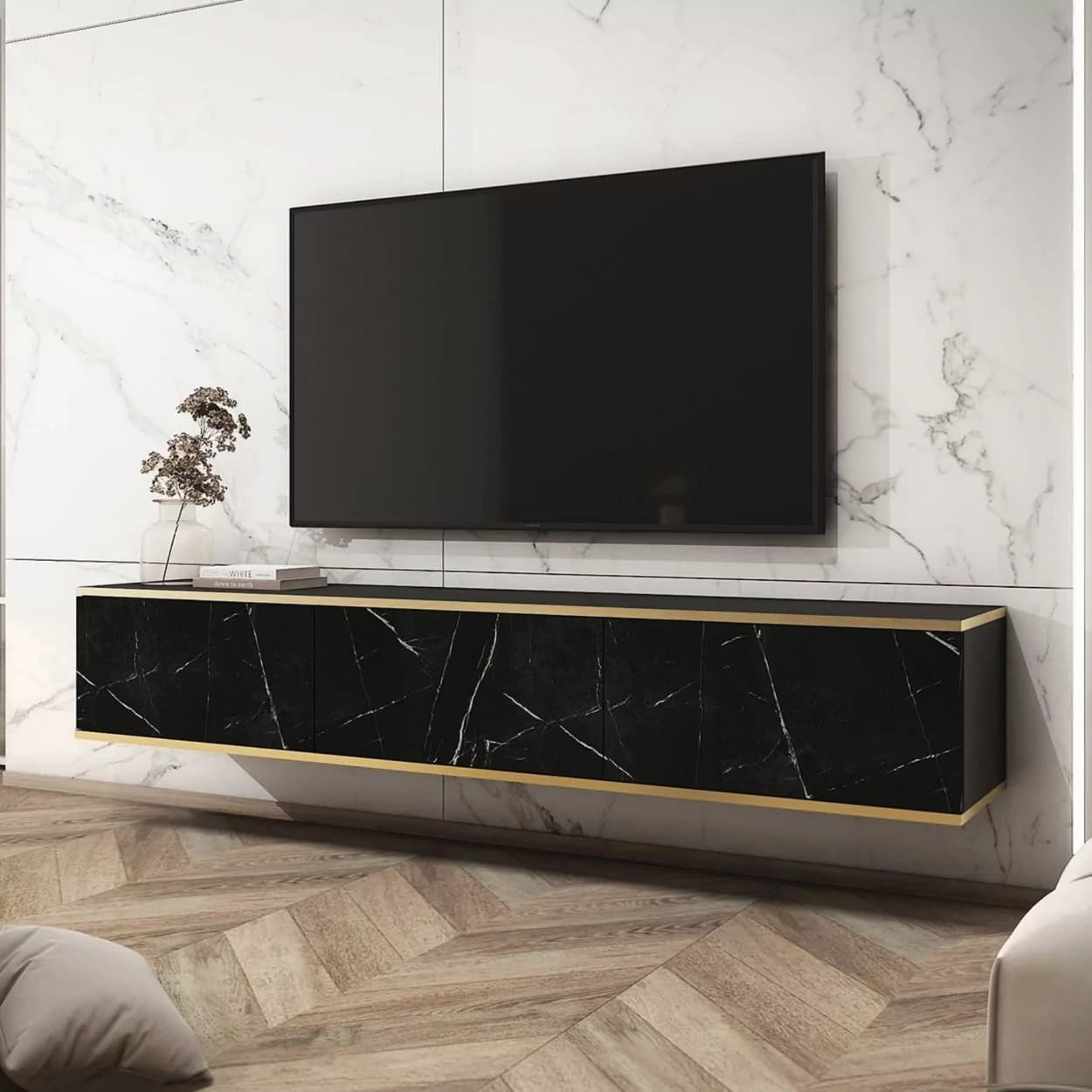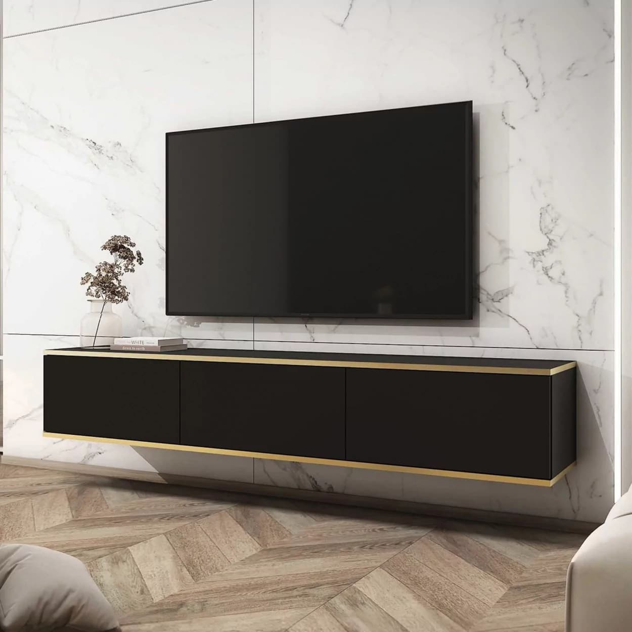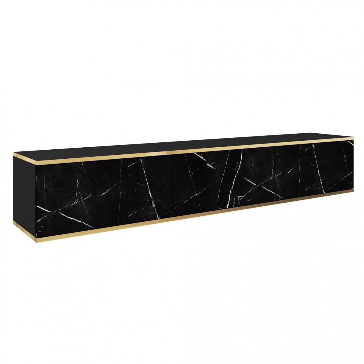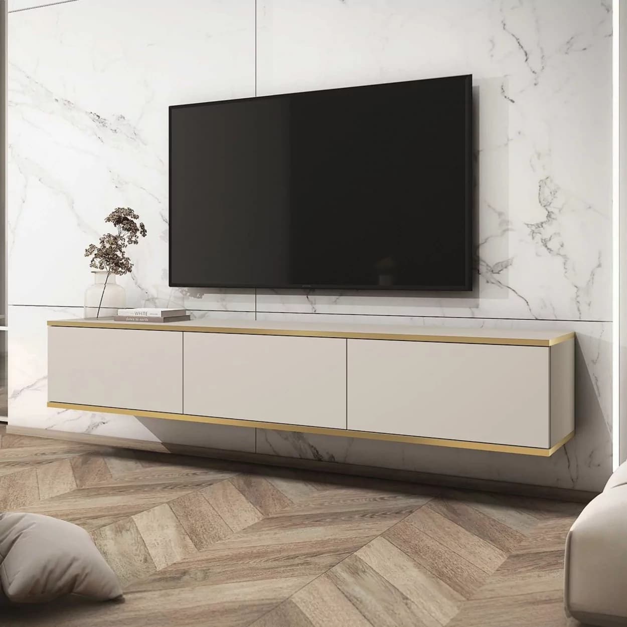 Szafka RTV OLYMP XL (175 cm) dostępna w pięciu kolorach: czarnym, białym, beżowym, marmurowym i szarym. Nowoczesny, podwieszany mebel z bezuchwytowym frontem i eleganckimi złotymi listwami. Styl i funkcjonalność w jednym!