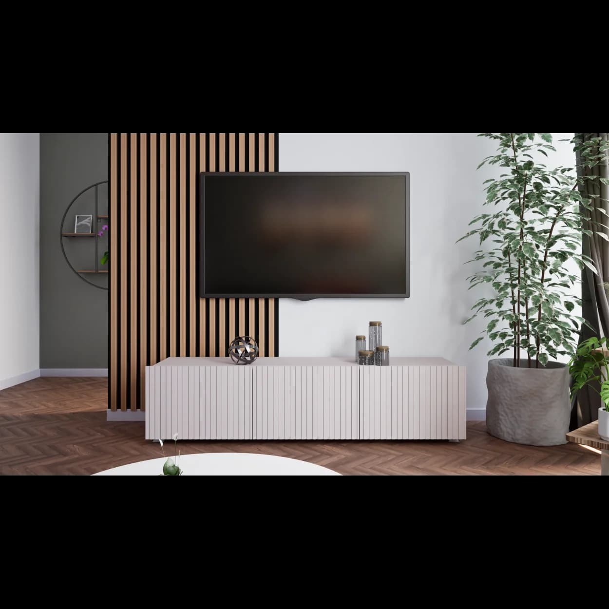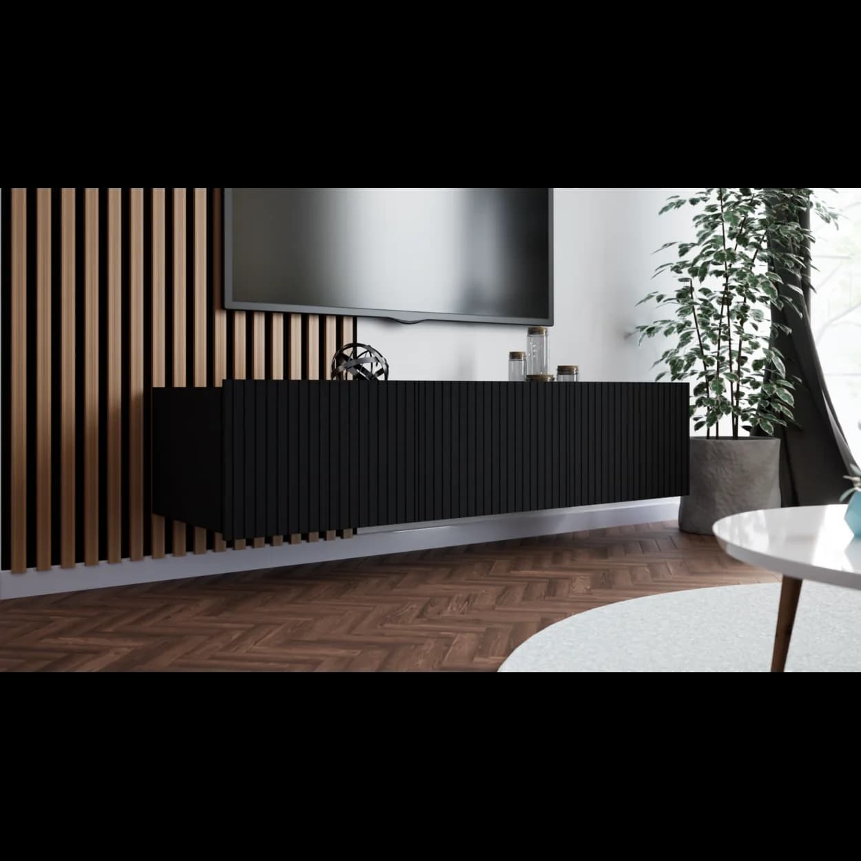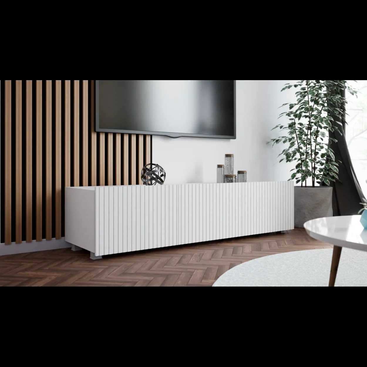RYFLO 150 to większa wersja nowoczesnej szafki RTV z charakterystycznymi ryflowanymi frontami. Dostępna w trzech stylowych kolorach: biały mat, kaszmir i czarny mat. Może być montowana jako mebel stojący lub wiszący, zapewniając elastyczność aranżacyjną.