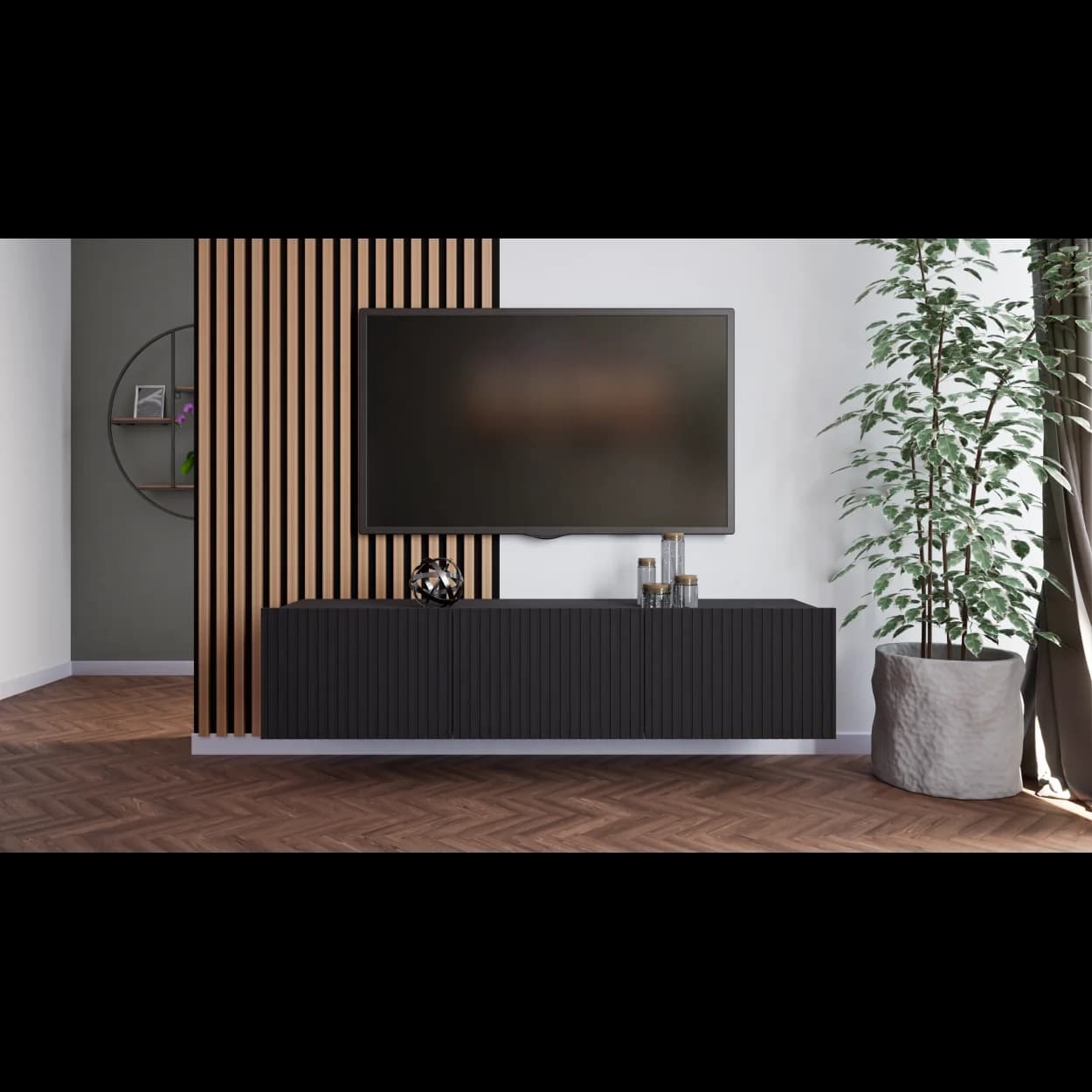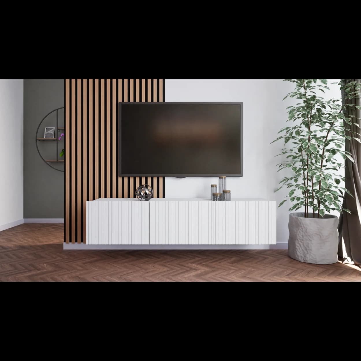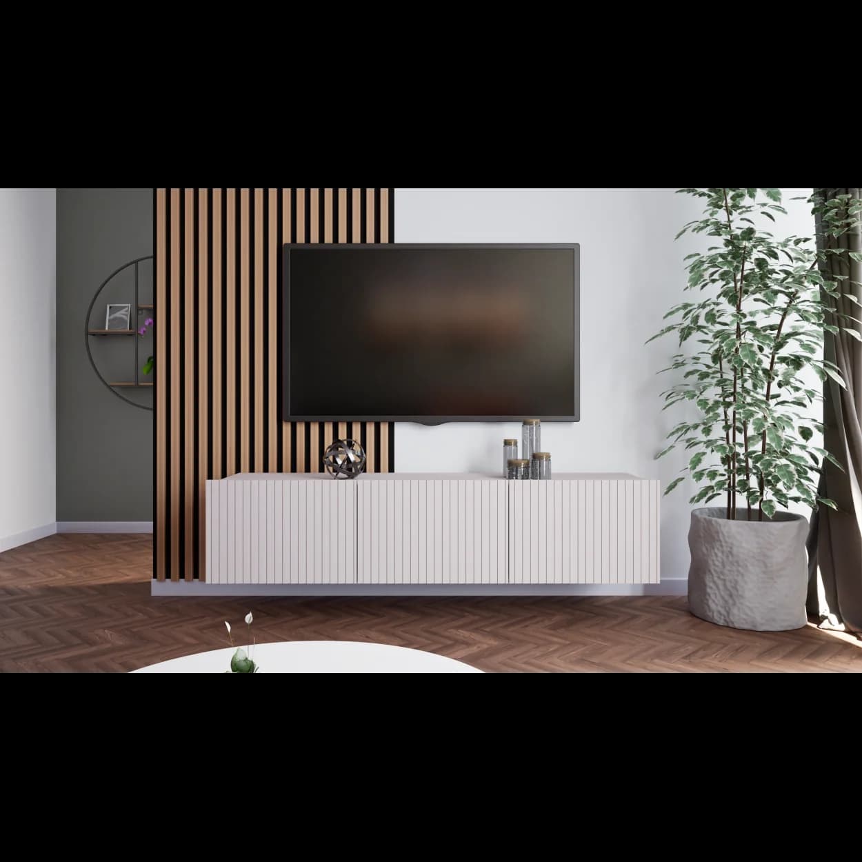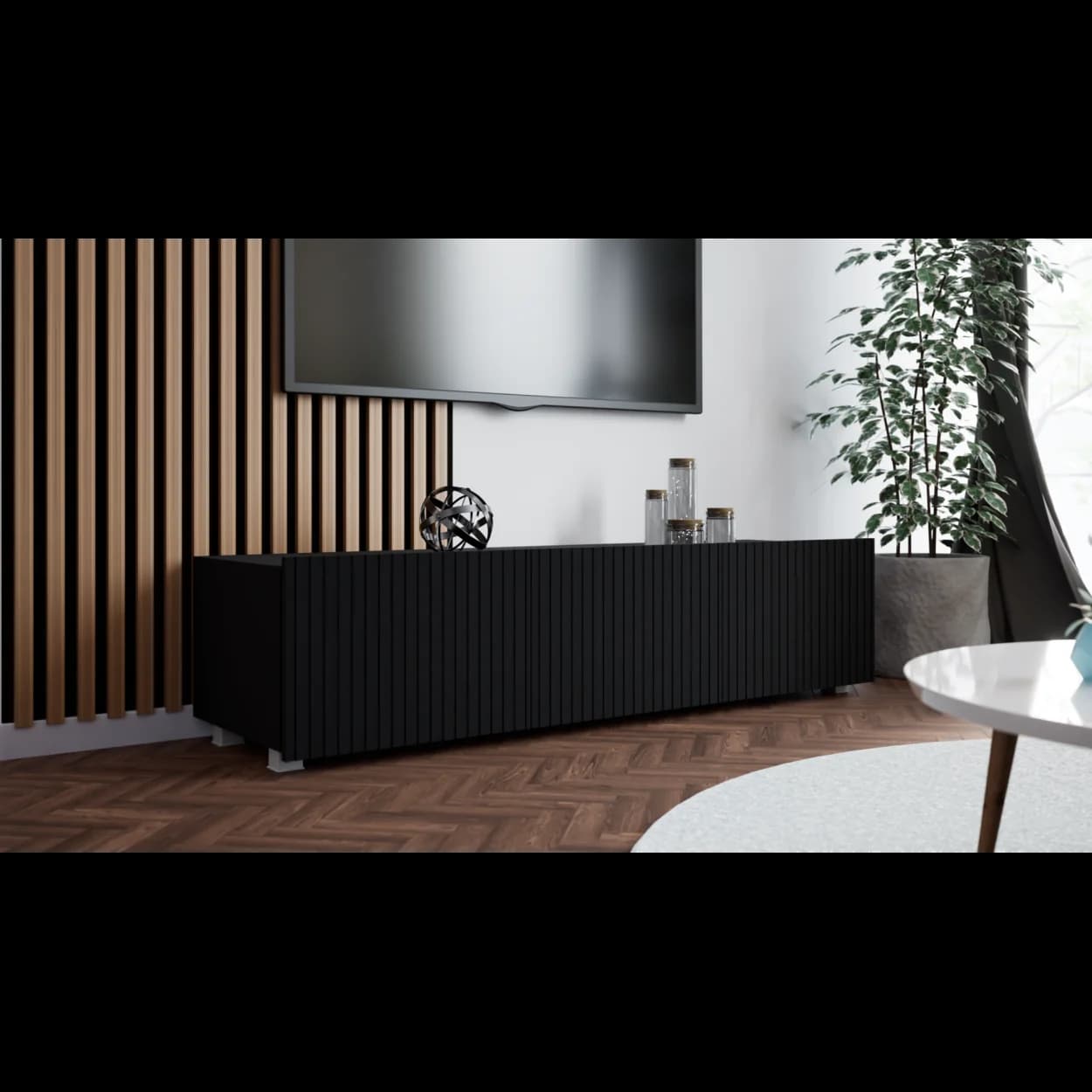 RYFLO 150 to większa wersja nowoczesnej szafki RTV z charakterystycznymi ryflowanymi frontami. Dostępna w trzech stylowych kolorach: biały mat, kaszmir i czarny mat. Może być montowana jako mebel stojący lub wiszący, zapewniając elastyczność aranżacyjną.
