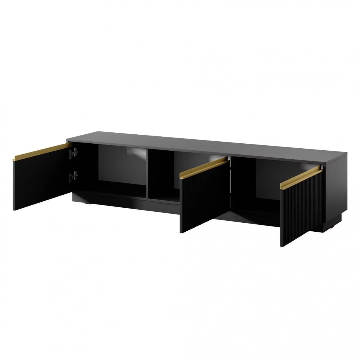 Szafka RTV SHINE w klasycznej czerni z frezowanym frontem i złotymi uchwytami. Trzydrzwiowa, z cichym domykiem – elegancka i funkcjonalna.