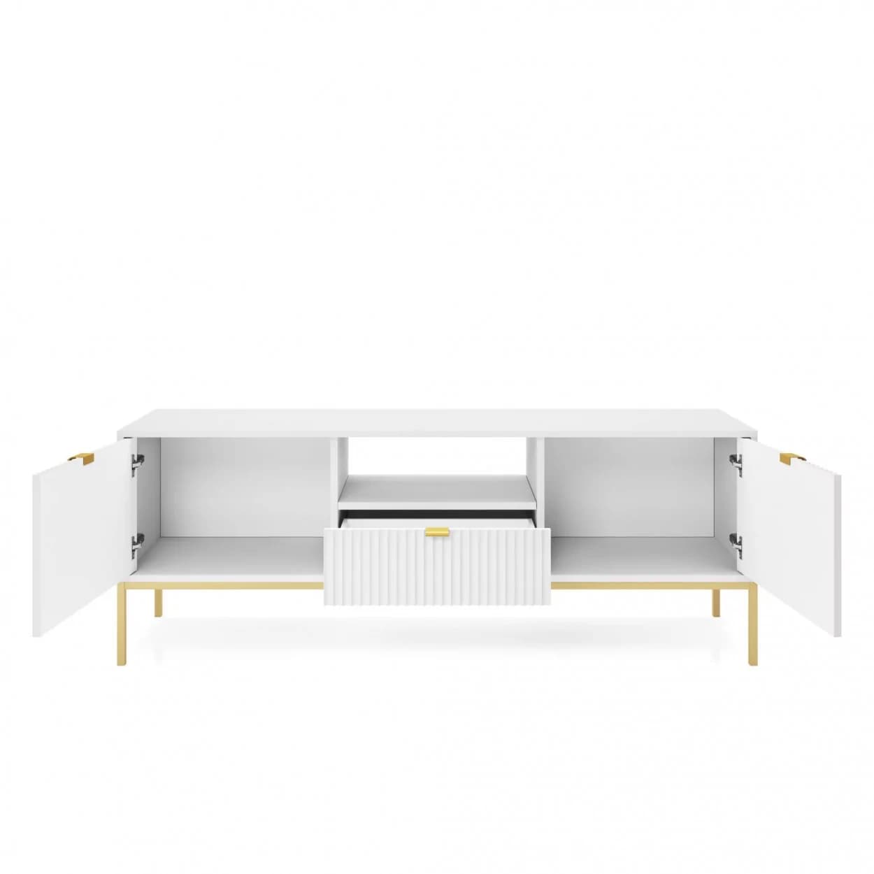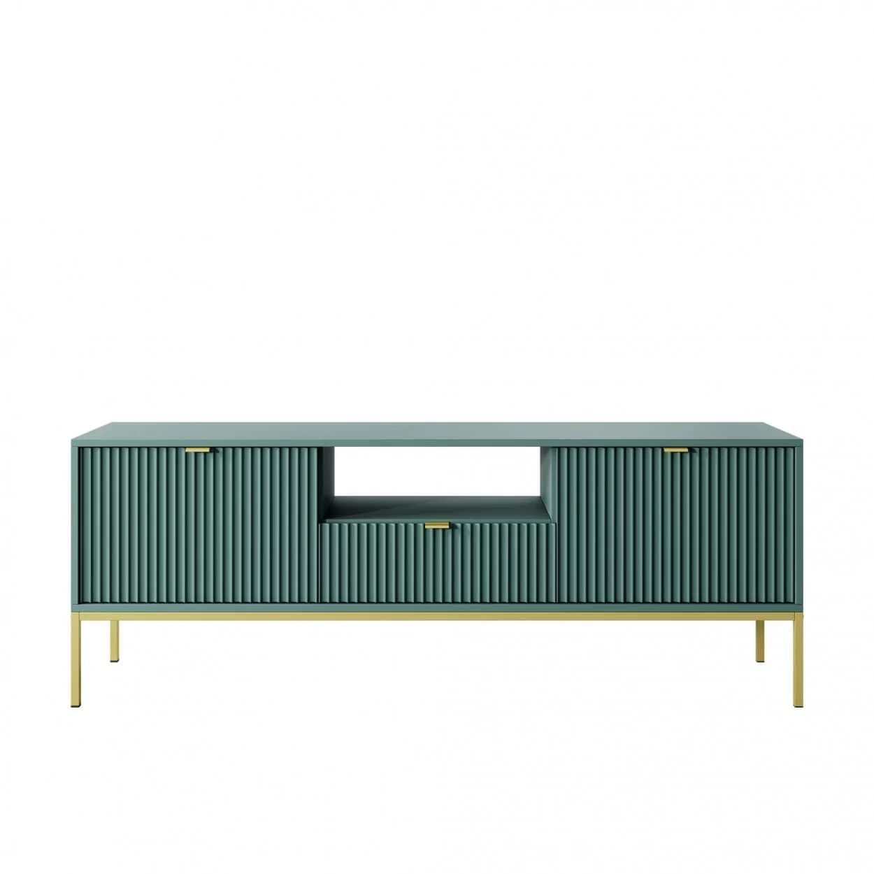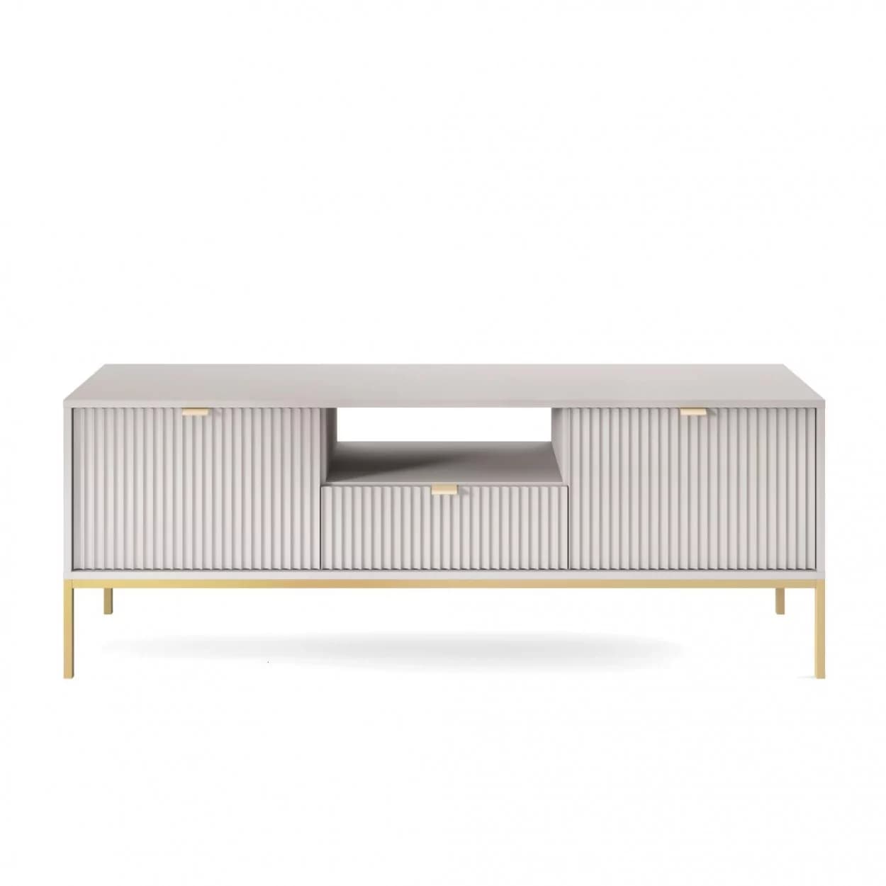 Szafka RTV VESTA GOLD dostępna w czterech wariantach kolorystycznych łączy eleganckie ryflowane fronty z nowoczesnym designem. Osadzona na złotym stelażu, wyposażona w środkową szufladę i złote uchwyty, łączy styl i funkcjonalność.
