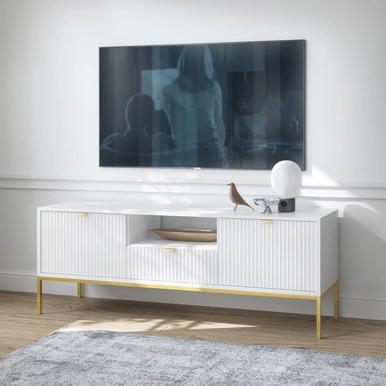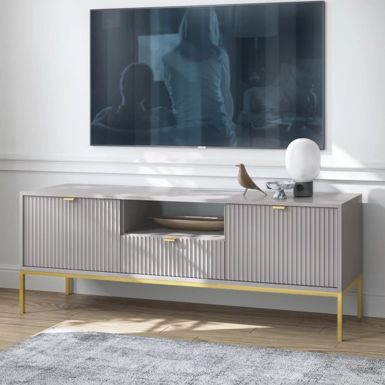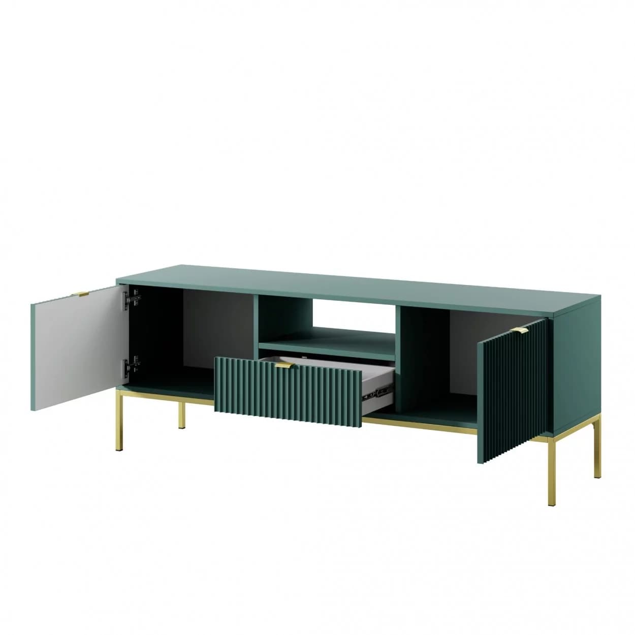 Szafka RTV VESTA GOLD dostępna w czterech wariantach kolorystycznych łączy eleganckie ryflowane fronty z nowoczesnym designem. Osadzona na złotym stelażu, wyposażona w środkową szufladę i złote uchwyty, łączy styl i funkcjonalność.