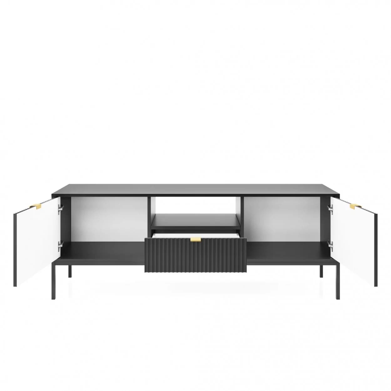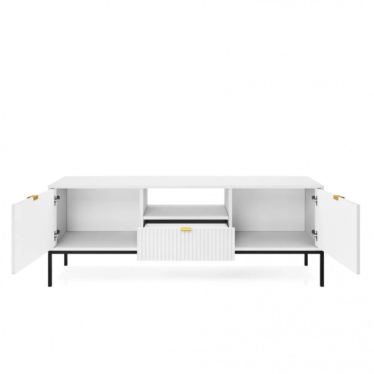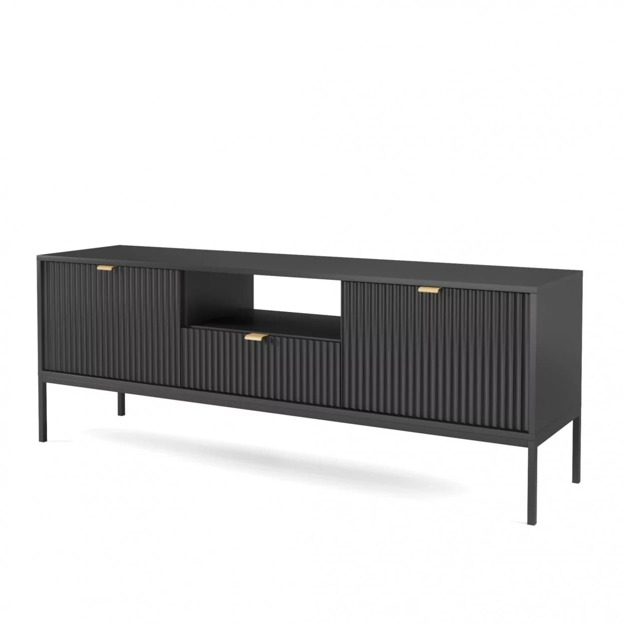 Szafka RTV VESTA dostępna w czterech wariantach kolorystycznych, wyróżnia się charakterystycznymi, ryflowanymi frontami oraz solidnym metalowym stelażem. Wyposażona w przestronne szafki, łączy nowoczesny design z funkcjonalnością.