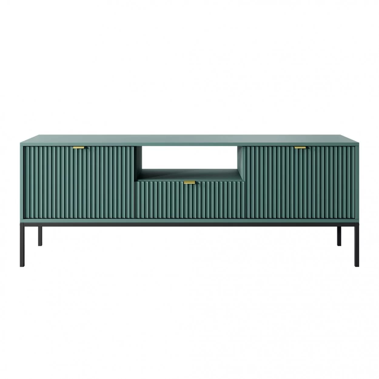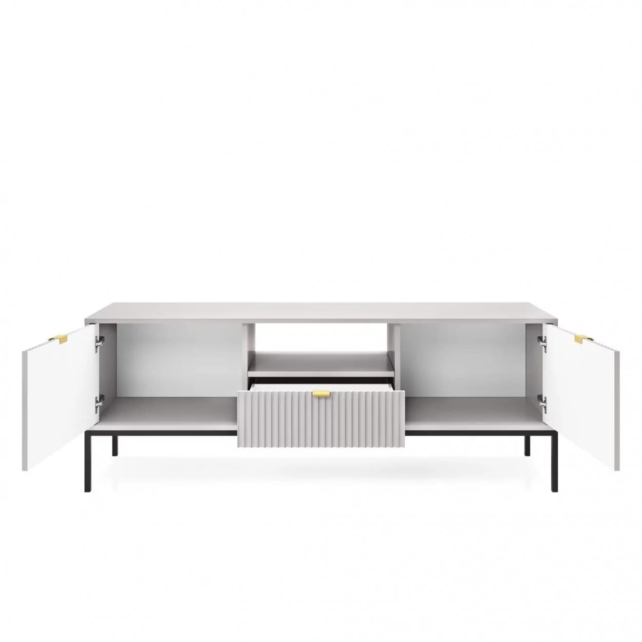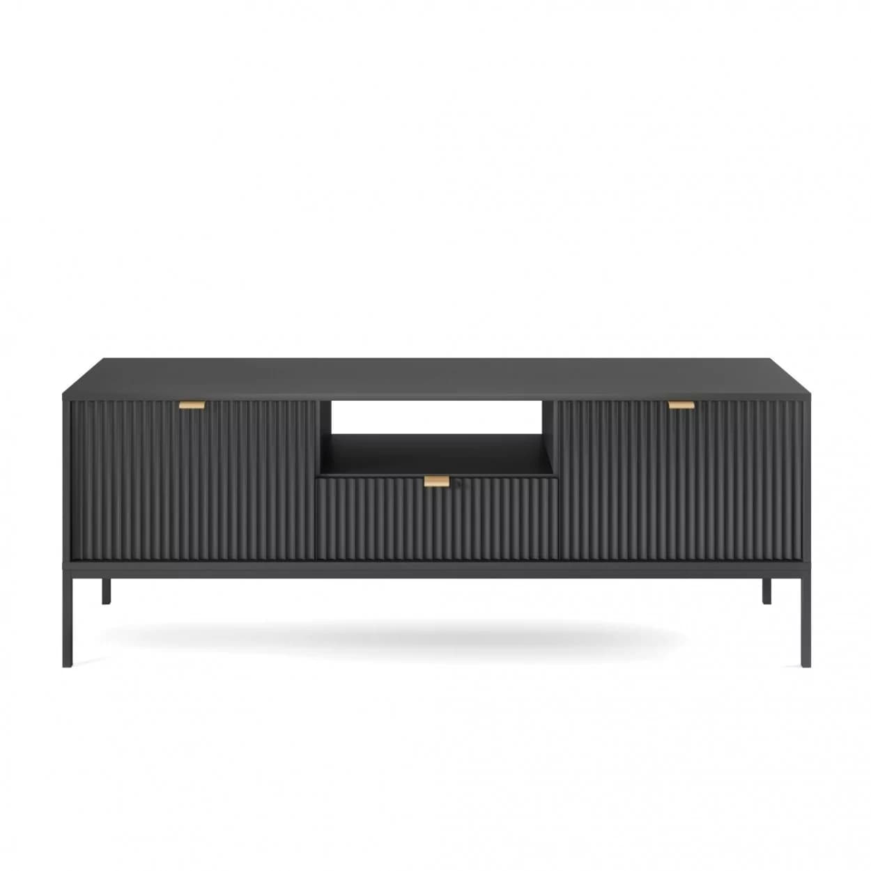 Szafka RTV VESTA dostępna w czterech wariantach kolorystycznych, wyróżnia się charakterystycznymi, ryflowanymi frontami oraz solidnym metalowym stelażem. Wyposażona w przestronne szafki, łączy nowoczesny design z funkcjonalnością.